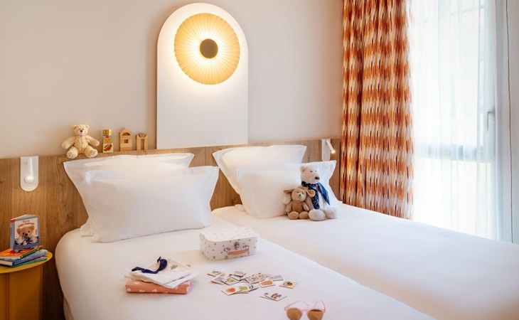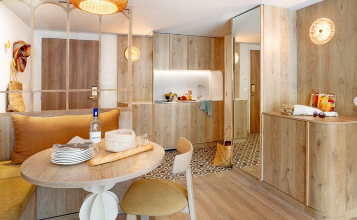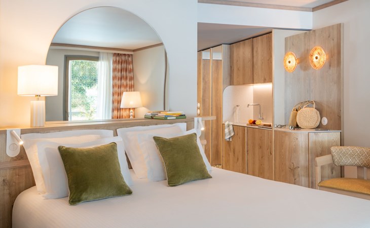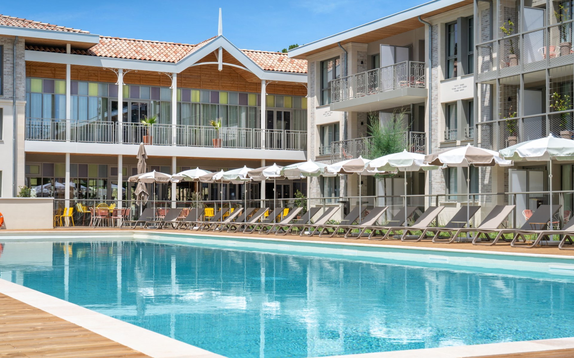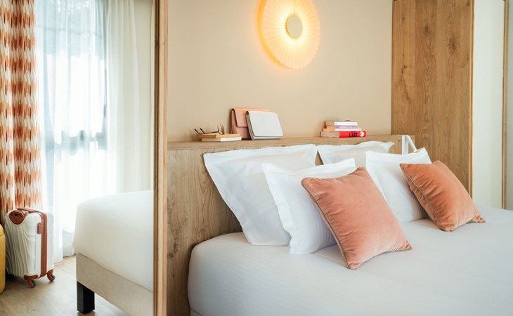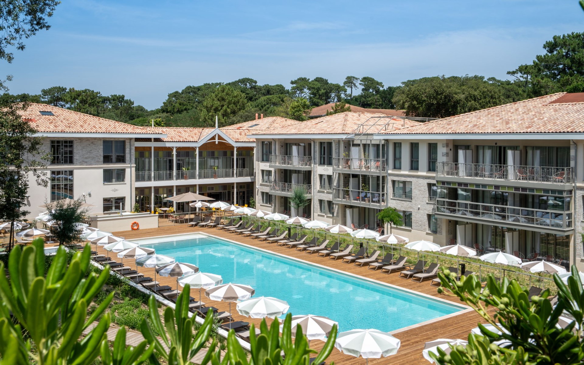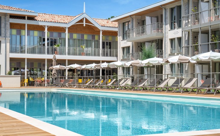 Very beautiful aparthotel "La Résidence", 3 storeys, built in 2025. On the outskirts, 3 km from the centre of Arcachon, in the residential district, 10 m from the edge of the forest, 100 m from the sea, 100 m from the beach. For shared use: park 6'290 m2 (fenced), swimming pool heated (28 x 7 m, depth 100 - 150 cm, seasonal availability: 01.Apr. - 30.Oct.) with shutter cover. WC in the pool area. In the house: reception, restaurant, bar, breakfast room, fitness room, bicycle rental. Room cleaning daily on request (extra). Parking (extra). Shop 3 km, restaurant, bus stop 50 m, sandy beach "Pereire" 100 m. Golf course (18 hole) 3 km, tennis 200 m, cycle lane 100 m. Nearby attractions: Arcachon 3 km, Bordeaux 75 km. Hiking paths: Dune du Pilat 7 km. Please note: baby equipment on request (included). The photograph shows a typical example.