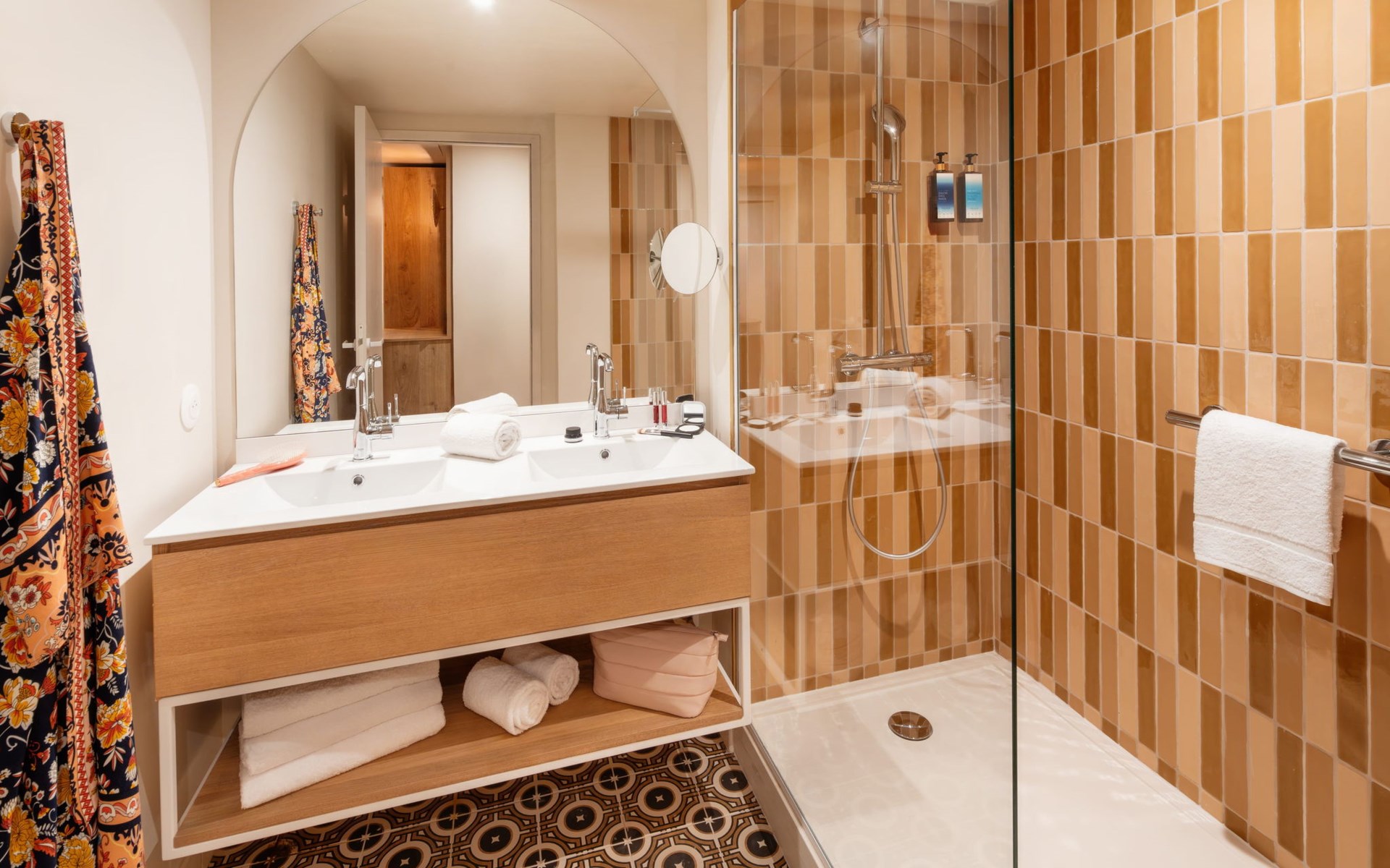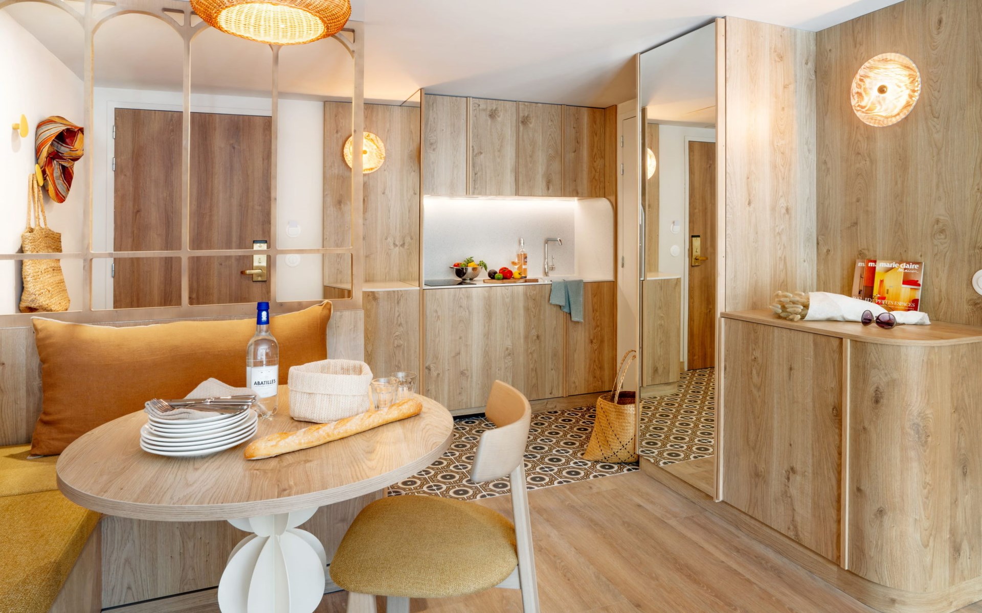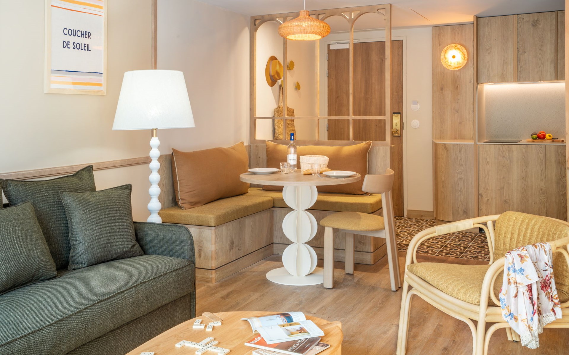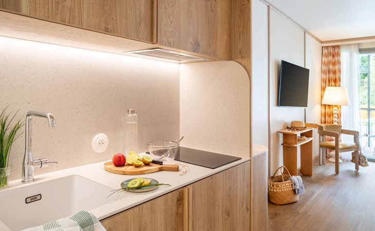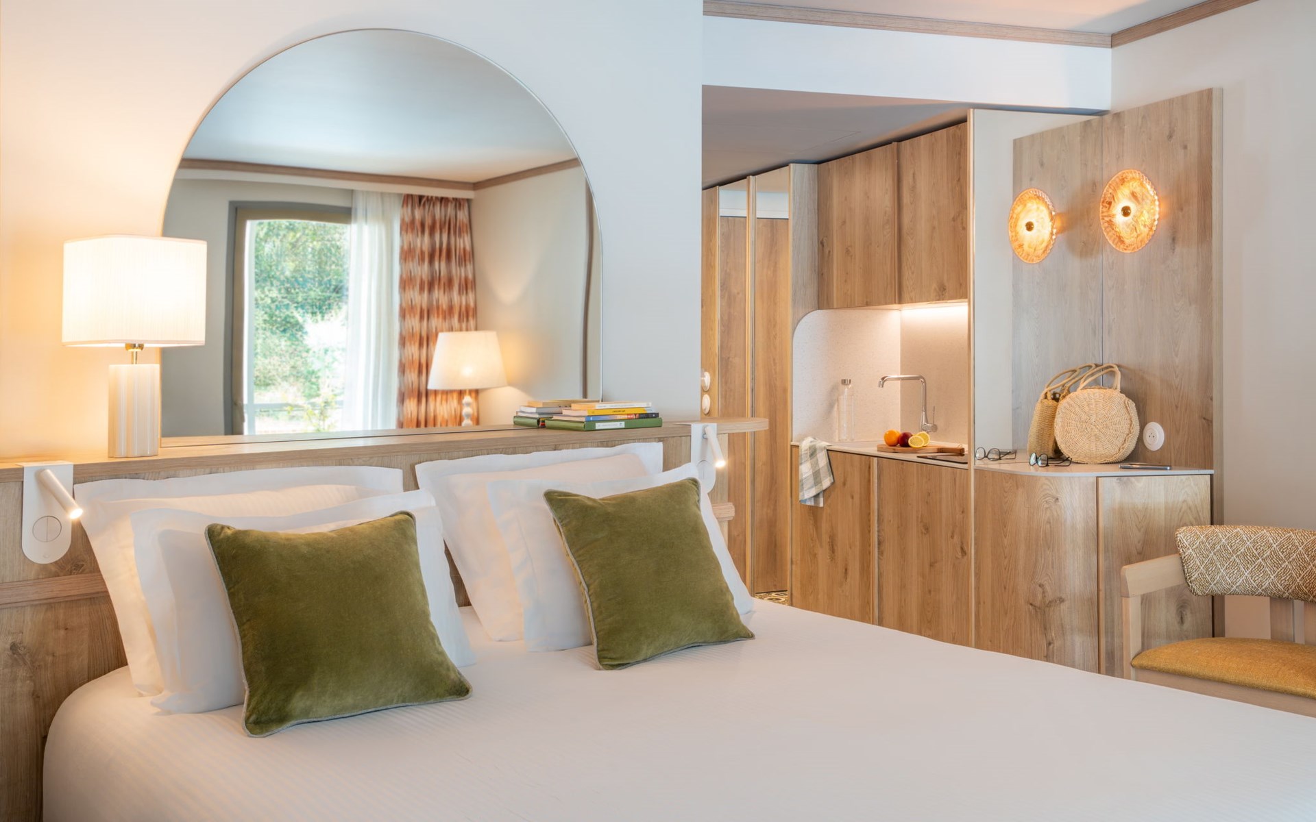 Very beautiful aparthotel "La Résidence", 3 storeys, built in 2025. On the outskirts, 3 km from the centre of Arcachon, in the residential district, 10 m from the edge of the forest, 100 m from the sea, 100 m from the beach. For shared use: park 6'290 m2 (fenced), swimming pool heated (28 x 7 m, depth 100 - 150 cm, seasonal availability: 01.Apr. - 30.Oct.) with shutter cover. WC in the pool area. In the house: reception, restaurant, bar, breakfast room, fitness room, bicycle rental. Room cleaning daily on request (extra). Parking (extra). Shop 3 km, restaurant, bus stop 50 m, sandy beach "Pereire" 100 m. Golf course (18 hole) 3 km, tennis 200 m, cycle lane 100 m. Nearby attractions: Arcachon 3 km, Bordeaux 75 km. Hiking paths: Dune du Pilat 7 km. Please note: baby equipment on request (included). The photograph shows a typical example.