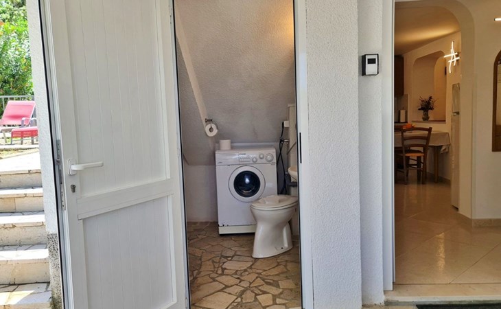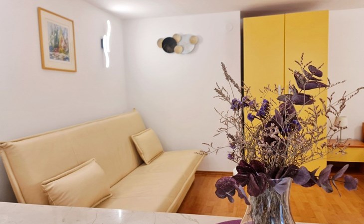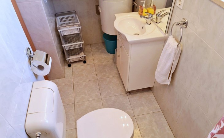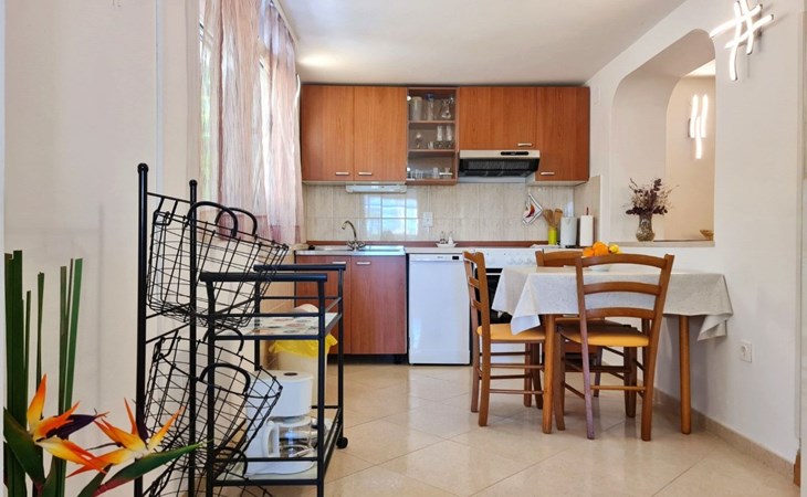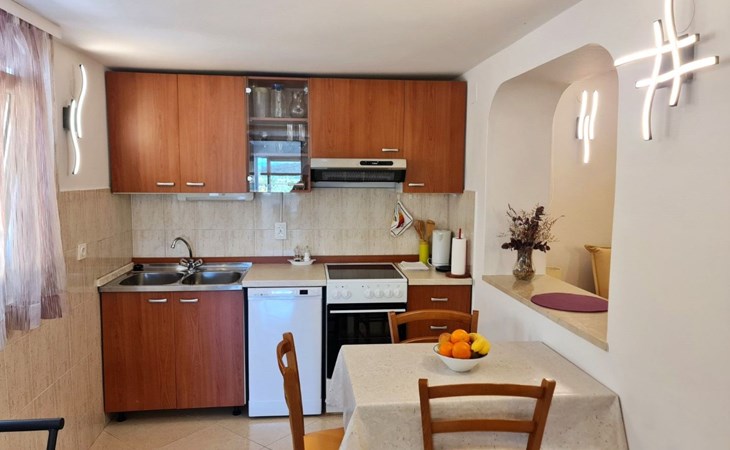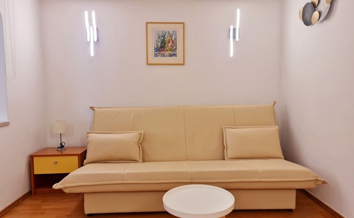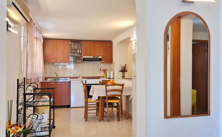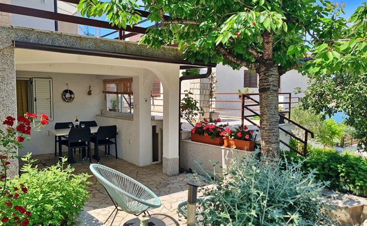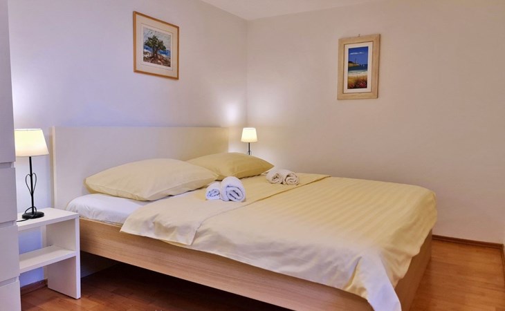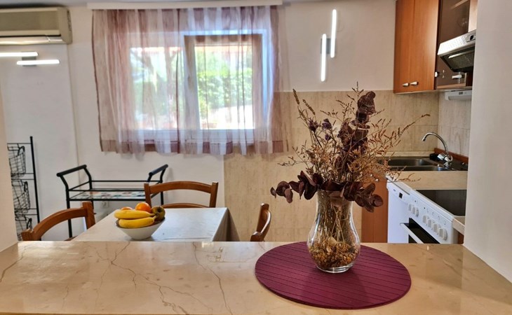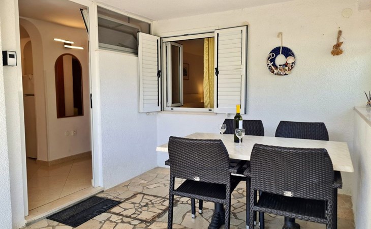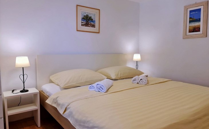 This one-bedroom apartment (50 m2, ***) is located merely 40 m from the beach. The terrace (8 m2) offers relaxation in the hot summer days. There is also a possibility to barbecue. Wi-Fi and air conditioning are already included in the price. The apartment has one bedroom with a double bed, as well as a convertible sofa bed in living room for 2 additional persons. There is also a outdoor shower that you can use.