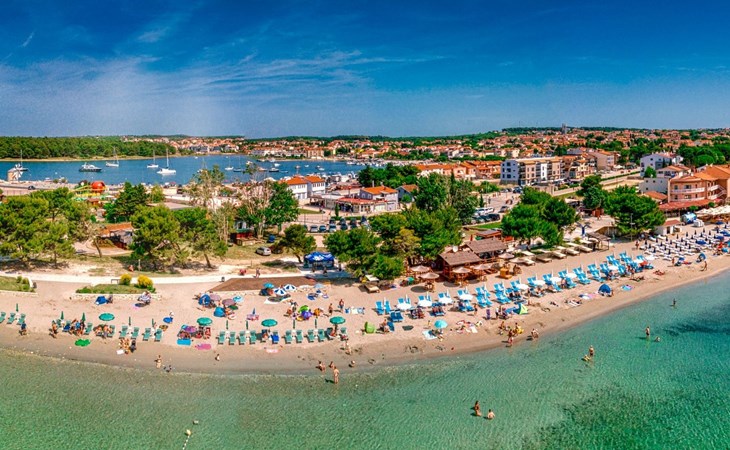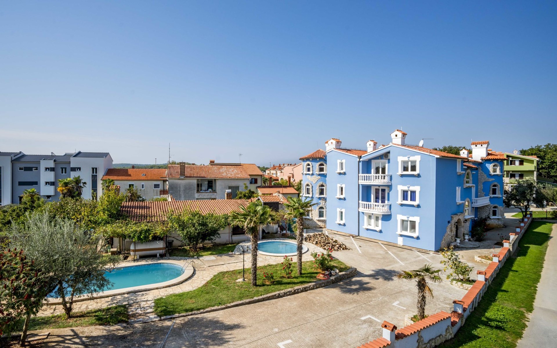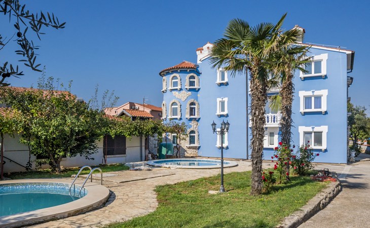 Beautiful apartment house "Hilde Blue". 300 m from the centre of Medulin, in a sunny position, 100 m from the sea, 350 m from the beach. For shared use: property, garden with lawn, swimming pool angular (11 x 6 m, depth 140 cm, seasonal availability: 01.Jun. - 14.Sep.). Children's pool, barbecue. In the house: washing machine (extra) (for shared use). Parking at the house on the premises. Shop, restaurant 100 m, bus stop 260 m, sandy beach 500 m, rocky beach 350 m. Surf school 2 km. Nearby attractions: adventure park 2 km. Please note: Additional accommodations can be booked. Property ref. HR2700.101 is situated on the same property. For shared use: swimming pool oval shaped (25 m2, depth 140 cm, 01.06.-14.09.). Children's pool round (4 m diameter, depth 40 cm, 01.06.-14.09.).