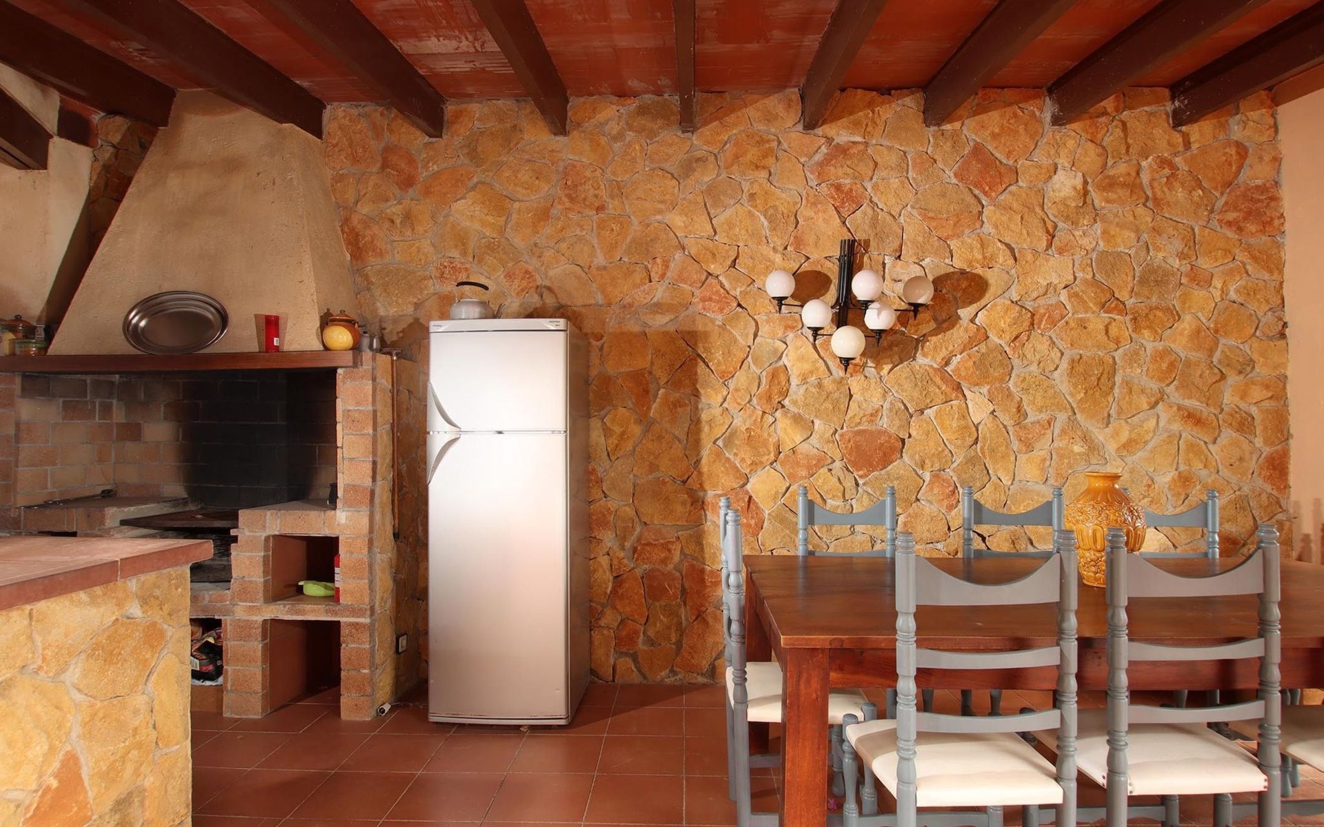 The main entrance, situated under a covered front terrace gives access to a small lounge with sofas and a Smart TV, from this area we access a dining room and another lounge with comfortable sofas. A separate fully equipped kitchen and a bathroom with shower complete this area of the house. From the kitchen a glass door gives us access to a fully furnished outdoor terrace and a covered area with barbecue, which has a gas hob and a fridge.