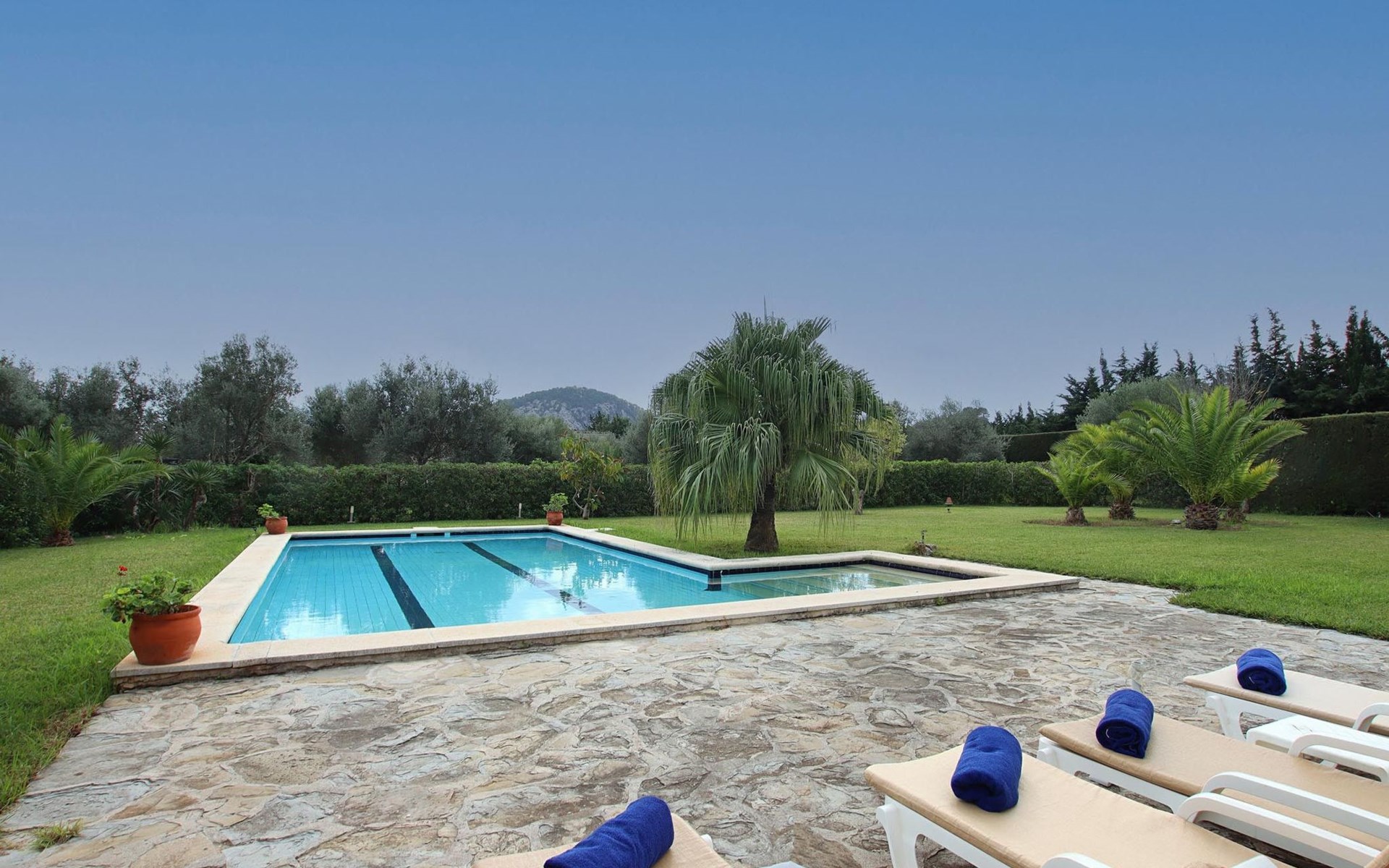 The swimming pool is surrounded by a nice and large garden with lawn and a small solarium area with sun loungers.