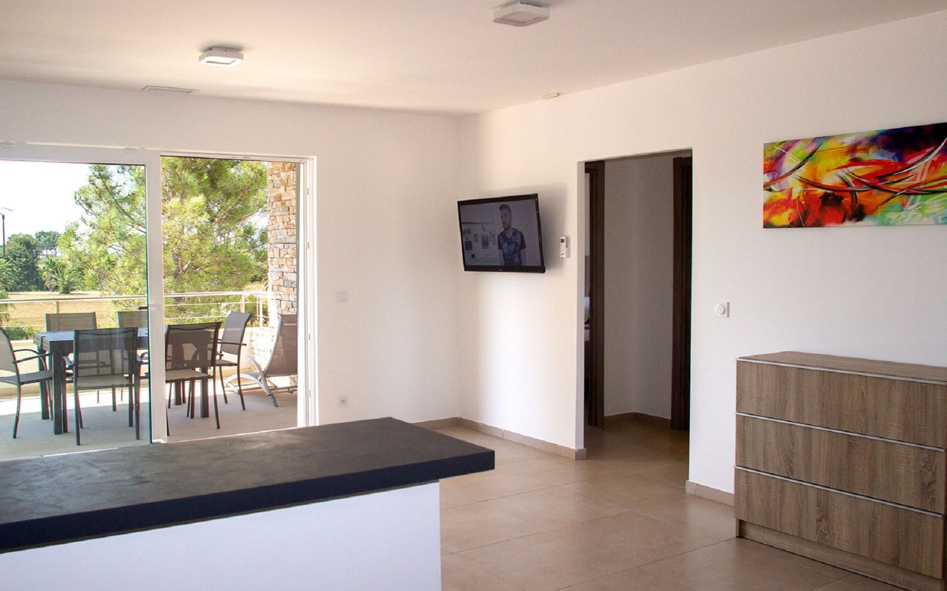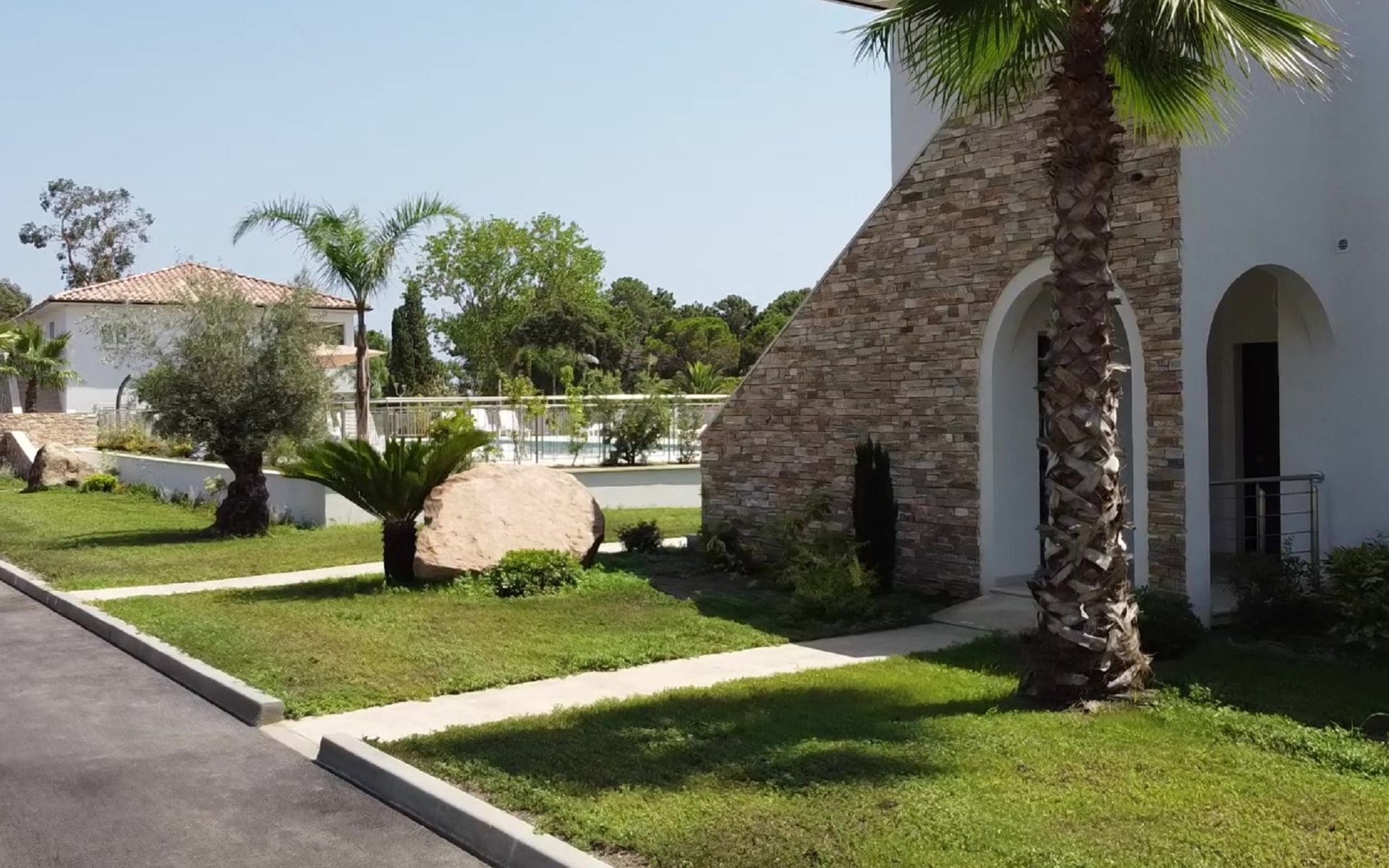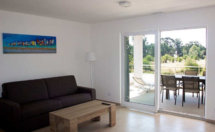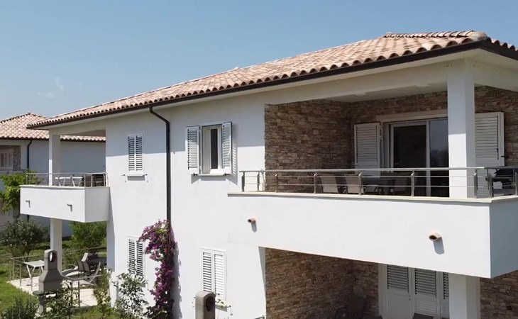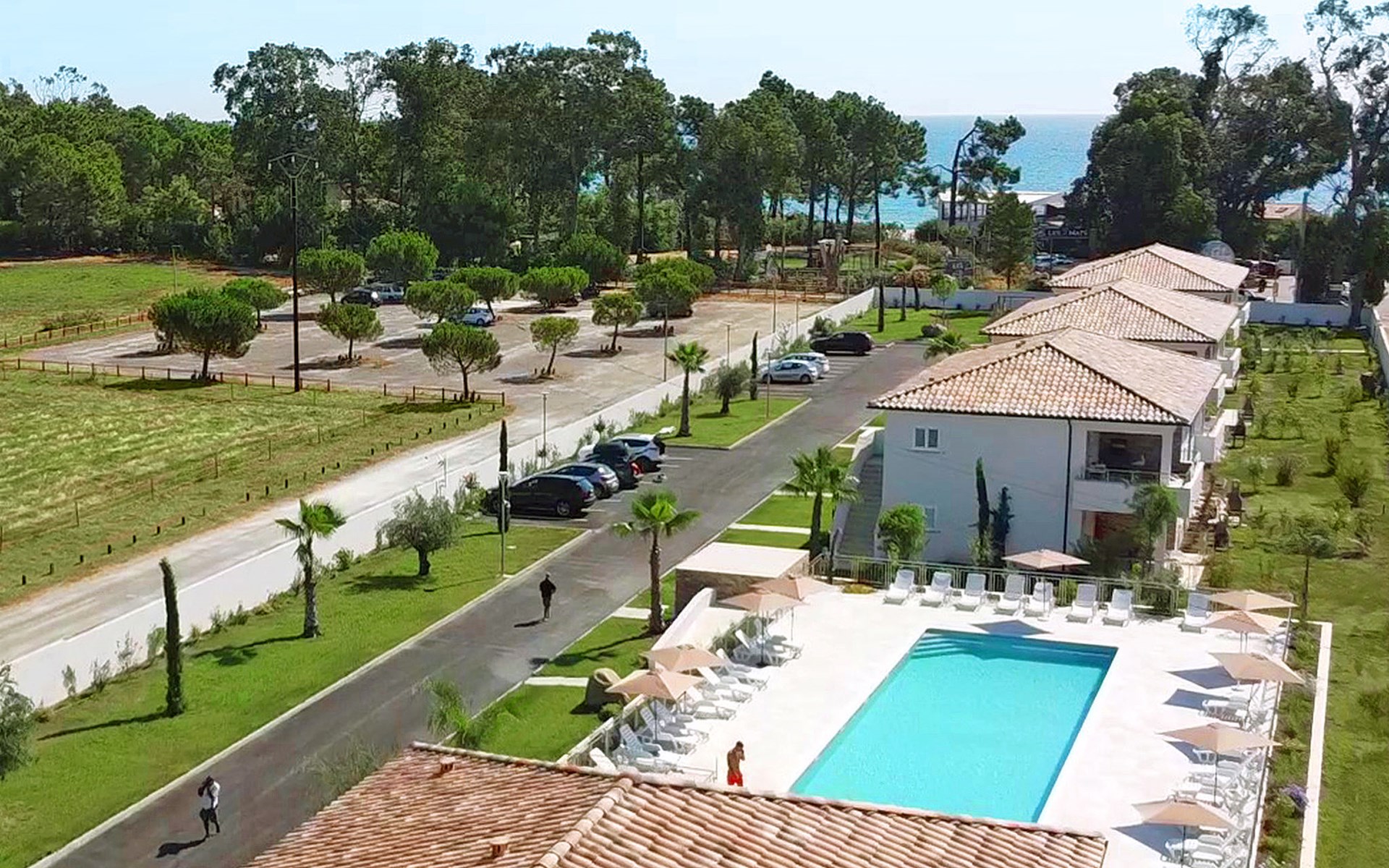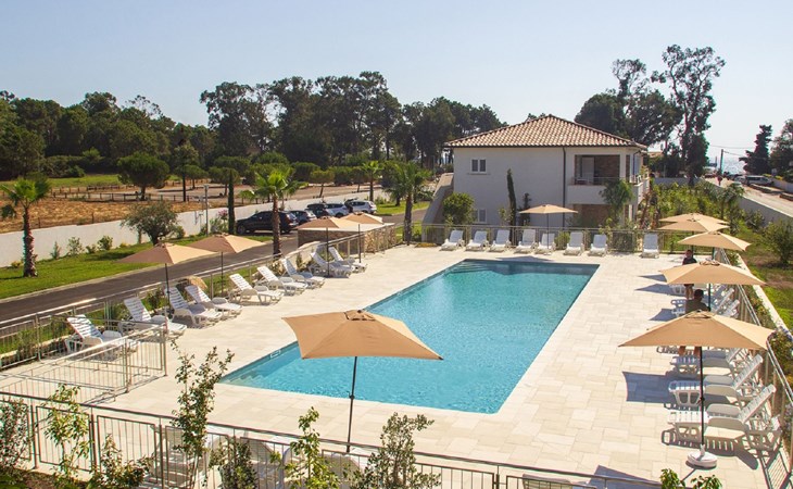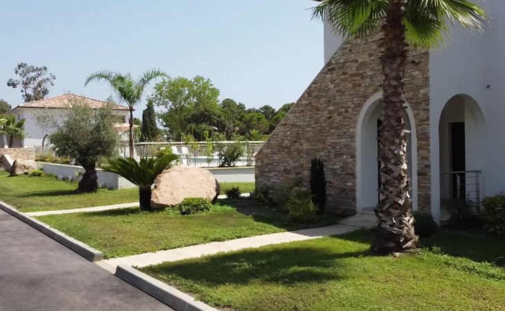 Beautiful resort "A Suara Linda", built in 2020. 20 apartments in the residence. 6 km from the centre of Ghisonaccia, 60 km from the centre of Porto Vecchio, 90 km from the centre of Bastia, in a sunny position, 100 m from the sea, 100 m from the beach, in the countryside. For shared use: property 2'000 m2 (fenced), well-kept garden with lawn and plants, swimming pool (20 x 6 m, seasonal availability: 15.May. - 31.Oct.). Outdoor shower, parking on the premises. Supermarket 2 km, bus stop 5 km, sandy beach 100 m. Please note: car recommended. The photograph shows a typical example.