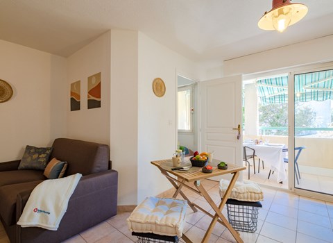 Large resort "Village Cap Estérel - L'Esquinade", built in 1990. On the outskirts, 2 km from the centre of Agay, on a slope, in the residential district, 900 m from the sea, 900 m from the beach, road to cross, on the golf course, in a pedestrian area. For shared use: park 210 ha, 5 swimming pools (seasonal availability: 06.Apr. - 03.Nov.). Children's pool, boccia, children's playground (slide, swing). In the complex: spa area (extra), shopping facilities, laundry (extra). E-charging station. Shop, grocery 500 m, supermarket 6 km, restaurant, bakery, café, bicycle rental 500 m, bus stop "Ligne 21" 300 m, railway station "Saint-Raphaël-Valescure - Agay" 9 km, sandy beach "Le Pourrousset" 800 m. Marina 1 km, golf course (9 hole) 300 m, tennis 500 m. Nearby attractions: Anthéor 8 km, Saint-Raphaël 9 km, Fréjus 13 km, Cannes 33 km, Saint-Tropez 50 km, Nice 76 km. Well-known lakes can easily be reached: Lac Saint-Cassien. Hiking paths: Massif de l'Estérel. Please note: car-free holiday complex, no lift. Entertainment in the season. Suitable for families, childminding in the season (extra). Guarded residence. The keys‘ handover takes place by the agency Interhome in Cap Estérel. The apartment is located in a zone with limited traffic. Additional accommodations can be booked. Access to the apartments is via steps, even on the ground floor.