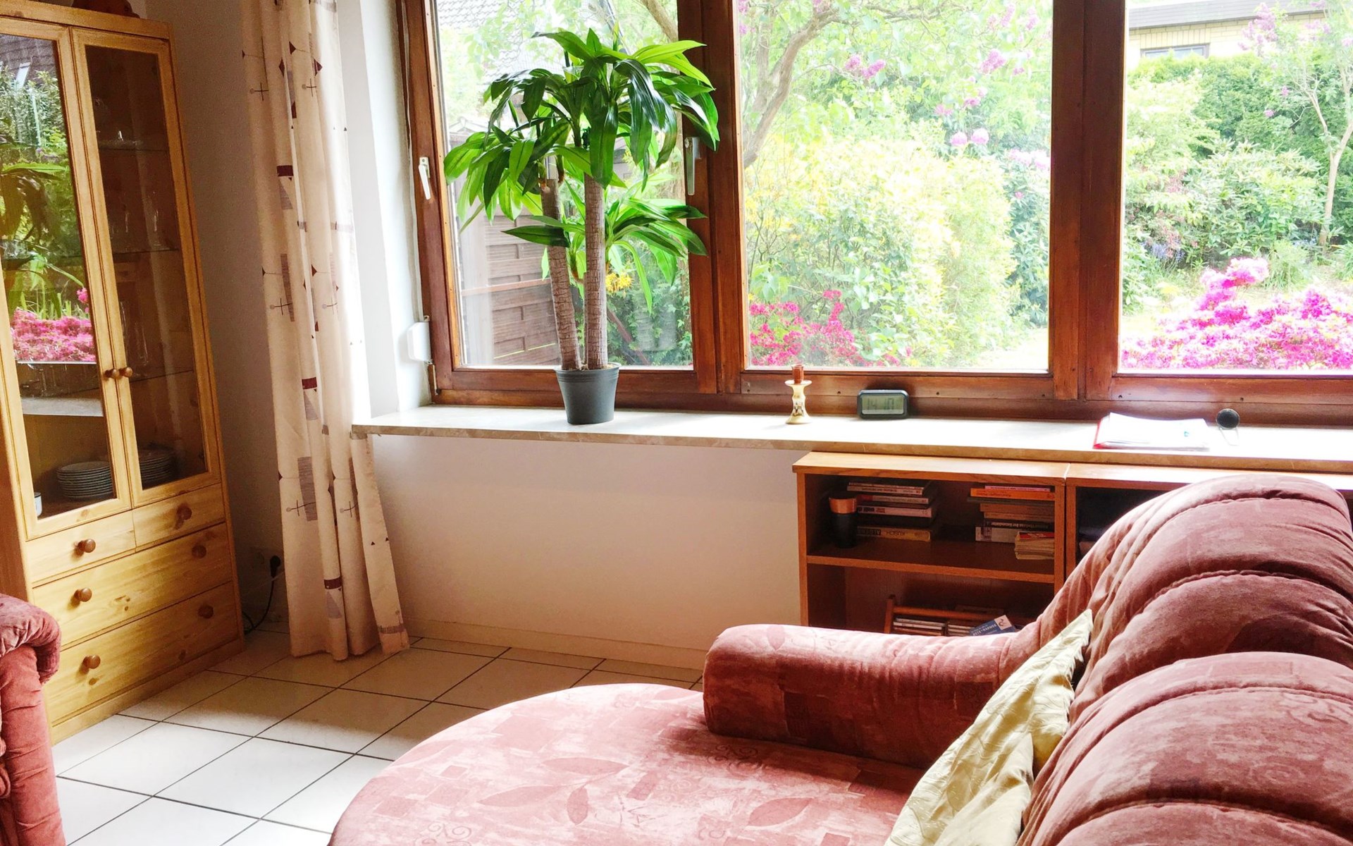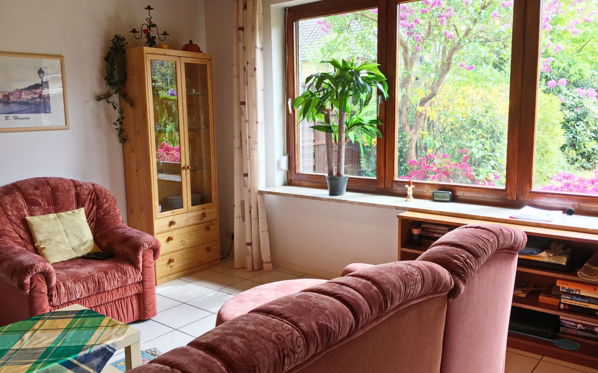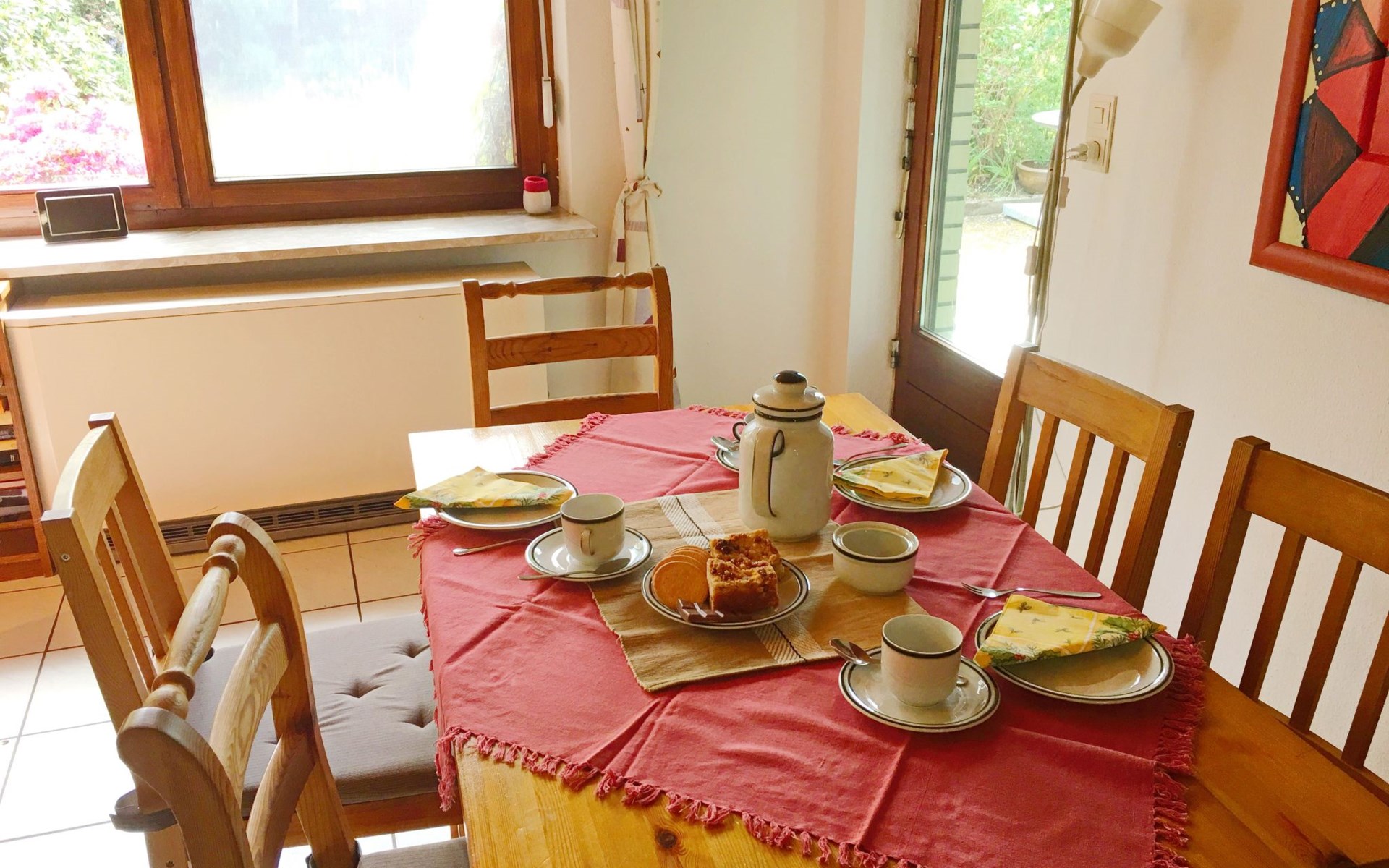 The outdoor area impresses with a south-facing garden that invites you to linger and relax. A covered terrace and high-quality garden furniture provide the perfect setting to wind down in the evenings. A small decorative pond blends charmingly into the garden landscape. For barbecue lovers, a barbecue is available for a deposit, complemented by the convenience of being able to park right outside the front door.