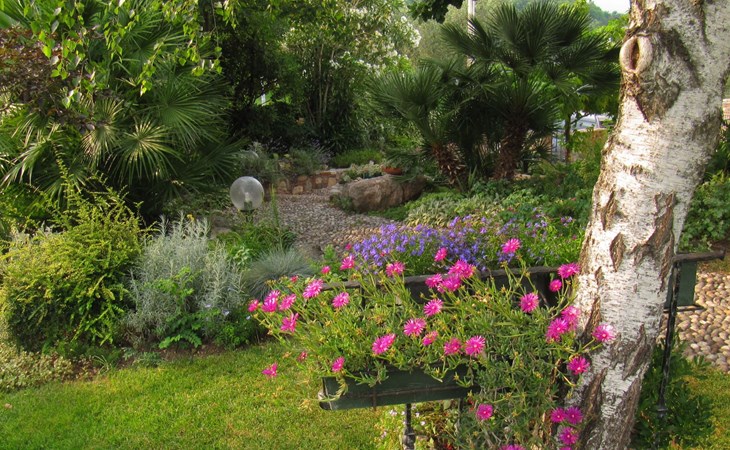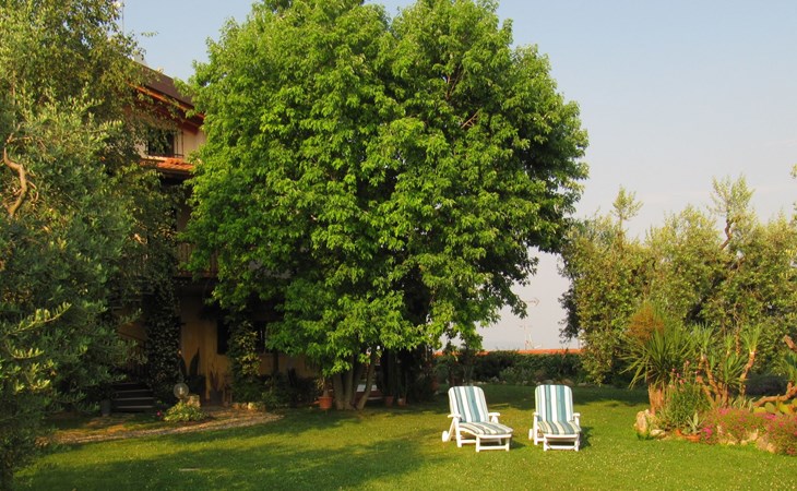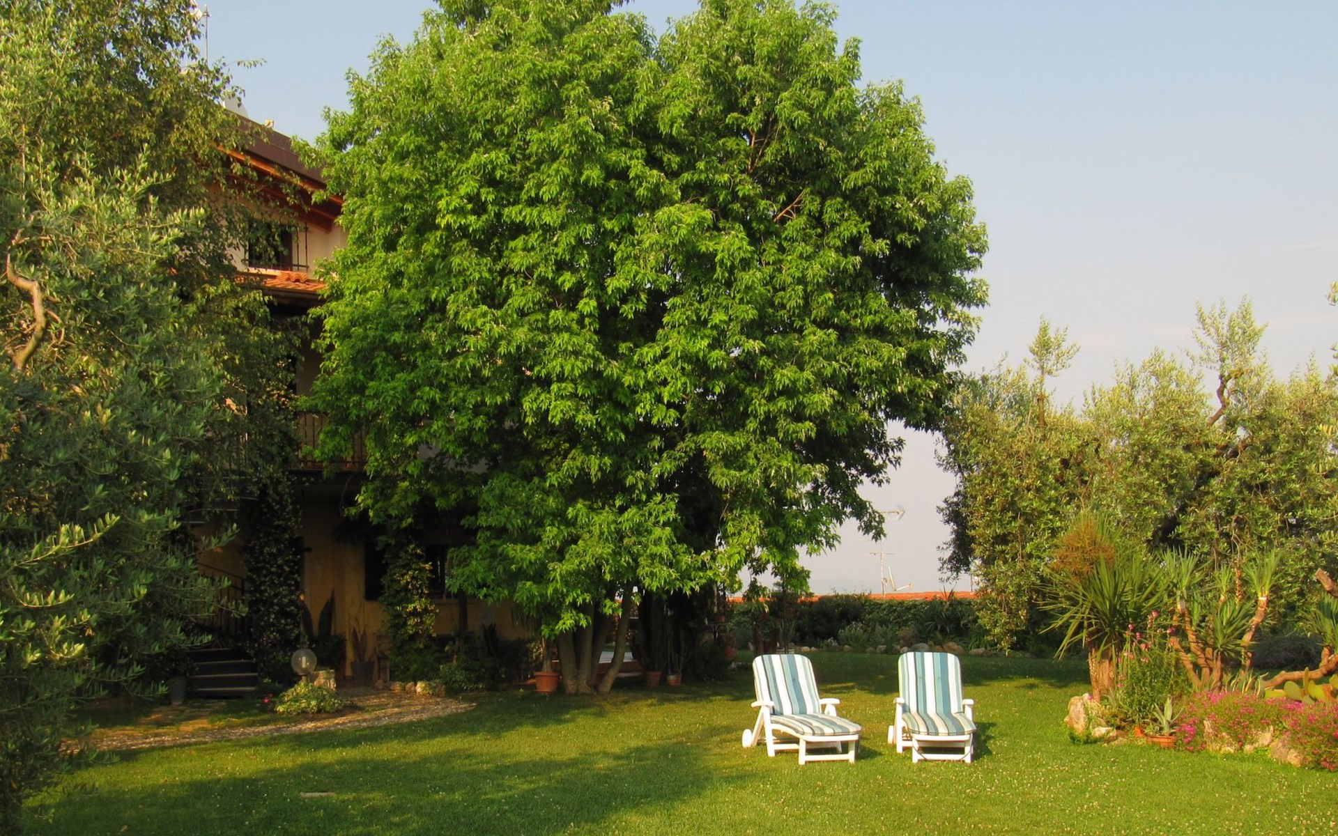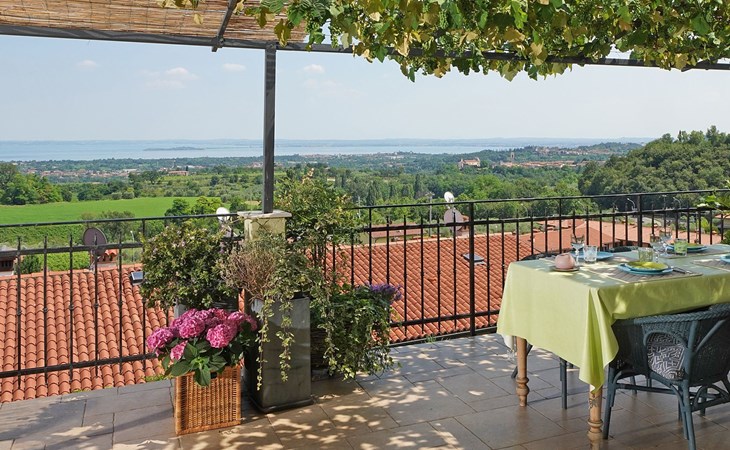 The flat "TERRAZZE SUL GARDA" is fantastic and unique; it is located on the first and last floor of a two-storey house, is accessed by a separate entrance and is surrounded by a large and well-kept garden. The flat is very bright thanks to the high wooden ceilings and large windows. It measures about 100 sqm and opens onto a terrace of about 40 sqm, from which one can enjoy one of the most incredible views of Lake Garda and the Valtenesi hills. The flat enjoys modern comforts such as a dishwasher, TV, heating, internet, etc., but is furnished with period furniture. It consists of 2 double bedrooms with parquet flooring, from which there is access to a further terrace overlooking the surrounding hills; both have a private bathroom with shower and bidet. A large living room with a fully equipped kitchenette and a relaxation area with a double sofa bed opens onto the terrace of over 40 sq m, equipped for outdoor dining. The flat is ideal for families of 5/6 people or for two couples.