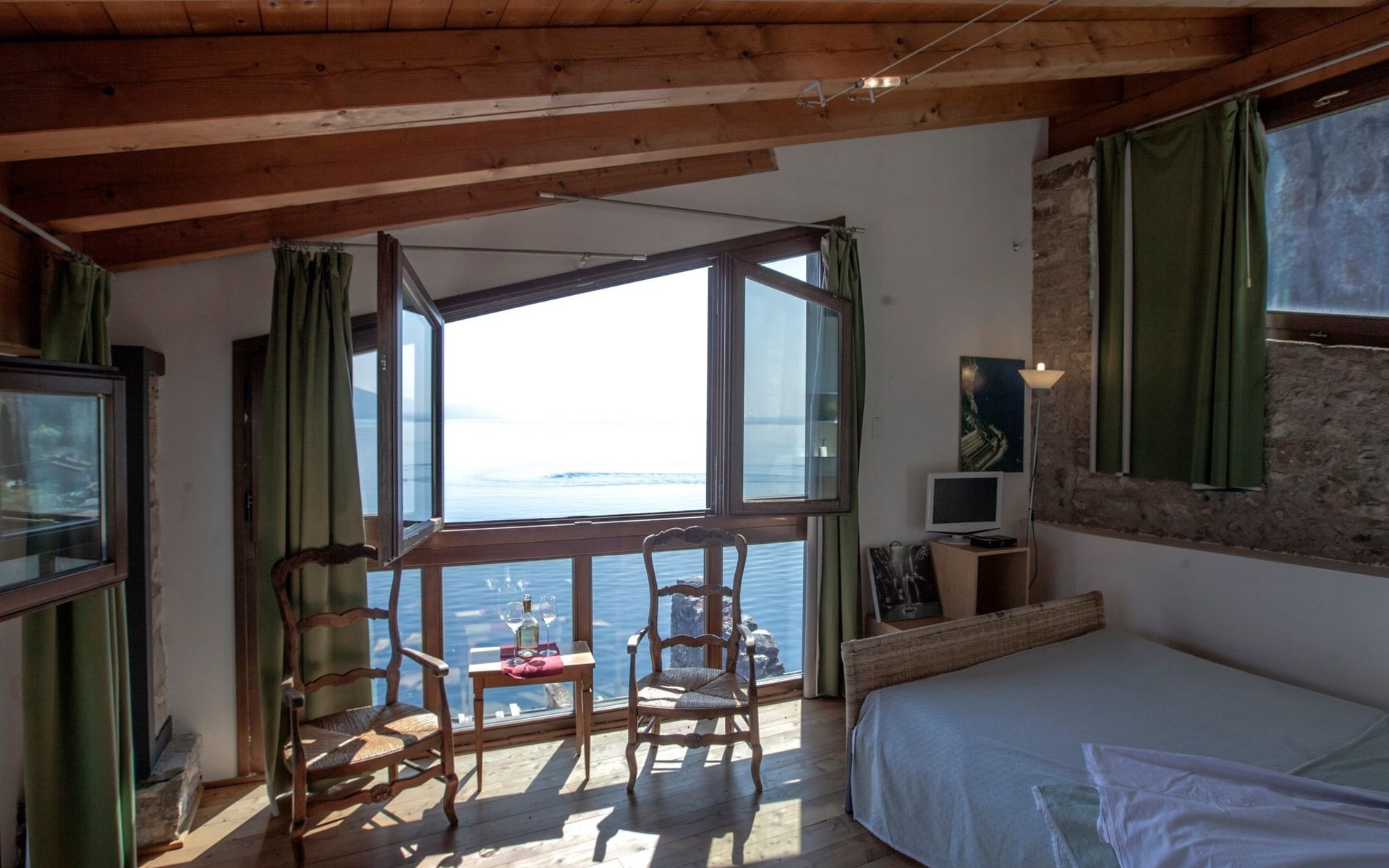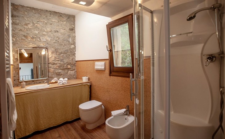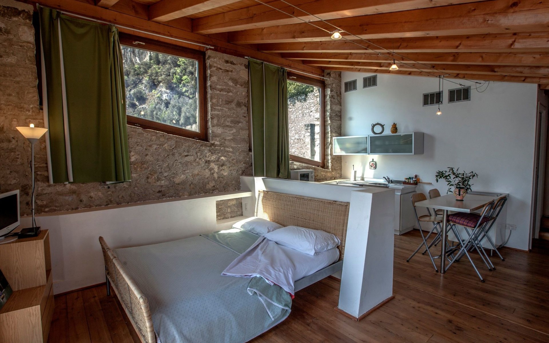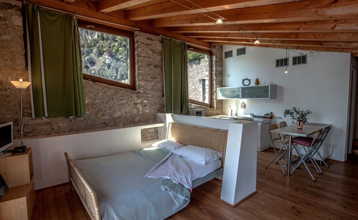 Inside, the flat reveals an intimate and cosy atmosphere, perfect for a romantic getaway. Guests are welcomed into a tastefully furnished environment, where a comfortable double bed promises serene rest and a large wardrobe offers plenty of space for personal belongings. Warm and authentic wood finishes complete the picture of an intimate retreat where every detail is designed to enhance the comfort and warmth of the welcome.