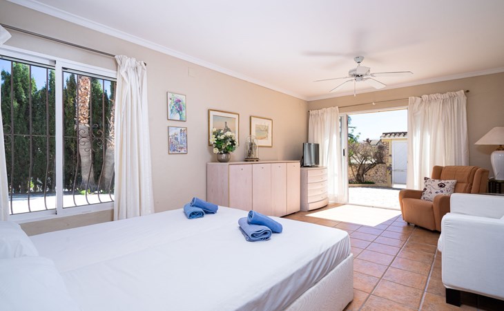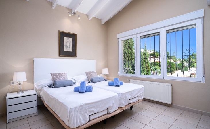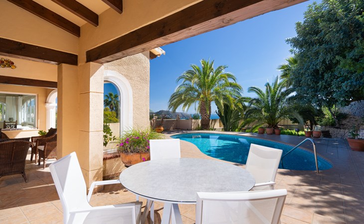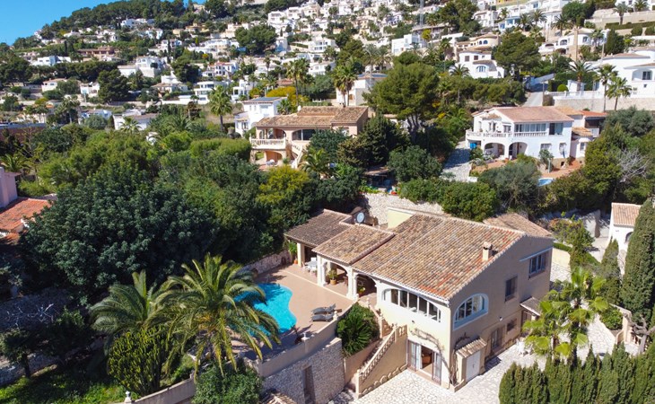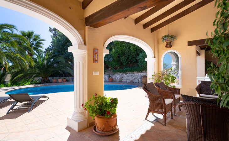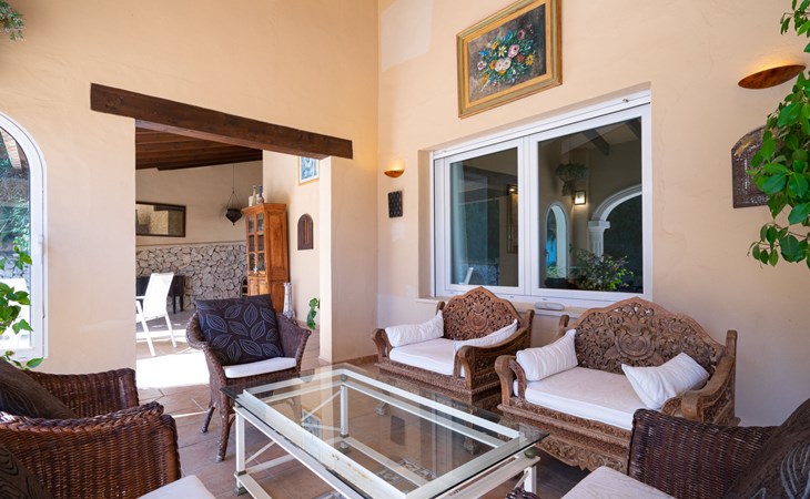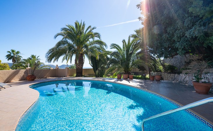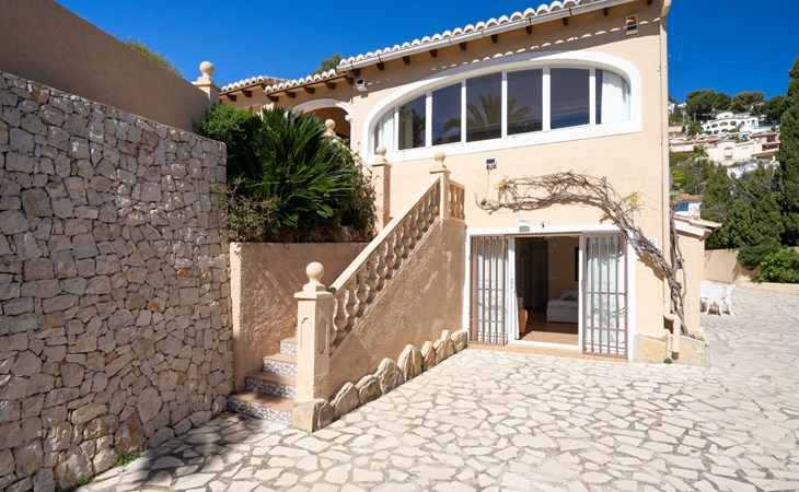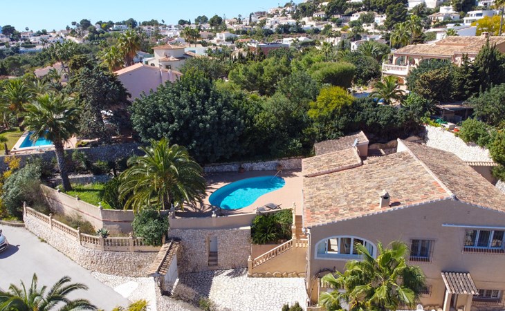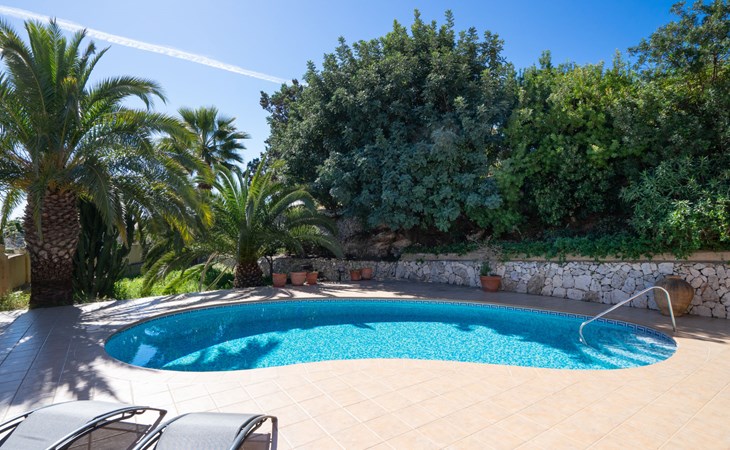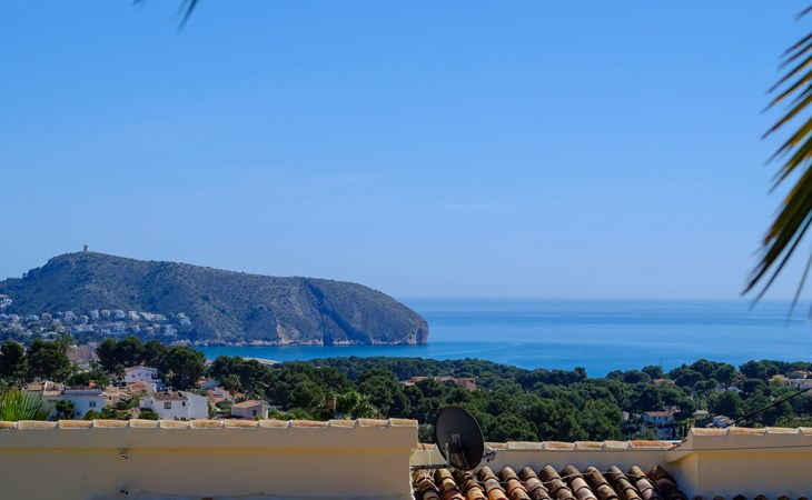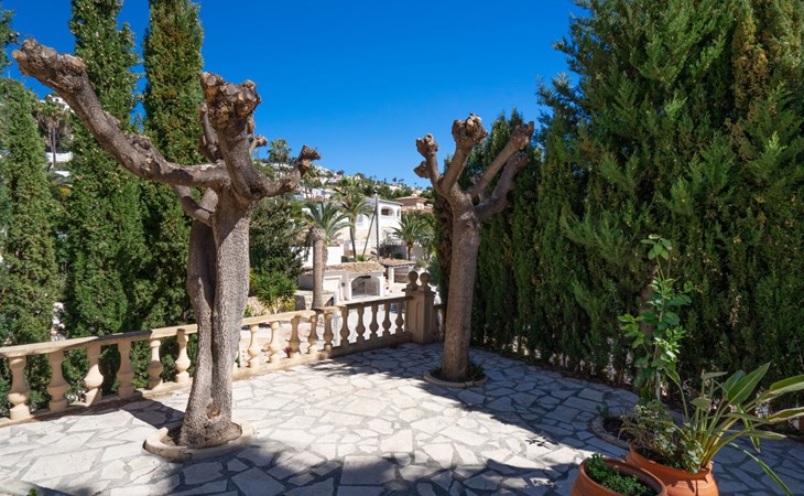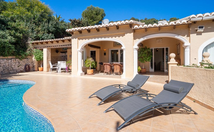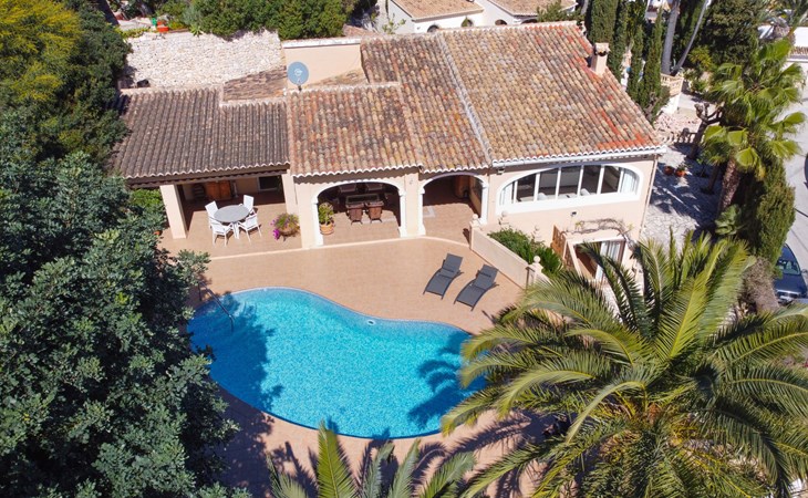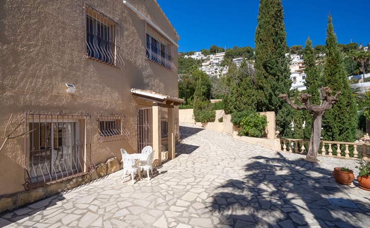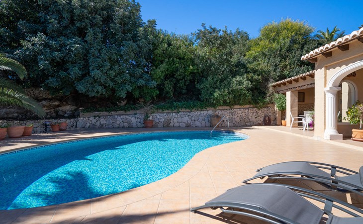 Beautiful villa "Marita", 2 storeys. 3 km from the centre of Moraira, in a sunny position on top of a hill, 3 km from the sea, 3 km from the beach. Private: property 800 m2 with wildlife garden and trees, swimming pool kidney shaped, with privacy (5 x 10 m, depth 120 - 160 cm, seasonal availability: 01.Jan. - 31.Dec.) with internal staircase. Outdoor shower. In the house: air conditioning, washing machine. Parking (for 3 cars) on the premises. Shop 3 km, supermarket 3 km, restaurant 1.4 km, bar 500 m, bus stop "Moraira" 4.3 km, railway station "Teulada" 6.1 km, ferry "Denia" 26.5 km, sandy beach "Playa L'Ampolla" 3 km. Please note: car recommended. The owner does not accept any youth groups.