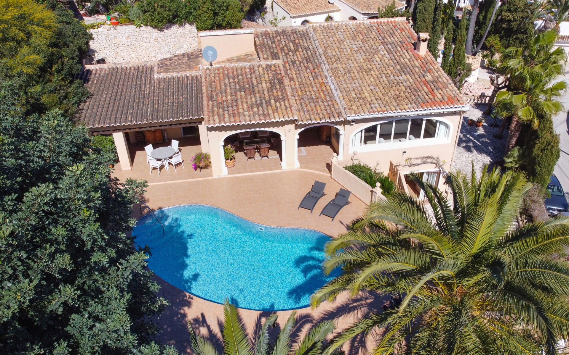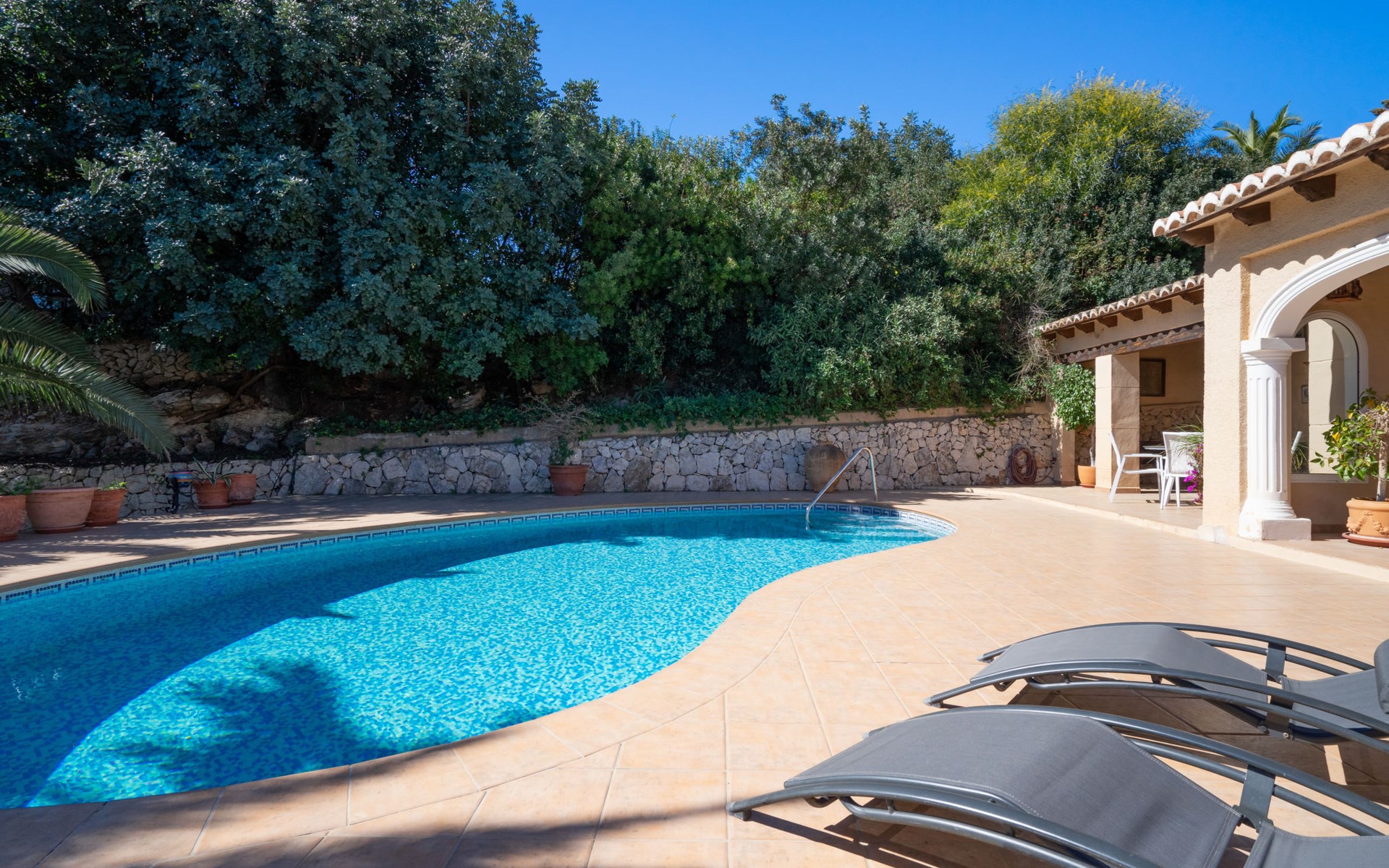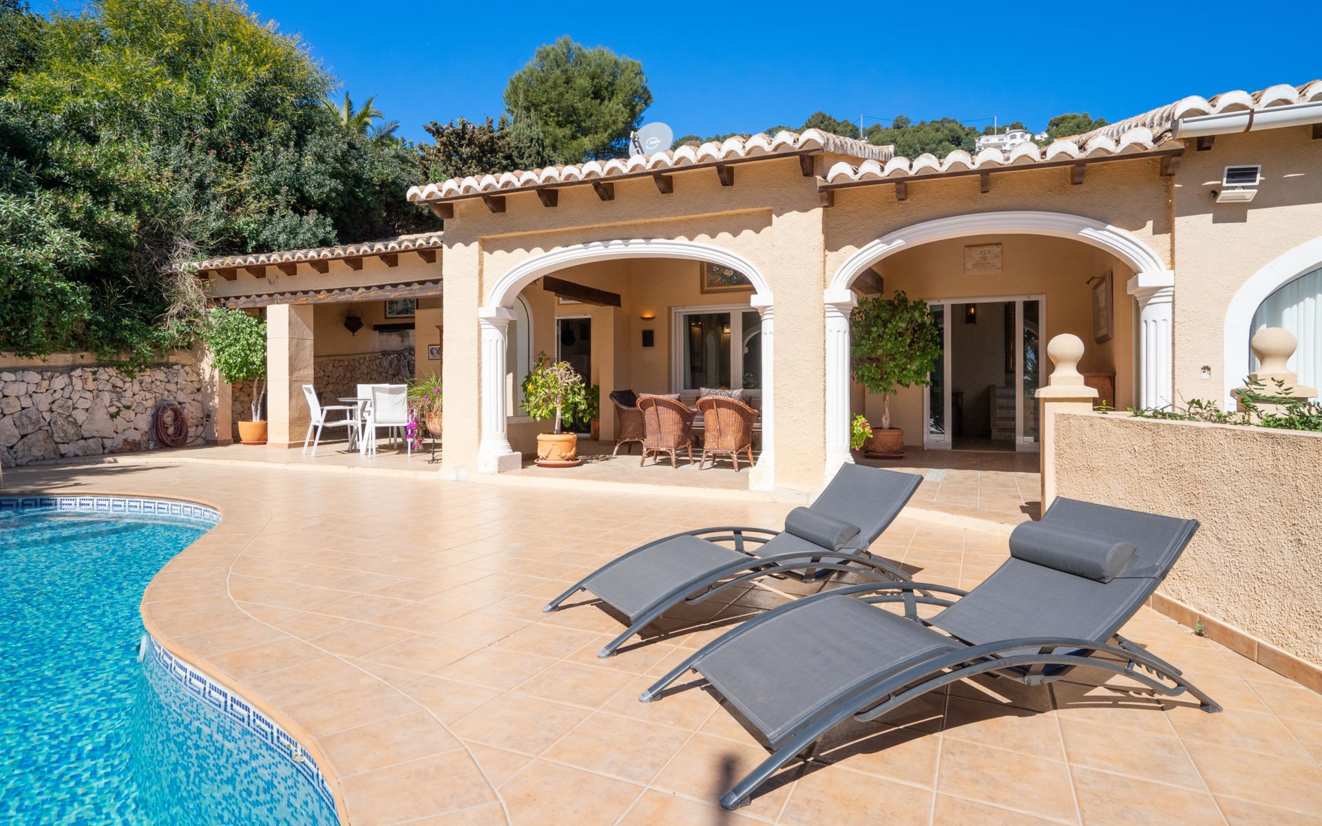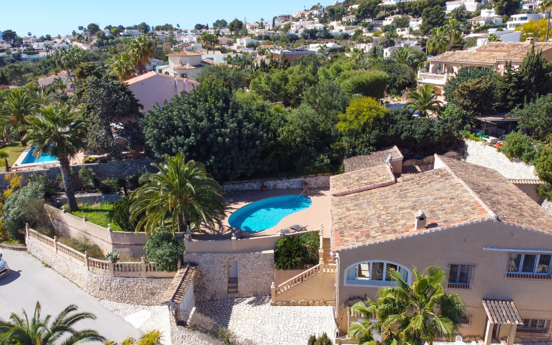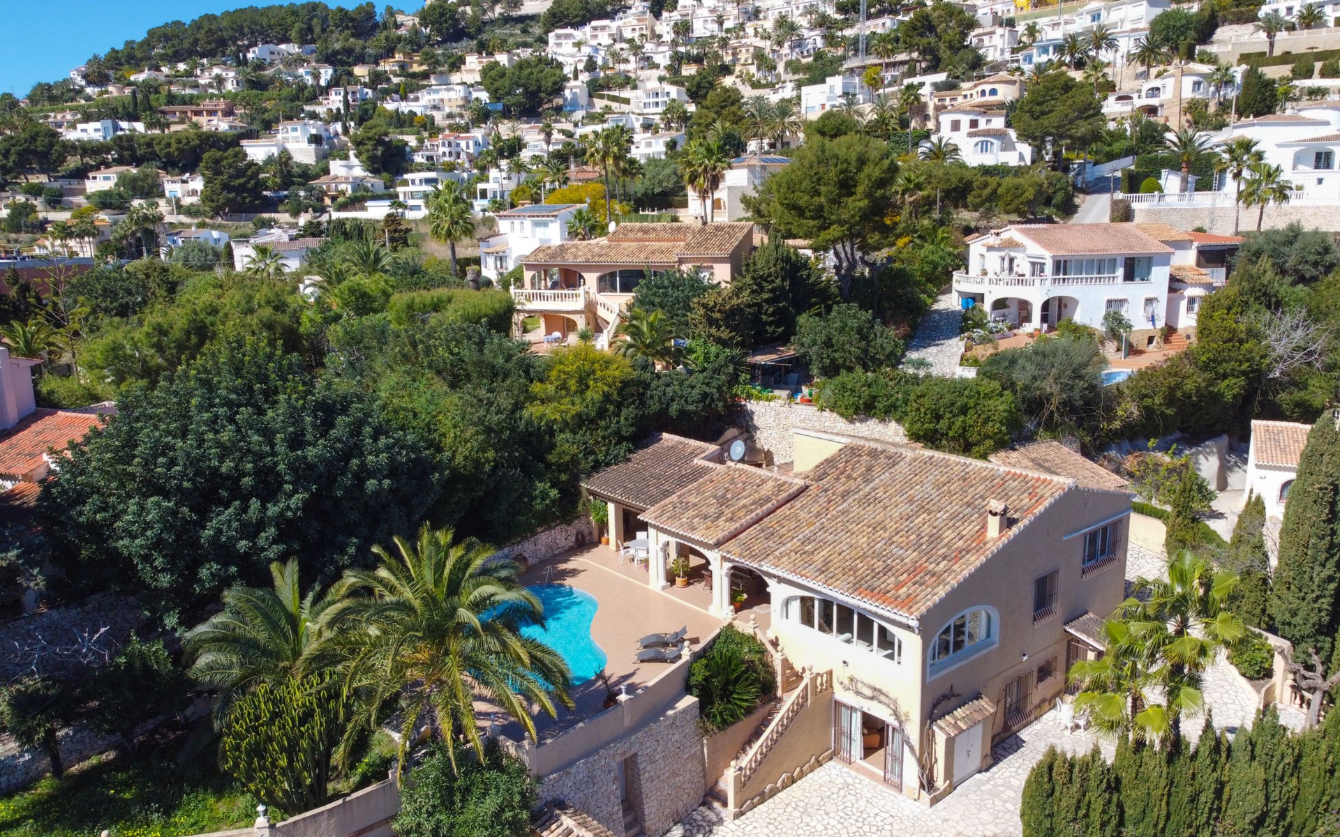 Beautiful villa "Marita", 2 storeys. 3 km from the centre of Moraira, in a sunny position on top of a hill, 3 km from the sea, 3 km from the beach. Private: property 800 m2 with wildlife garden and trees, swimming pool kidney shaped, with privacy (5 x 10 m, depth 120 - 160 cm, seasonal availability: 01.Jan. - 31.Dec.) with internal staircase. Outdoor shower. In the house: air conditioning, washing machine. Parking (for 3 cars) on the premises. Shop 3 km, supermarket 3 km, restaurant 1.4 km, bar 500 m, bus stop "Moraira" 4.3 km, railway station "Teulada" 6.1 km, ferry "Denia" 26.5 km, sandy beach "Playa L'Ampolla" 3 km. Please note: car recommended. The owner does not accept any youth groups.