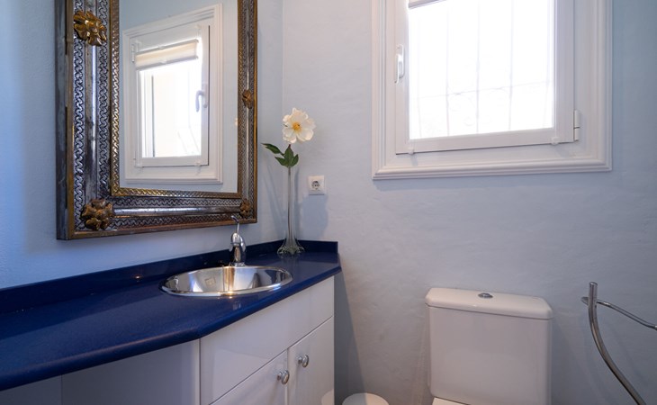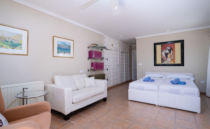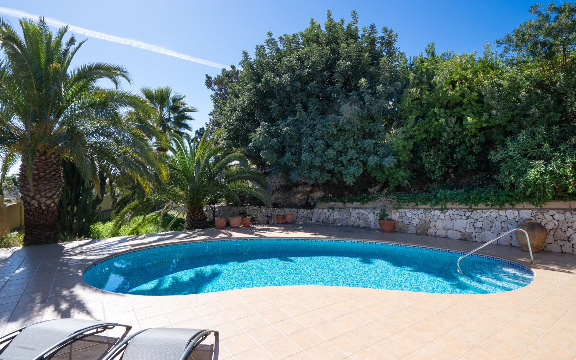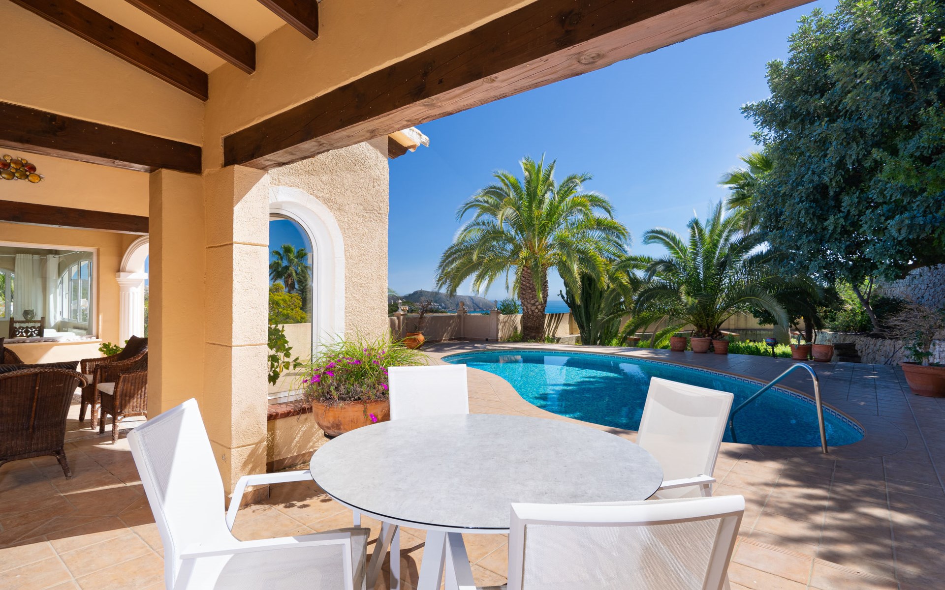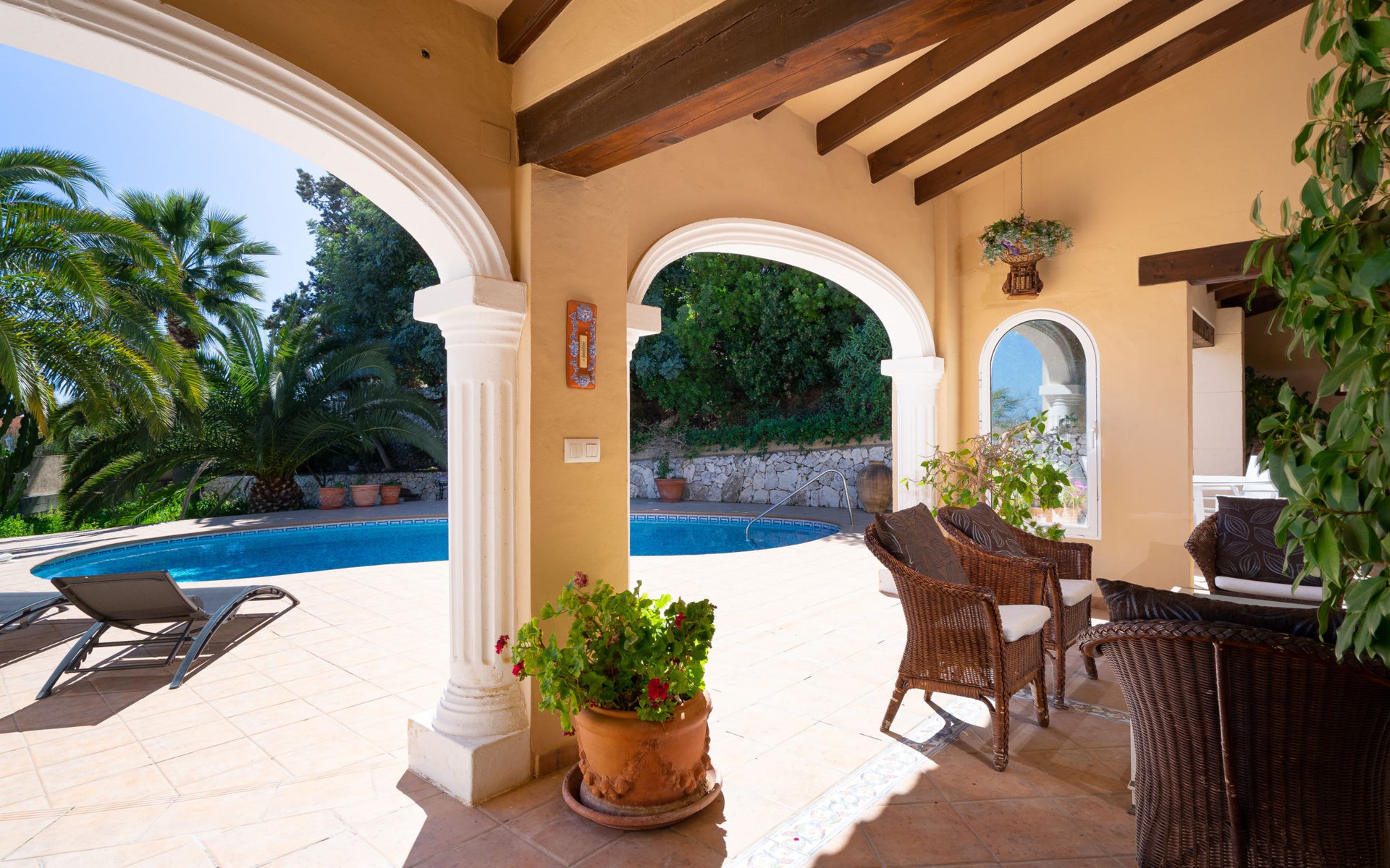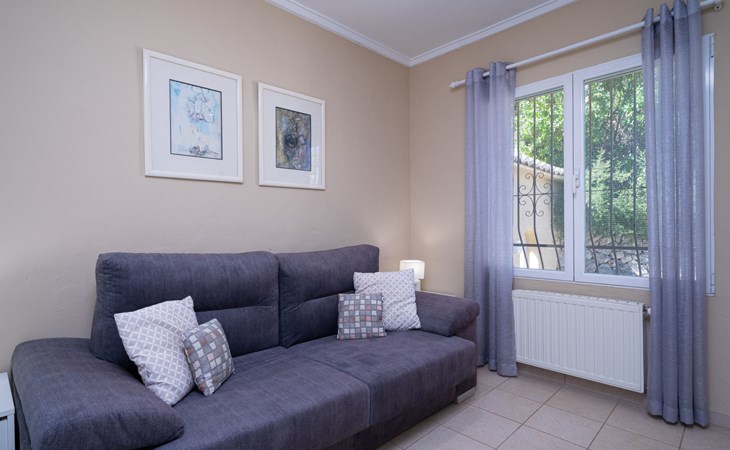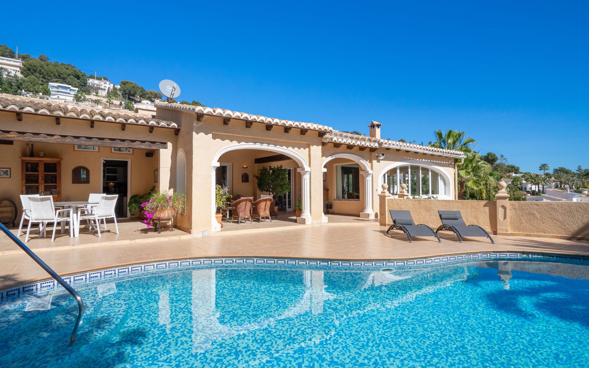 Beautiful villa "Marita", 2 storeys. 3 km from the centre of Moraira, in a sunny position on top of a hill, 3 km from the sea, 3 km from the beach. Private: property 800 m2 with wildlife garden and trees, swimming pool kidney shaped, with privacy (5 x 10 m, depth 120 - 160 cm, seasonal availability: 01.Jan. - 31.Dec.) with internal staircase. Outdoor shower. In the house: air conditioning, washing machine. Parking (for 3 cars) on the premises. Shop 3 km, supermarket 3 km, restaurant 1.4 km, bar 500 m, bus stop "Moraira" 4.3 km, railway station "Teulada" 6.1 km, ferry "Denia" 26.5 km, sandy beach "Playa L'Ampolla" 3 km. Please note: car recommended. The owner does not accept any youth groups.