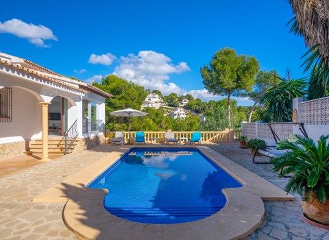 Beautiful villa "Marita", 2 storeys. 3 km from the centre of Moraira, in a sunny position on top of a hill, 3 km from the sea, 3 km from the beach. Private: property 800 m2 with wildlife garden and trees, swimming pool kidney shaped, with privacy (5 x 10 m, depth 120 - 160 cm, seasonal availability: 01.Jan. - 31.Dec.) with internal staircase. Outdoor shower. In the house: air conditioning, washing machine. Parking (for 3 cars) on the premises. Shop 3 km, supermarket 3 km, restaurant 1.4 km, bar 500 m, bus stop "Moraira" 4.3 km, railway station "Teulada" 6.1 km, ferry "Denia" 26.5 km, sandy beach "Playa L'Ampolla" 3 km. Please note: car recommended. The owner does not accept any youth groups.