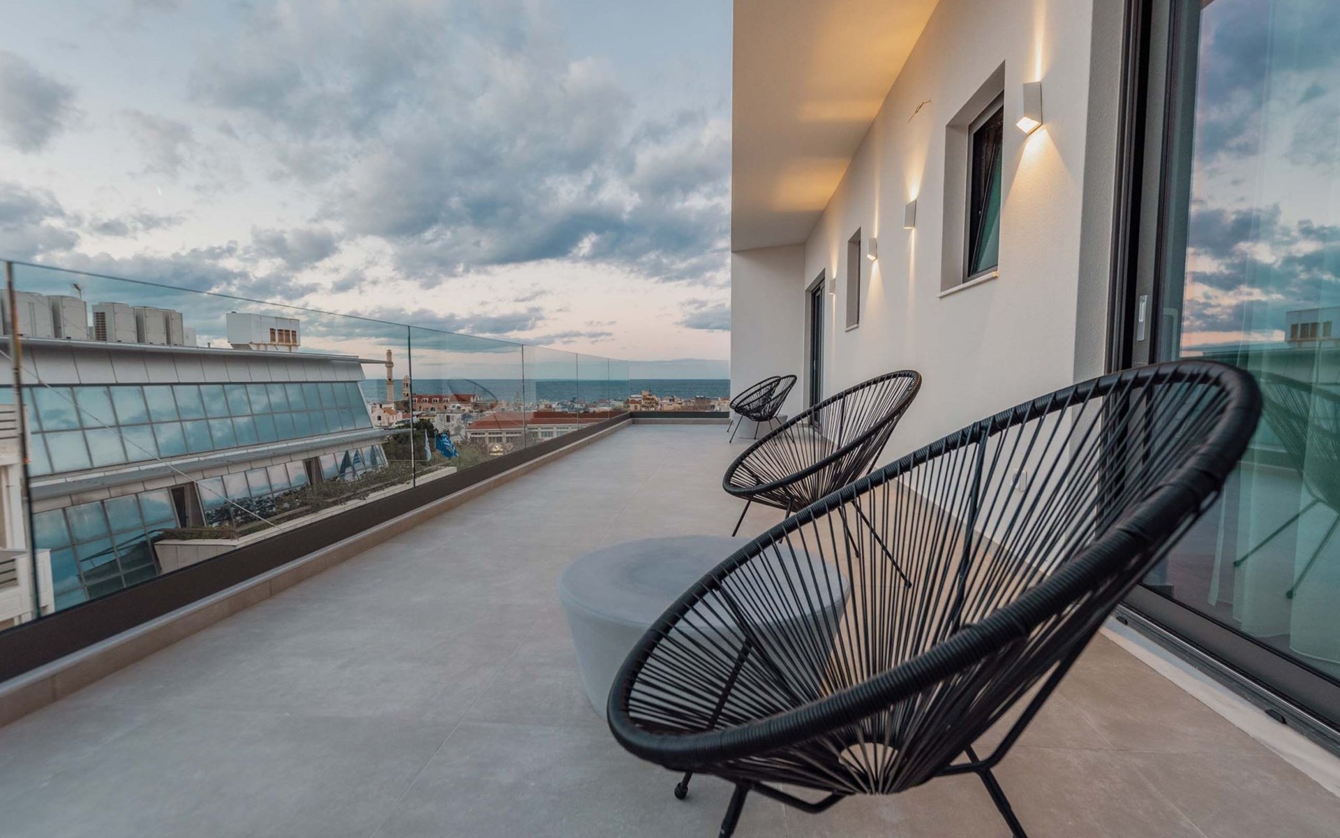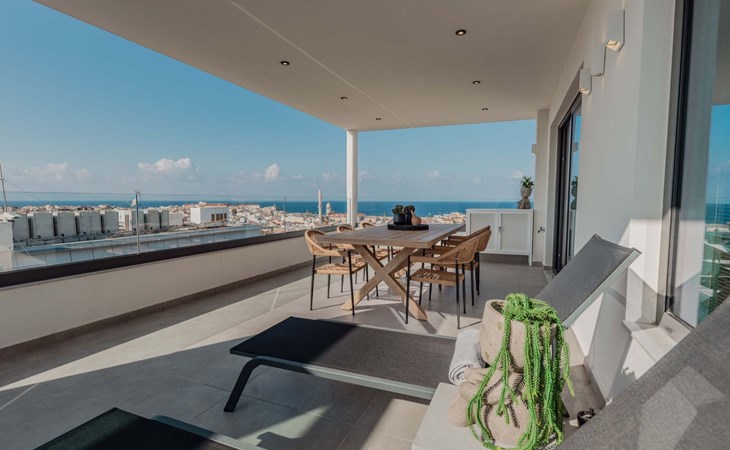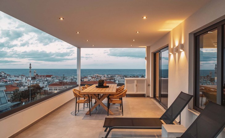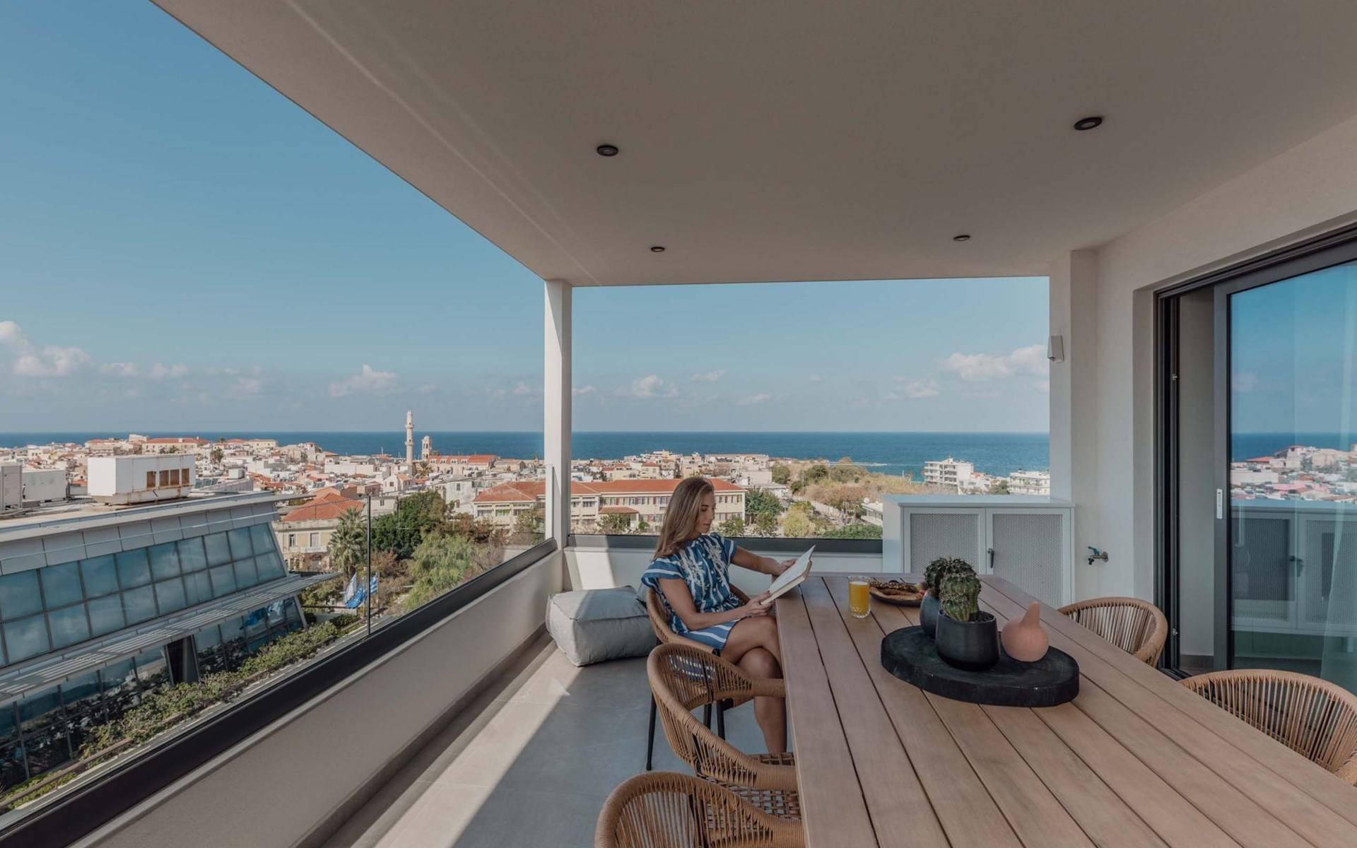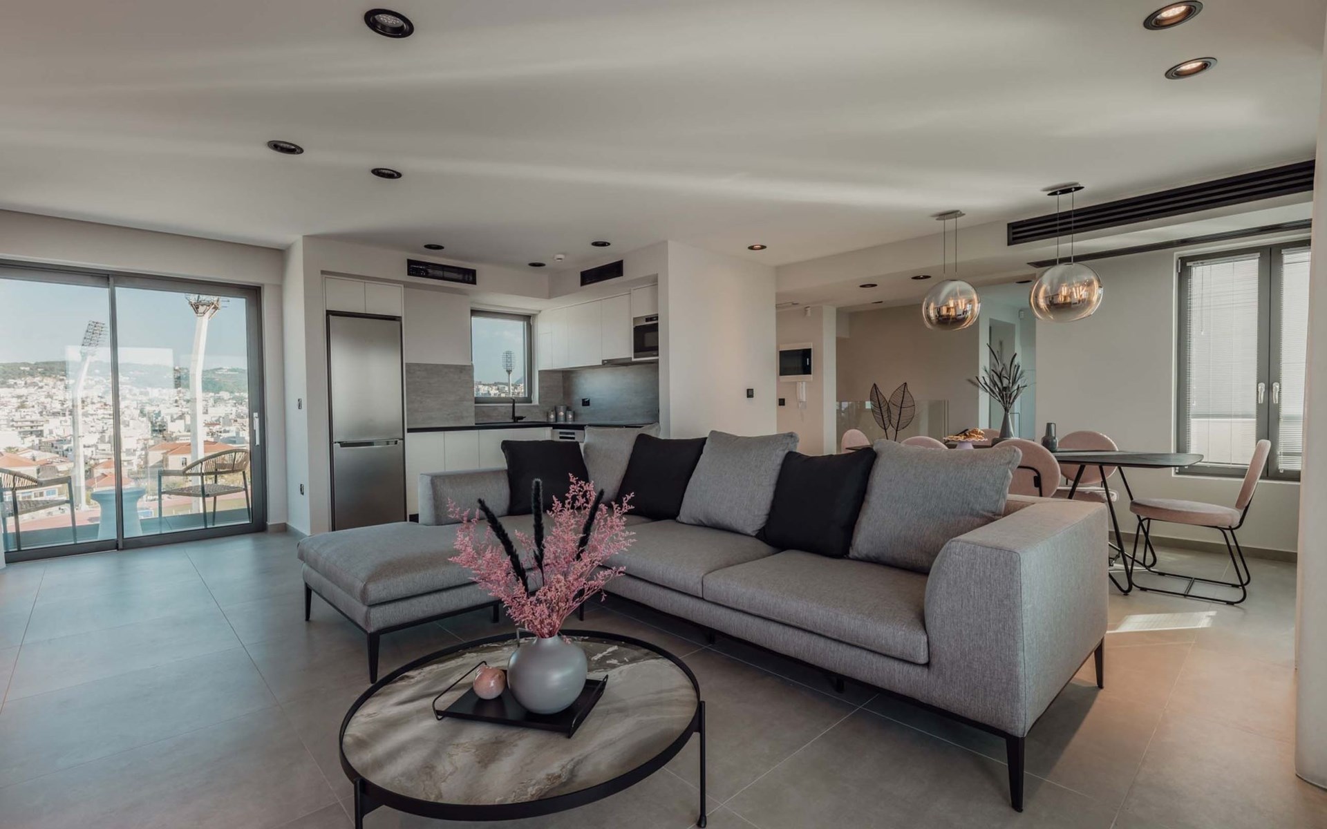 The stunning penthouse features generous indoor and outdoor areas that can host up to 6 guests generously featuring lavish design, supreme amenities handcrafted furniture, an exuberant living room, and a dining area on the upper floor, completing the utopian hideaway. Set across two floors, on the 5th and 6th floors of a new building, the owners have styled each room to feel like an immersive sanctuary. On the entrance floor, there is the open-plan living accommodation with a living area with a satellite TV, a modern fireplace for perfect cosy nights, a dining area, and a fully equipped, fitted, and modern kitchen. The large windows create the illusion of transparency allowing for a flood of Cretan sunshine to illuminate the room. When you reach the lower floor through the elevator you will find 3 modern-designed bedrooms that themselves host queen-size beds with ensuite bathrooms offering complete autonomy and privacy. Next to the bedrooms, for your convenience, you can find a coffee bar with two coffee machines, a small fridge, and some tableware adequate to serve your needs. The property is filled with natural light and instyled with minimal furniture specially designed for this specific project. All the spaces in it offer an indelible mark on the visitor's heart. Its various luxury facilities, its generous stylish areas, its unique location, and its matchless natural beauty make the City Moment Penthouse the perfect opportunity for a high-quality stay and the ideal summer home.