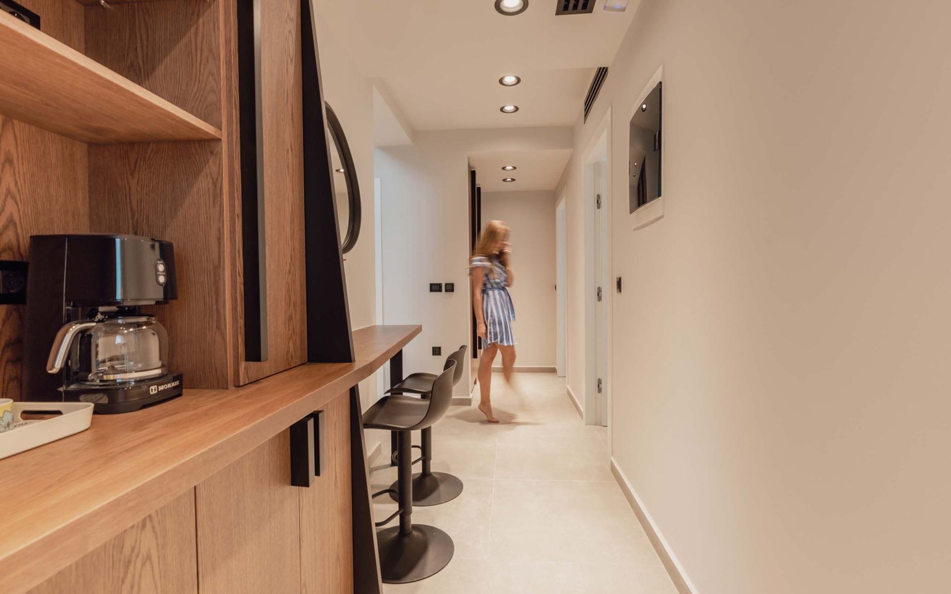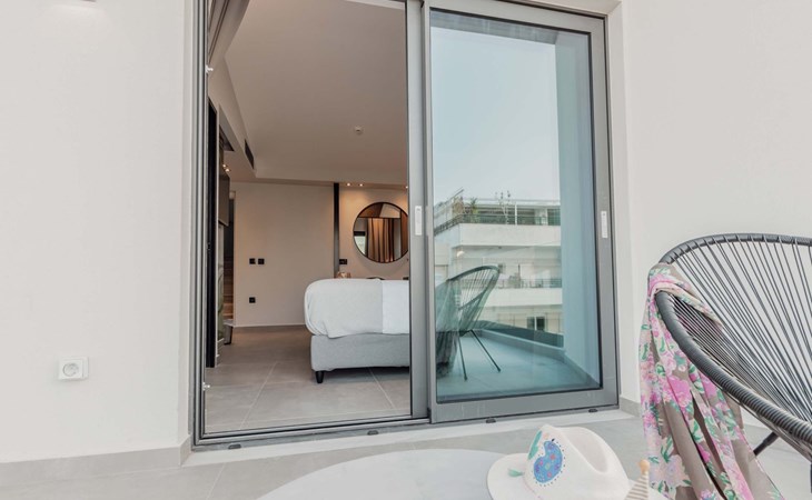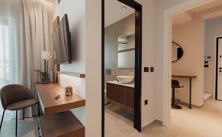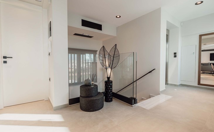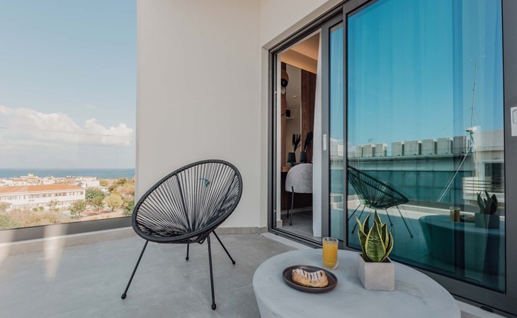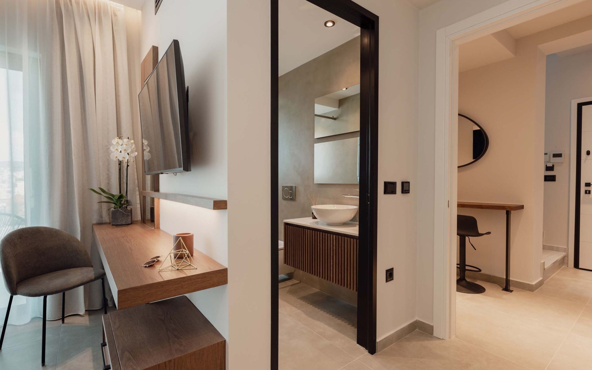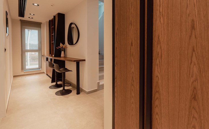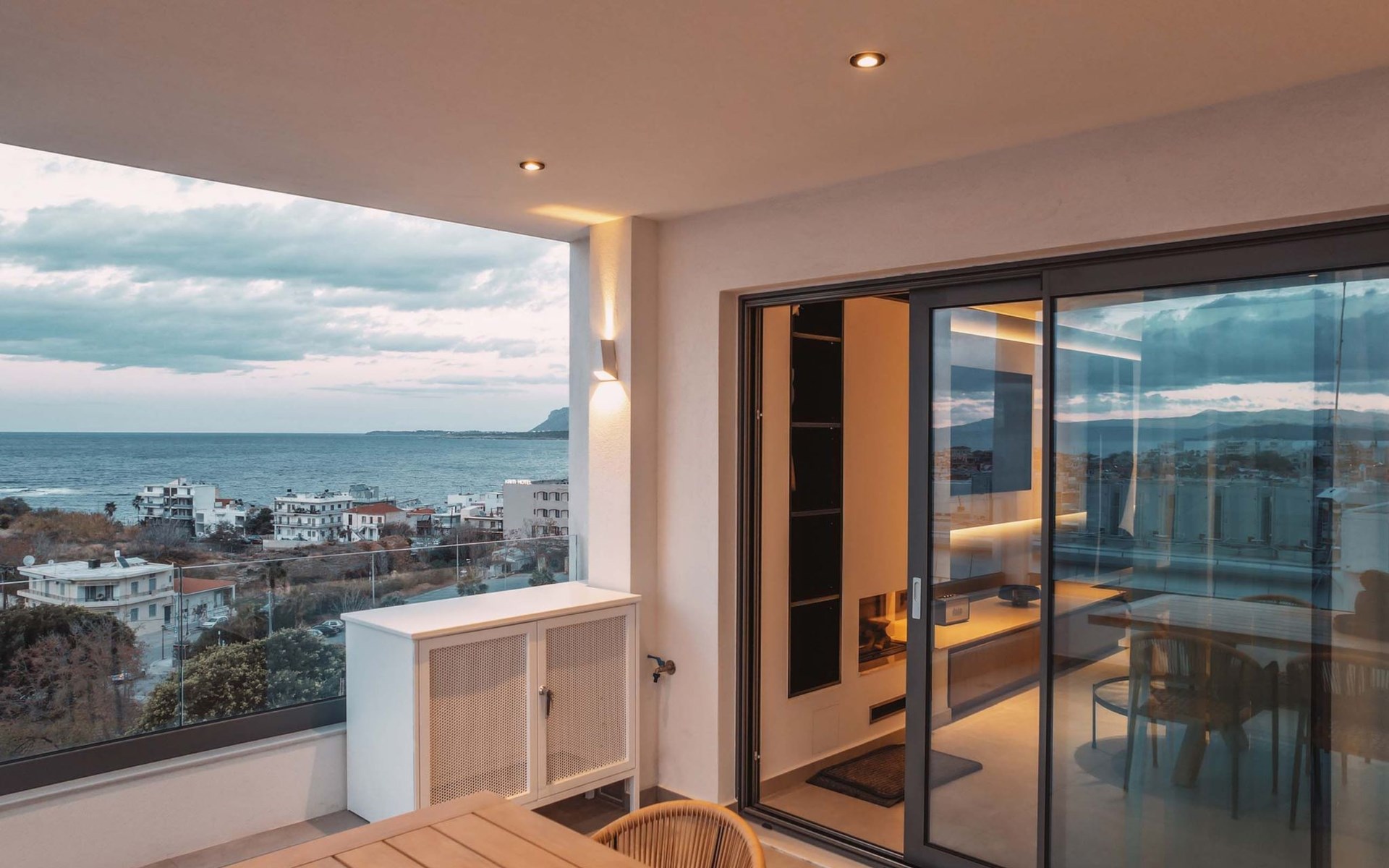 The stunning penthouse features generous indoor and outdoor areas that can host up to 6 guests generously featuring lavish design, supreme amenities handcrafted furniture, an exuberant living room, and a dining area on the upper floor, completing the utopian hideaway. Set across two floors, on the 5th and 6th floors of a new building, the owners have styled each room to feel like an immersive sanctuary. On the entrance floor, there is the open-plan living accommodation with a living area with a satellite TV, a modern fireplace for perfect cosy nights, a dining area, and a fully equipped, fitted, and modern kitchen. The large windows create the illusion of transparency allowing for a flood of Cretan sunshine to illuminate the room. When you reach the lower floor through the elevator you will find 3 modern-designed bedrooms that themselves host queen-size beds with ensuite bathrooms offering complete autonomy and privacy. Next to the bedrooms, for your convenience, you can find a coffee bar with two coffee machines, a small fridge, and some tableware adequate to serve your needs. The property is filled with natural light and instyled with minimal furniture specially designed for this specific project. All the spaces in it offer an indelible mark on the visitor's heart. Its various luxury facilities, its generous stylish areas, its unique location, and its matchless natural beauty make the City Moment Penthouse the perfect opportunity for a high-quality stay and the ideal summer home.