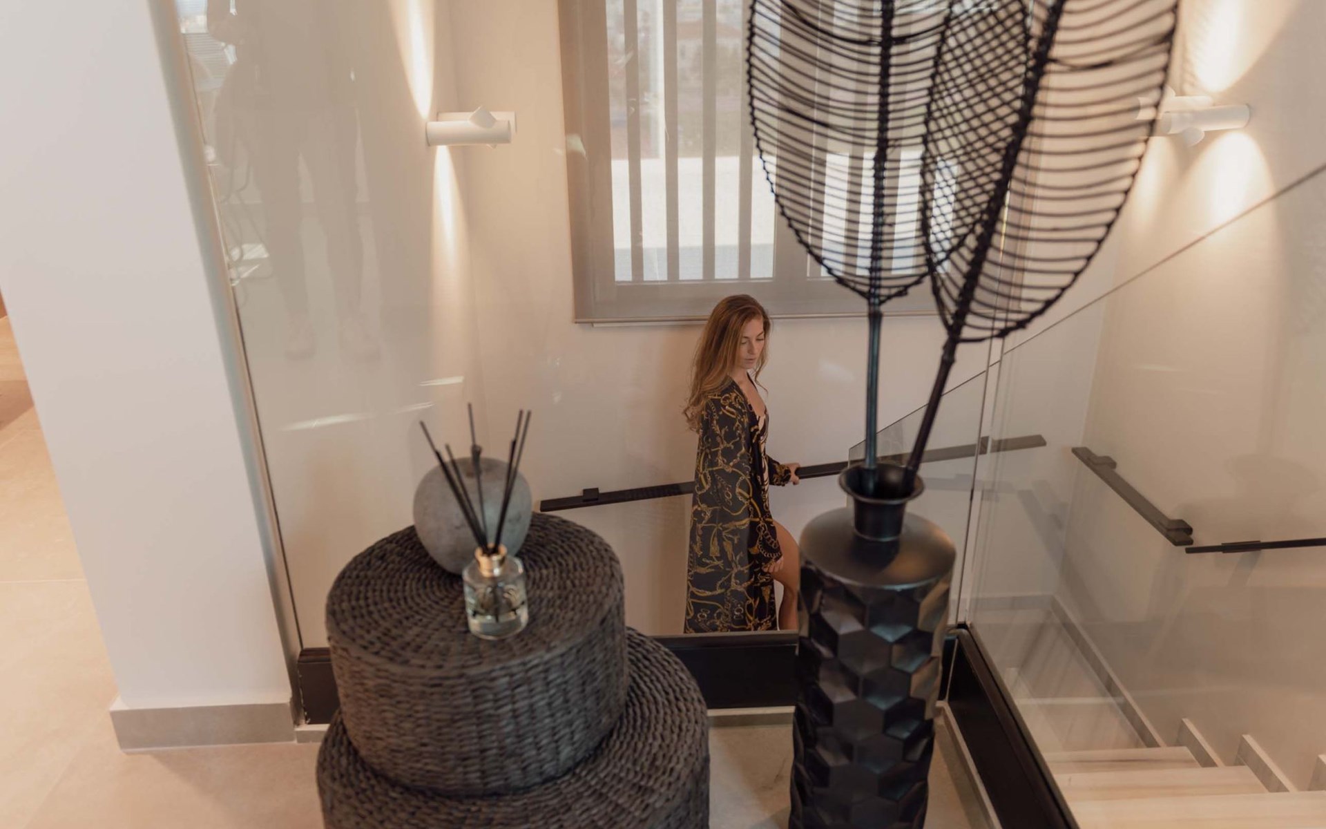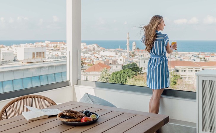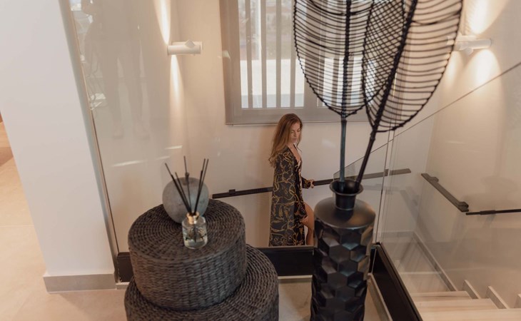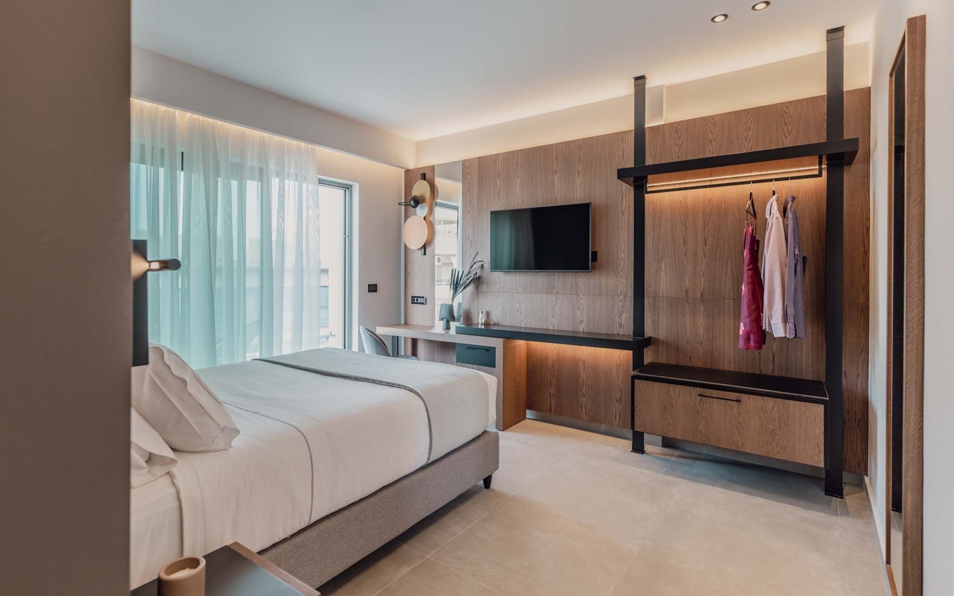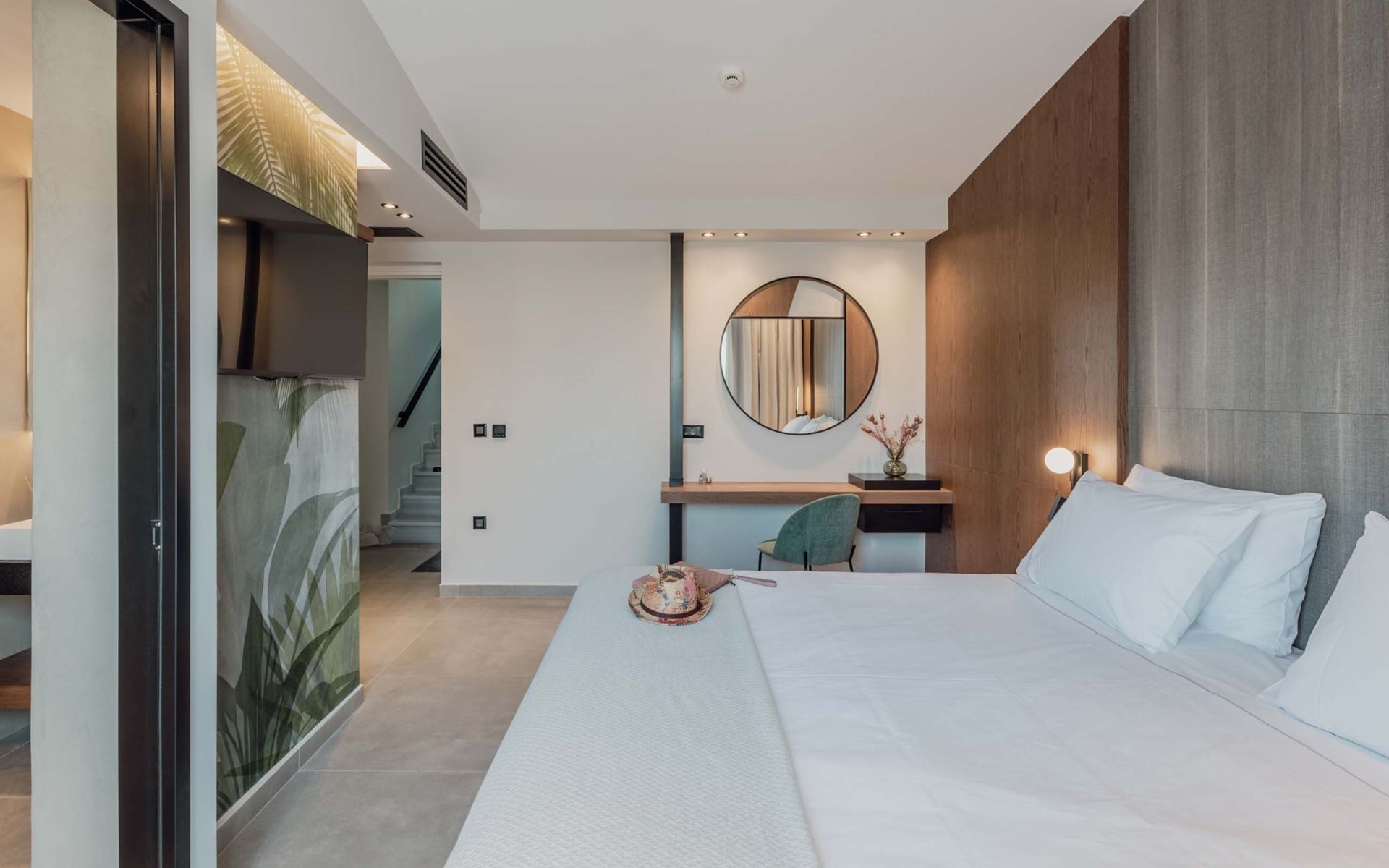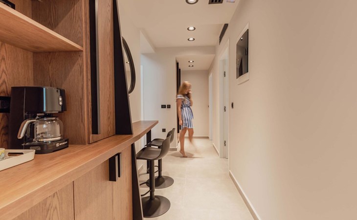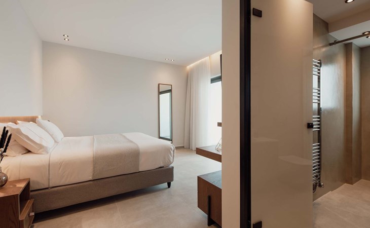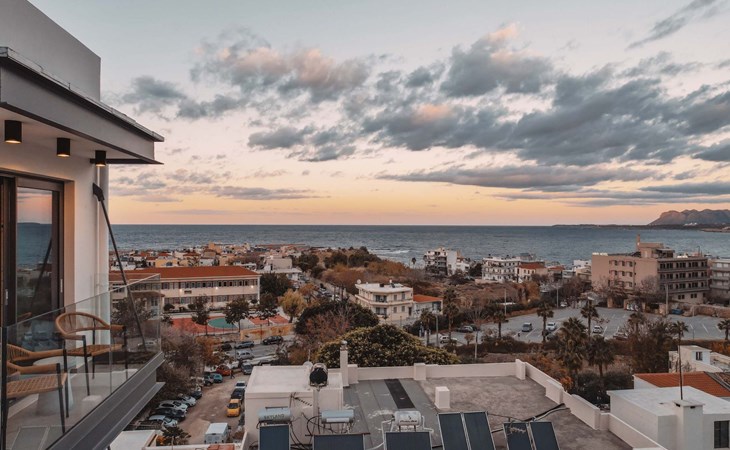 The stunning penthouse features generous indoor and outdoor areas that can host up to 6 guests generously featuring lavish design, supreme amenities handcrafted furniture, an exuberant living room, and a dining area on the upper floor, completing the utopian hideaway. Set across two floors, on the 5th and 6th floors of a new building, the owners have styled each room to feel like an immersive sanctuary. On the entrance floor, there is the open-plan living accommodation with a living area with a satellite TV, a modern fireplace for perfect cosy nights, a dining area, and a fully equipped, fitted, and modern kitchen. The large windows create the illusion of transparency allowing for a flood of Cretan sunshine to illuminate the room. When you reach the lower floor through the elevator you will find 3 modern-designed bedrooms that themselves host queen-size beds with ensuite bathrooms offering complete autonomy and privacy. Next to the bedrooms, for your convenience, you can find a coffee bar with two coffee machines, a small fridge, and some tableware adequate to serve your needs. The property is filled with natural light and instyled with minimal furniture specially designed for this specific project. All the spaces in it offer an indelible mark on the visitor's heart. Its various luxury facilities, its generous stylish areas, its unique location, and its matchless natural beauty make the City Moment Penthouse the perfect opportunity for a high-quality stay and the ideal summer home.