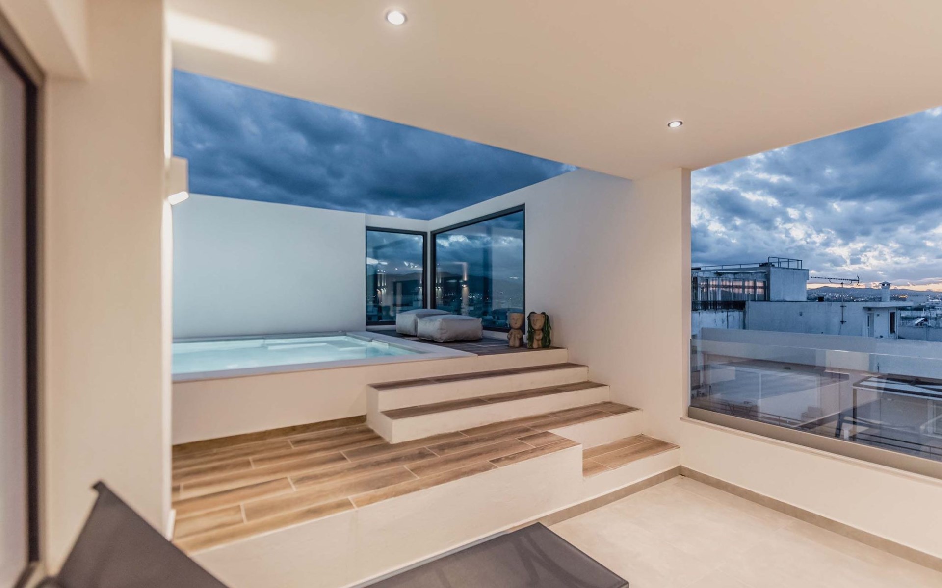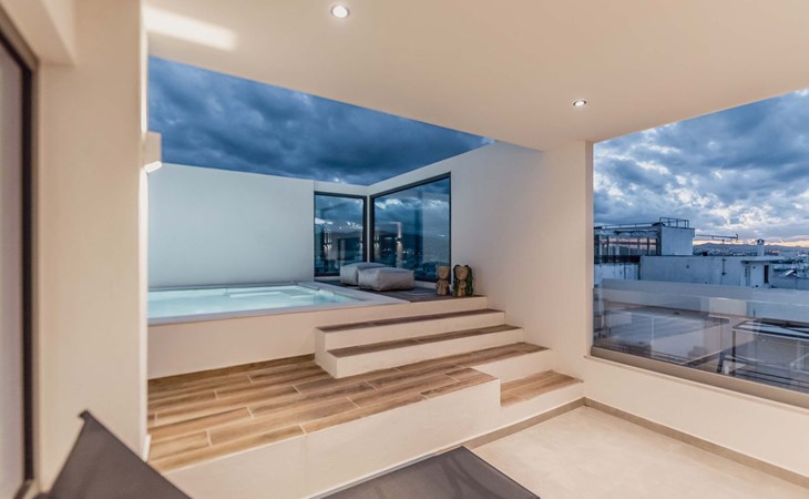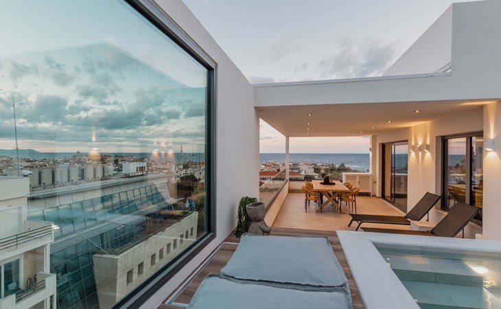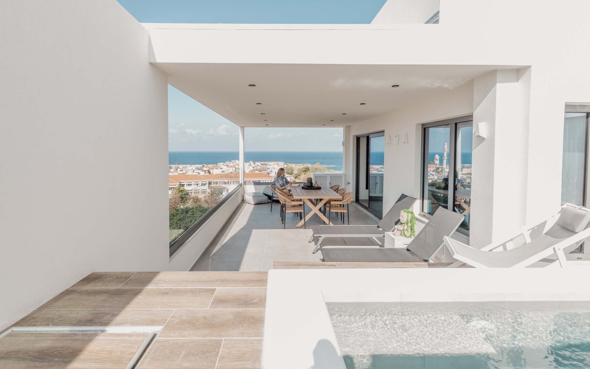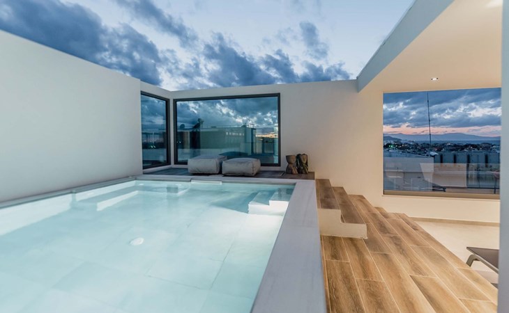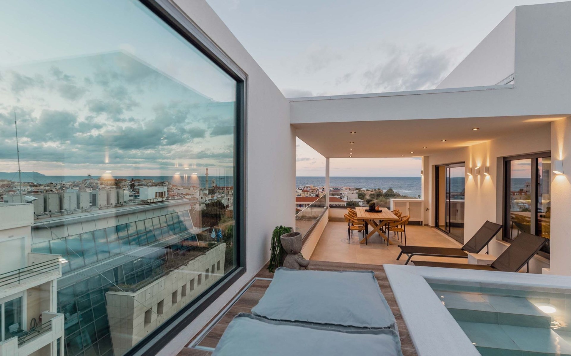 The refreshing outdoor private pool with the integrated jacuzzi is the best part of the residence where you can enjoy unspoiled moments of relaxation under the warm sun while blending harmoniously with the city view. The lounge and dining area for 6 guests is the perfect spot where residents can enjoy optimal habitation and a dazzling view from the sea, the town of Chania Town, and the White Mountains.