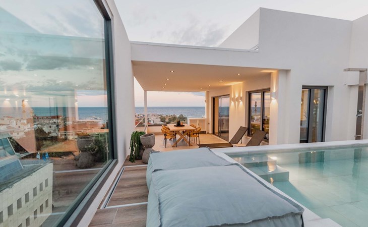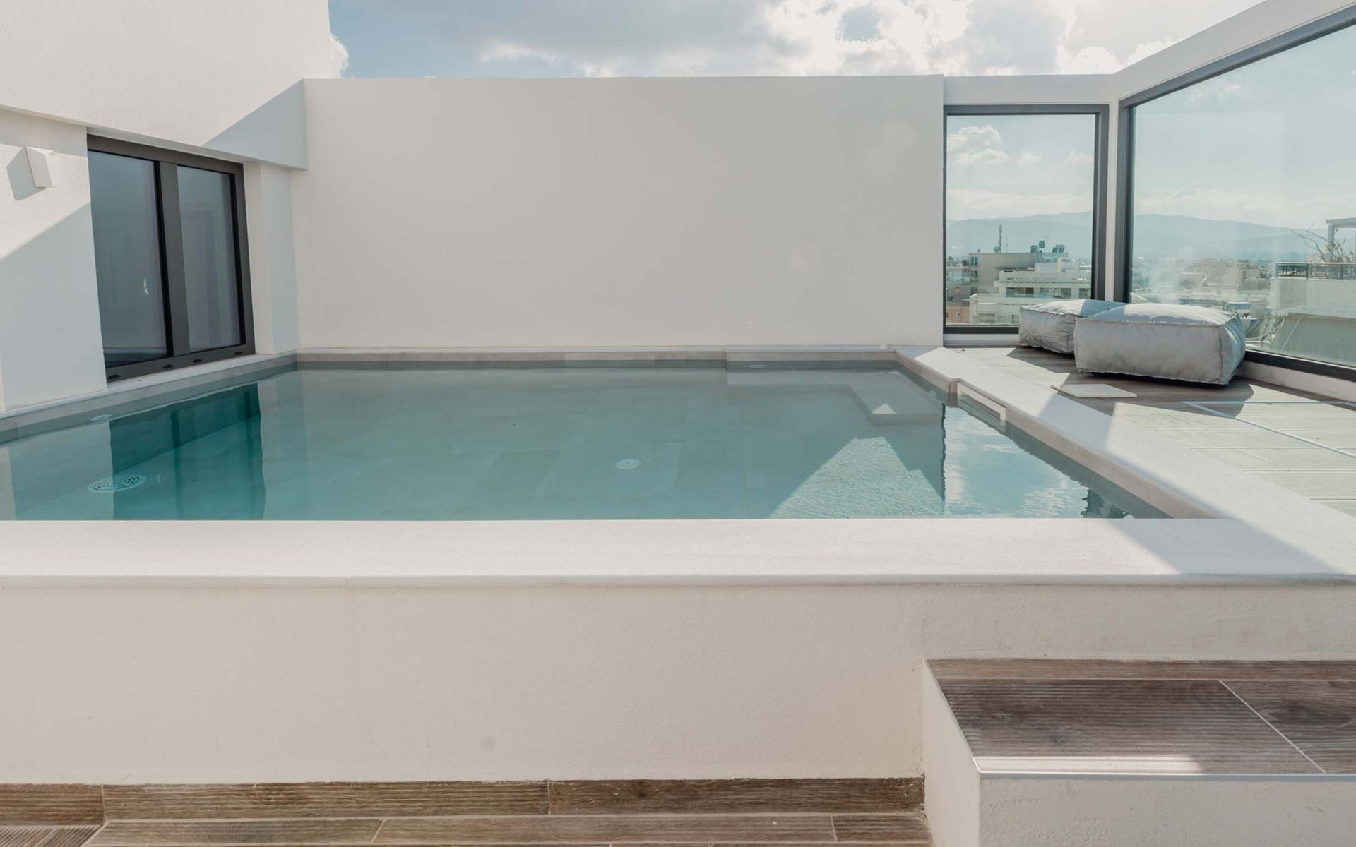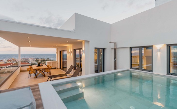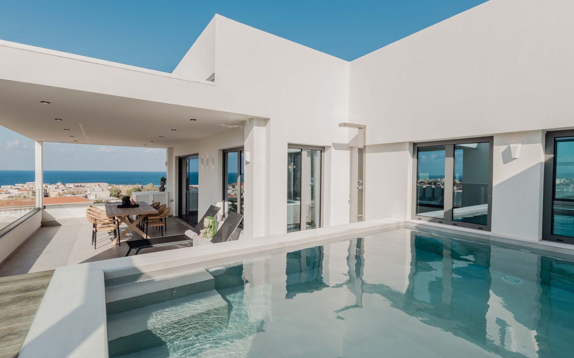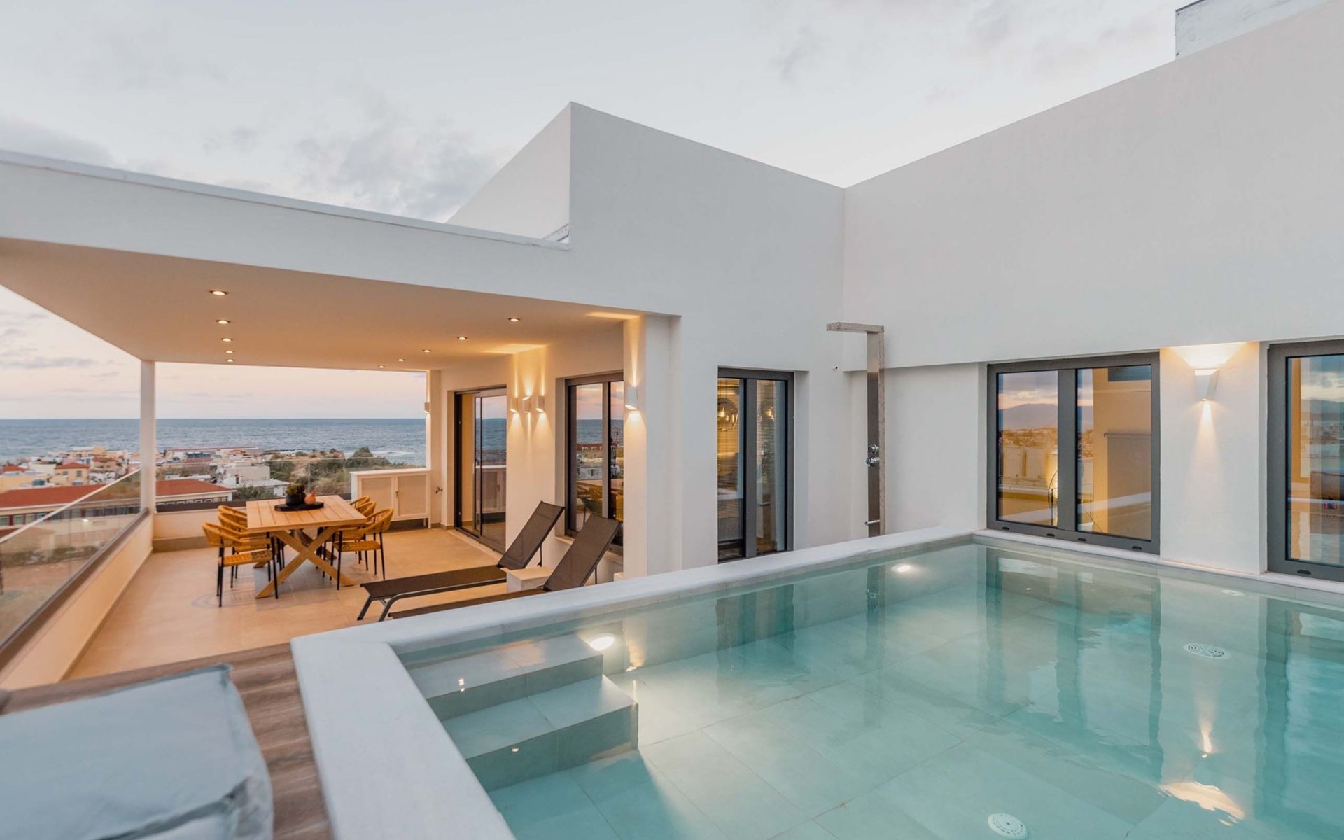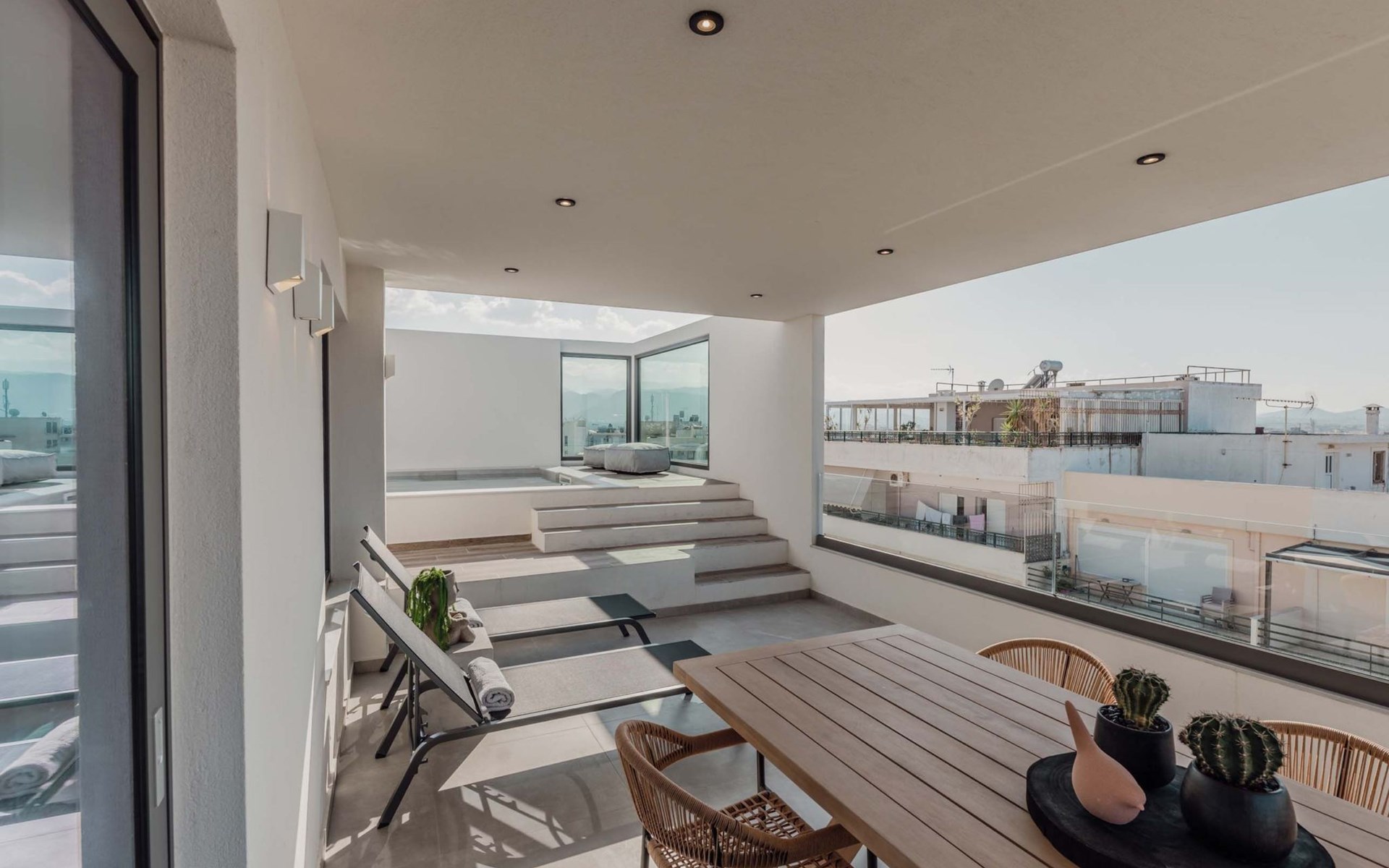 The refreshing outdoor private pool with the integrated jacuzzi is the best part of the residence where you can enjoy unspoiled moments of relaxation under the warm sun while blending harmoniously with the city view. The lounge and dining area for 6 guests is the perfect spot where residents can enjoy optimal habitation and a dazzling view from the sea, the town of Chania Town, and the White Mountains.
