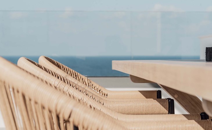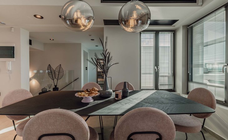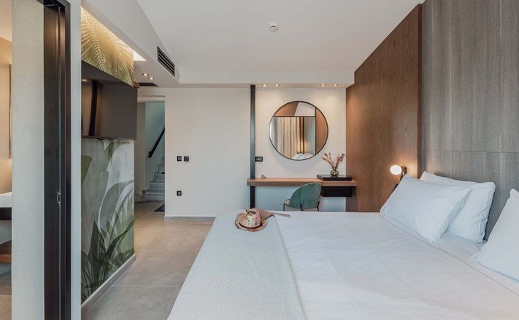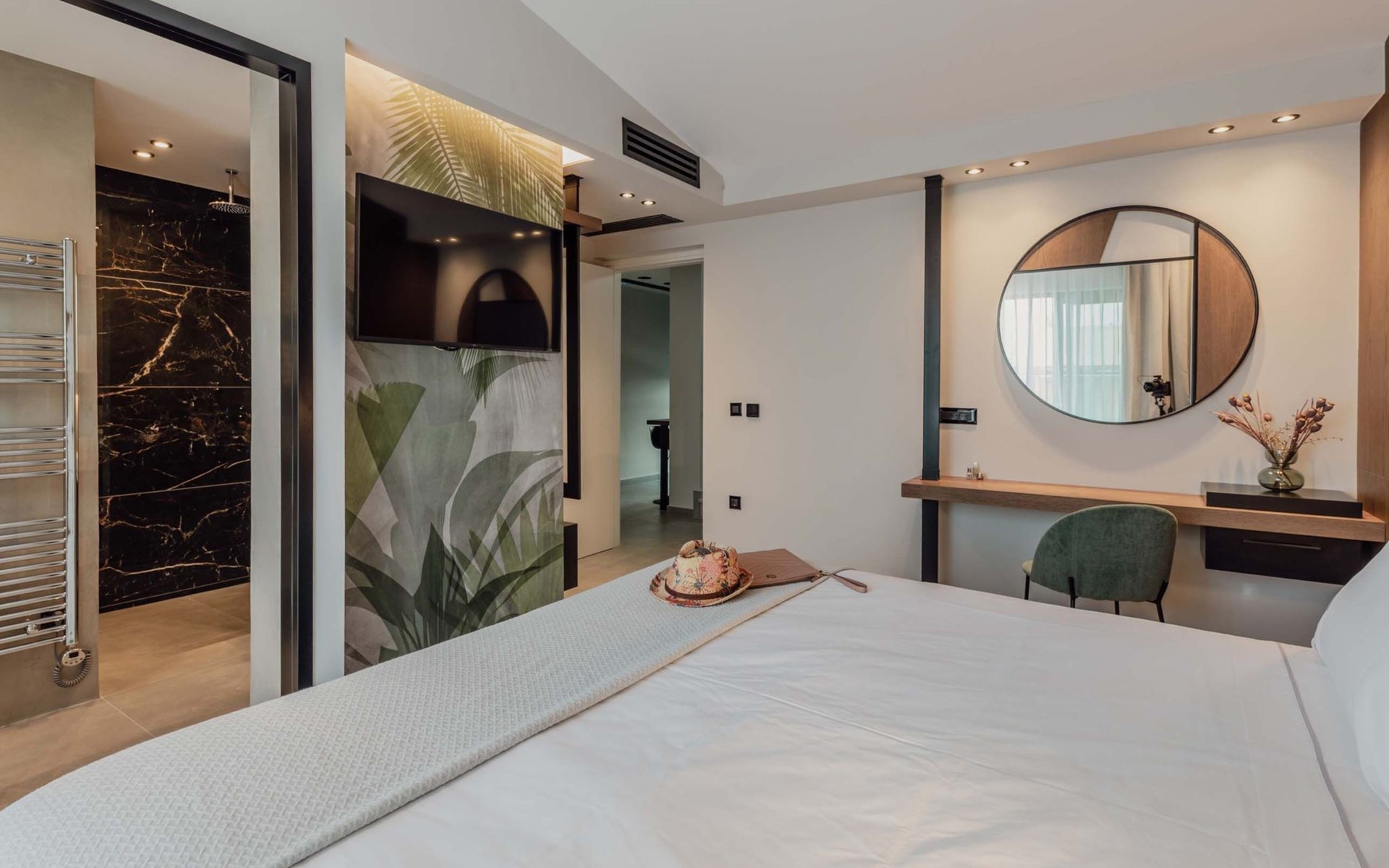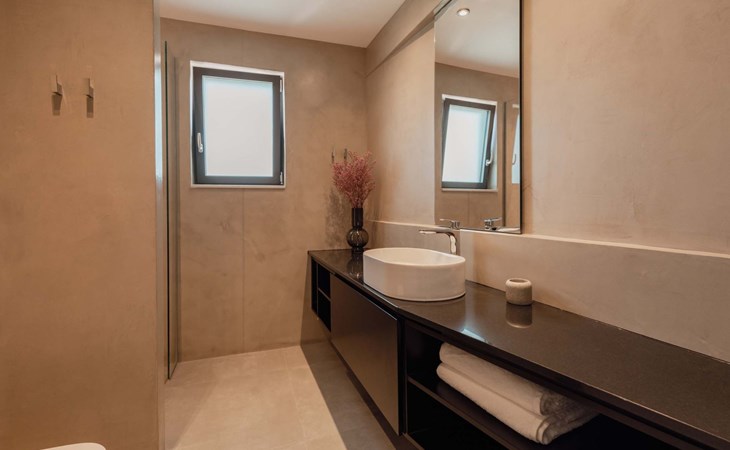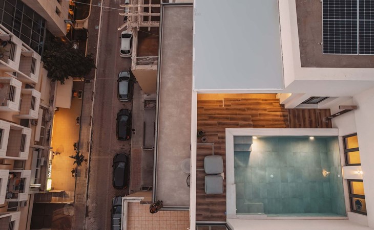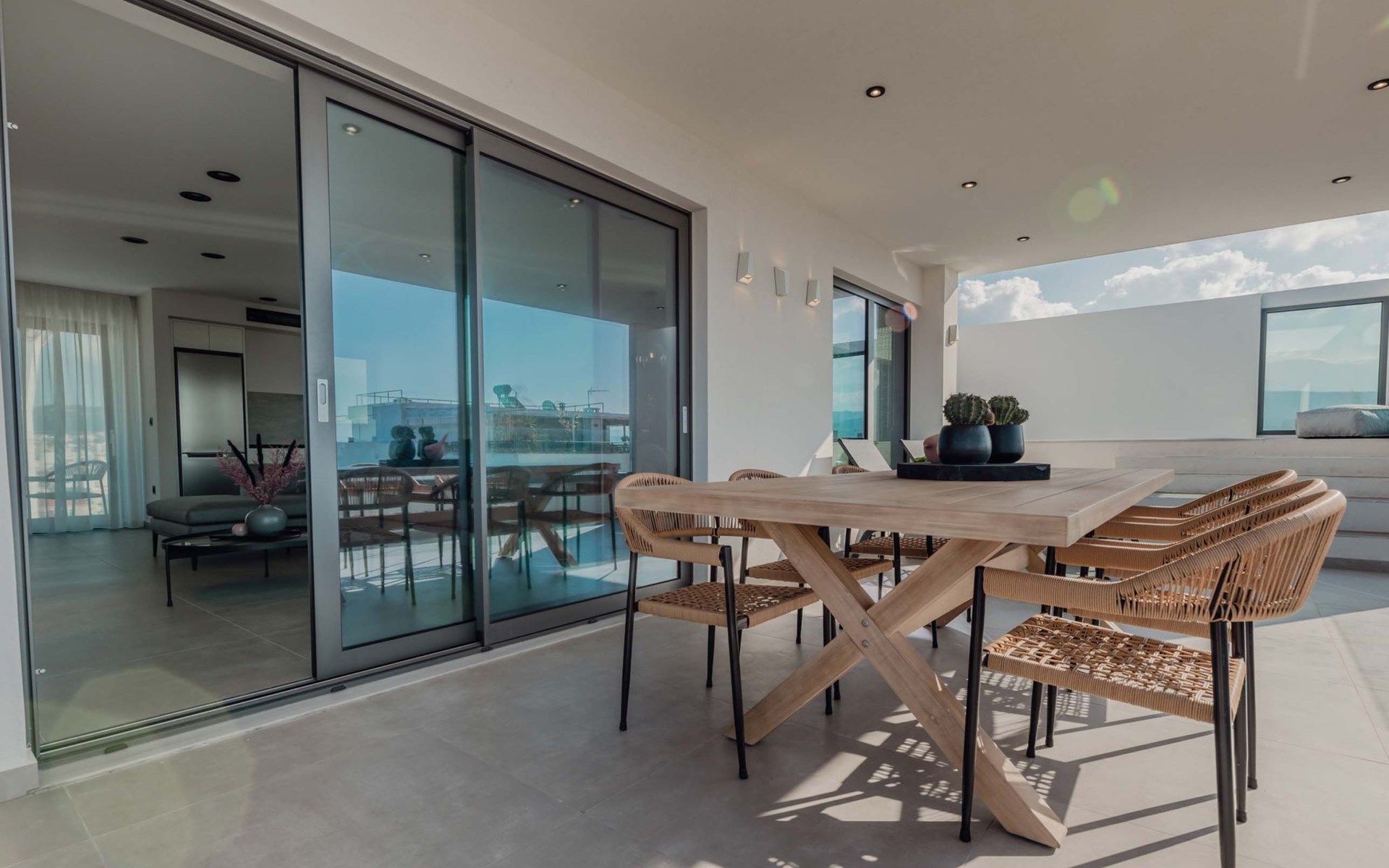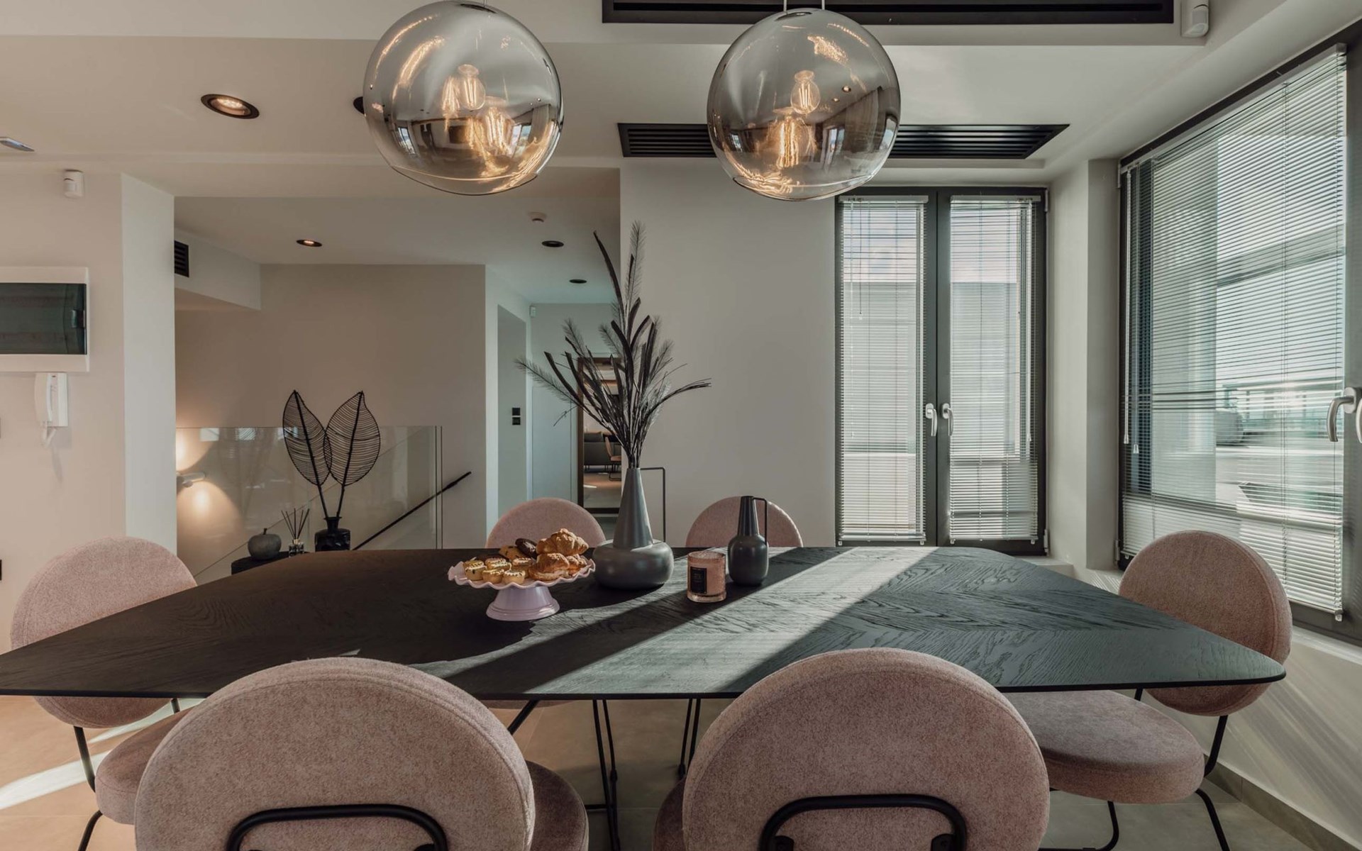 The refreshing outdoor private pool with the integrated jacuzzi is the best part of the residence where you can enjoy unspoiled moments of relaxation under the warm sun while blending harmoniously with the city view. The lounge and dining area for 6 guests is the perfect spot where residents can enjoy optimal habitation and a dazzling view from the sea, the town of Chania Town, and the White Mountains.