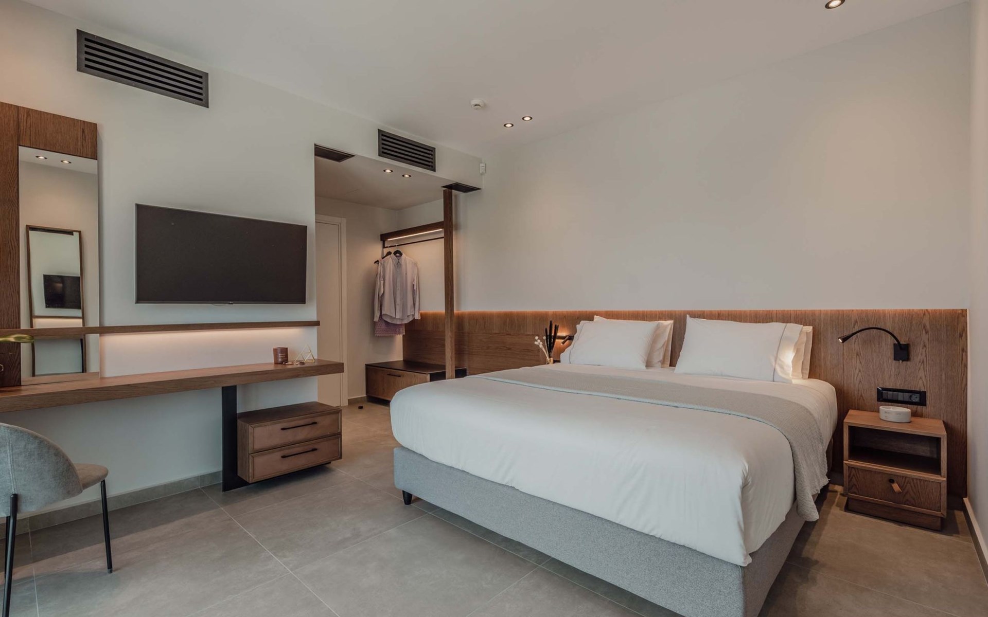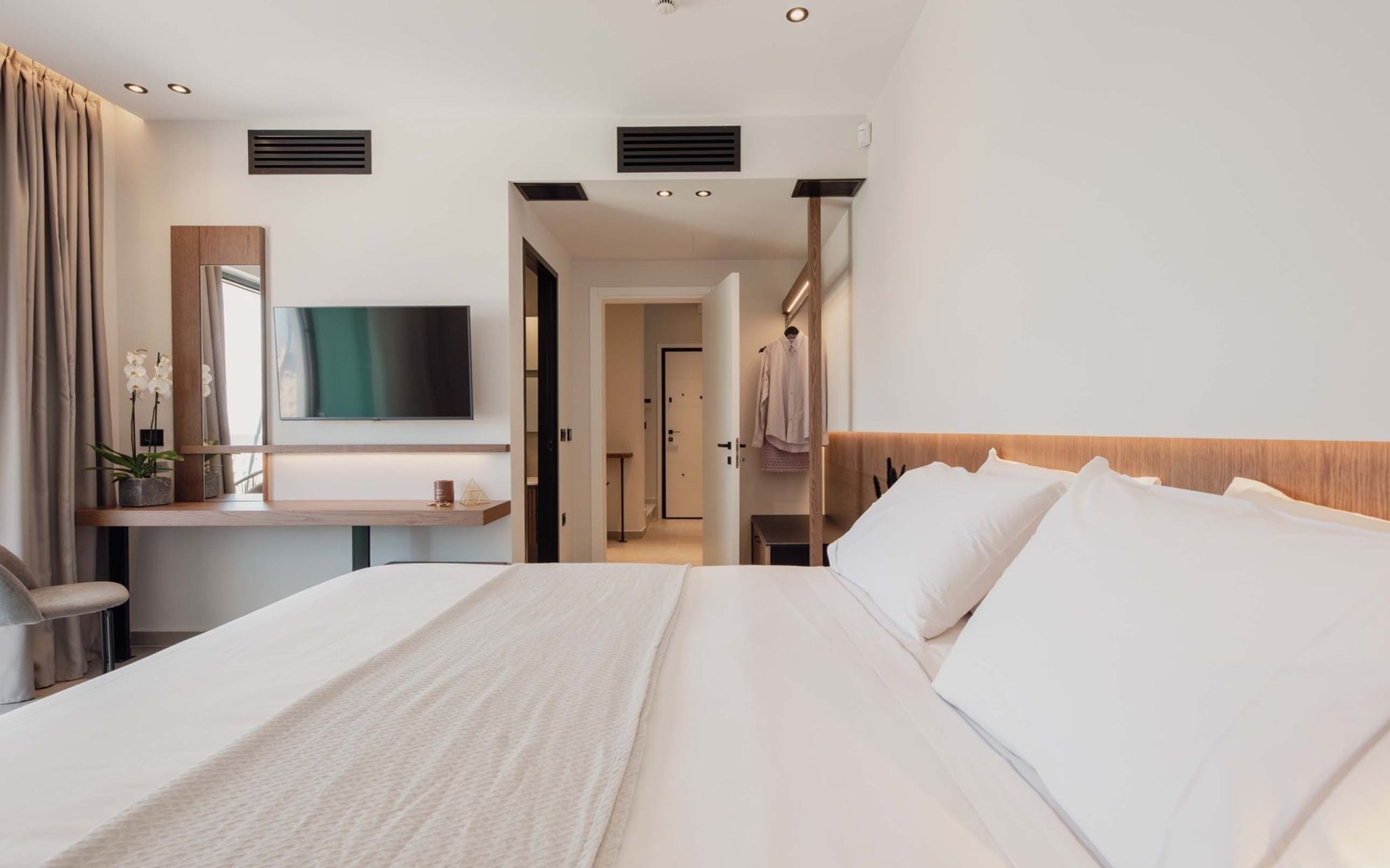 Bedroom 1: King-size bed (1.80* 2.00m), 42’’ Smart Satellite TV, A/C, open wardrobe, ensuite bathroom with a shower, balcony with city & sea view