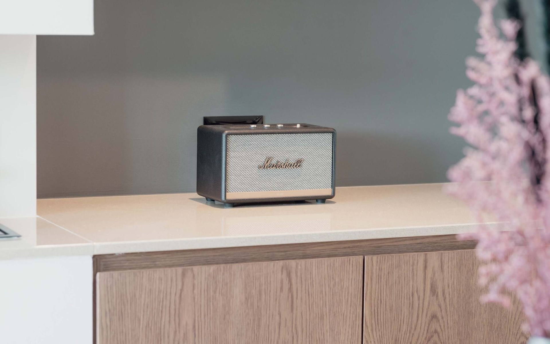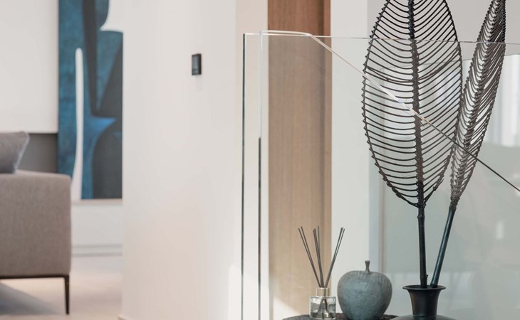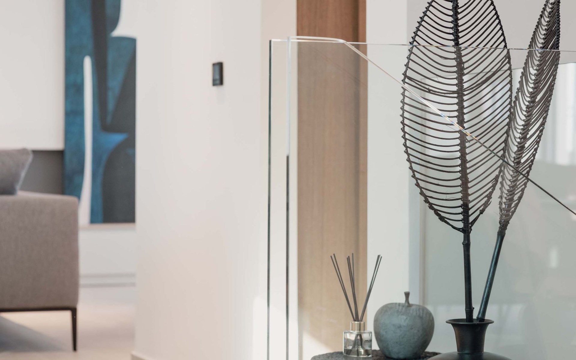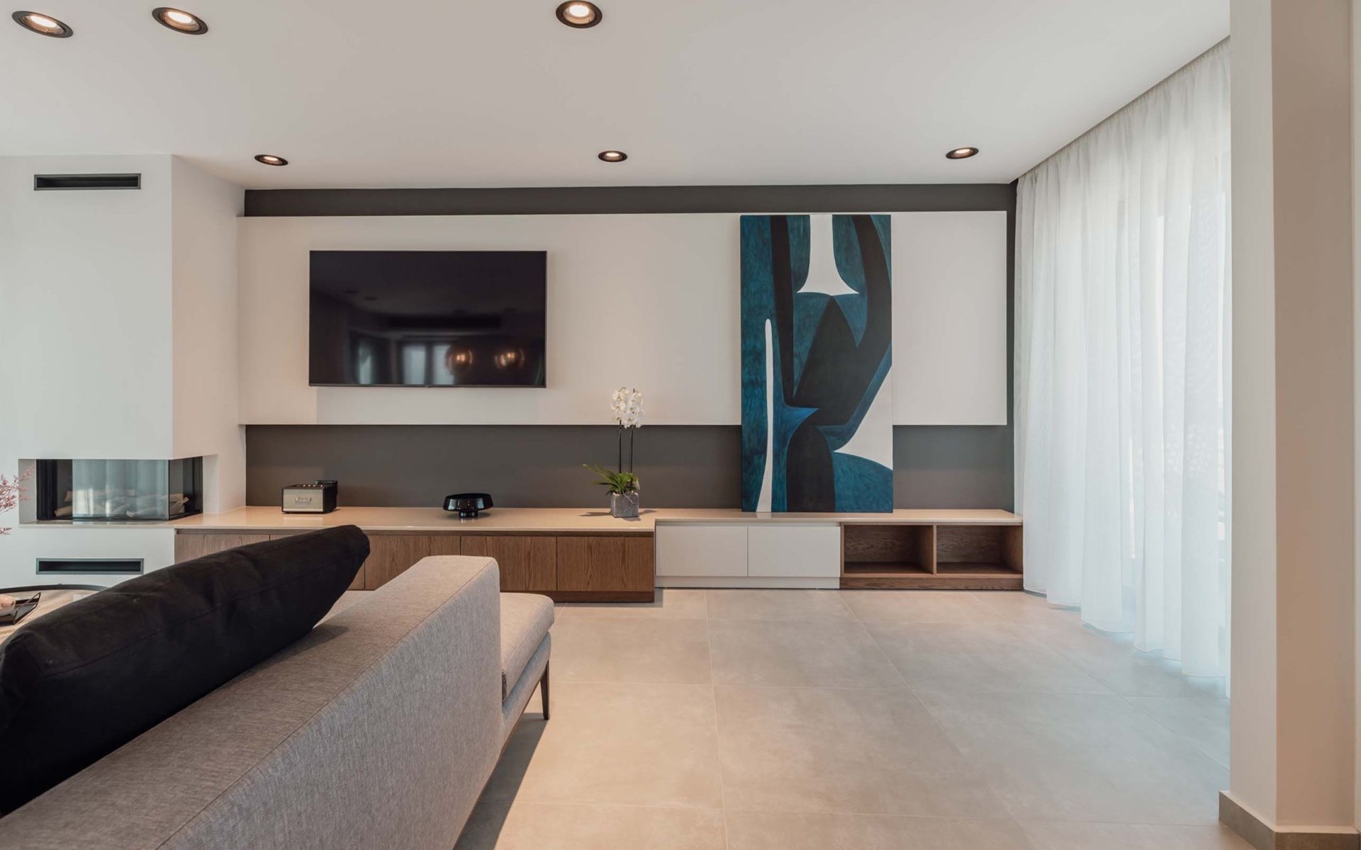 Living room with a sofa, 65’’ Smart Satellite TV, Bluetooth speaker Marschall, fireplace with gas, access to the pool terrace, sea & city view via large windows