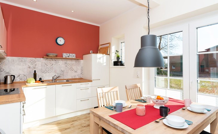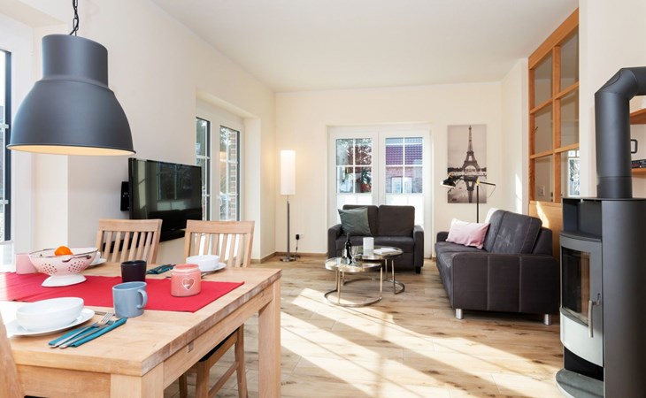 A cosy atmosphere awaits you inside the house, supported by the warming underfloor heating, which ensures comfort in every room. The technical equipment also leaves nothing to be desired: A Smart TV invites you to enjoy relaxing film evenings, while the washing machine for your sole use and a fully equipped kitchen with ceramic hob, dishwasher, filter coffee machine and kettle make your everyday life easier. Not forgetting the changing table, which is so important for child-friendly accommodation, and the inviting fireplace, which provides cosy warmth and comfort.