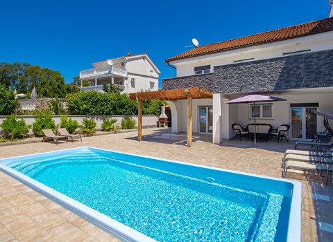 Welcome to our pristine holiday home, nestled in the heart of Preko on the enchanting island of Ugljan. This newly constructed residence, complete with a heated private swimming pool, promises an unforgettable getaway experience. Ugljan stands out for its seamless connectivity to Zadar via frequent ferry and boat services, with the international airport just a short distance from the ferry terminal. Revel in the luxury of direct views to the crystal-clear sea and enjoy the convenience of being just a 3-minute stroll from the acclaimed Blue Flag-certified Jaz Beach.Inside, the house boasts contemporary elegance with 4 stylish bedrooms and 3 sophisticated bathrooms, designed for your comfort. The interiors feature high-end Grohe and Laufen fixtures, prestigious designer tiles, and sleek glass shower doors, complementing the quiet-mode air conditioning available in every room for a restful sleep. The main living space is an open-plan area, equipped with an ultra-modern DanKüchen kitchen, offering top-tier appliances and all the amenities necessary to prepare gourmet meals. For added convenience, high-speed Starlink Wi-Fi is accessible throughout, alongside a dedicated workspace in the basement, furnished with a desk, monitor, and ergonomic chair for those needing to stay connected.The exterior of this holiday haven is equally impressive. Enclosed within a fully fenced spacious yard adorned with lush greenery, guests can enjoy the solar-powered shower, the stone BBQ area equipped for both meat and fish, and dine al fresco on the ground-floor terrace, large enough to host up to 10 guests. The rooftop terrace affords panoramic 360° views, perfect for soaking in the breathtaking scenery or entertaining under the stars. Both the pool terrace and the living room are fitted with ceiling Bluetooth speakers to enhance your outdoor and indoor leisure moments.Situated across from the island's largest supermarket and café, this location couldn't be more ideal. Steps away from Jaz Beach, the largest sandy beach in Preko, and a short car ride from essential services like a first aid clinic, pharmacies, and a dental office, convenience is at your doorstep. With complimentary wooden sun loungers on all local beaches and a scenic road opposite the house leading to trails ideal for walking, hiking, and cycling, the promise of adventure and relaxation is ever-present.Our holiday home is the epitome of modern luxury and convenience, designed for those seeking an unforgettable island retreat. Whether you're indulging in the comfort of our elegant interiors, basking in the serenity of our lush garden, or exploring the vibrant environment of Ugljan, every moment promises to be exceptional. Secure your stay with us for a journey filled with relaxation, adventure, and picturesque views at every turn.
