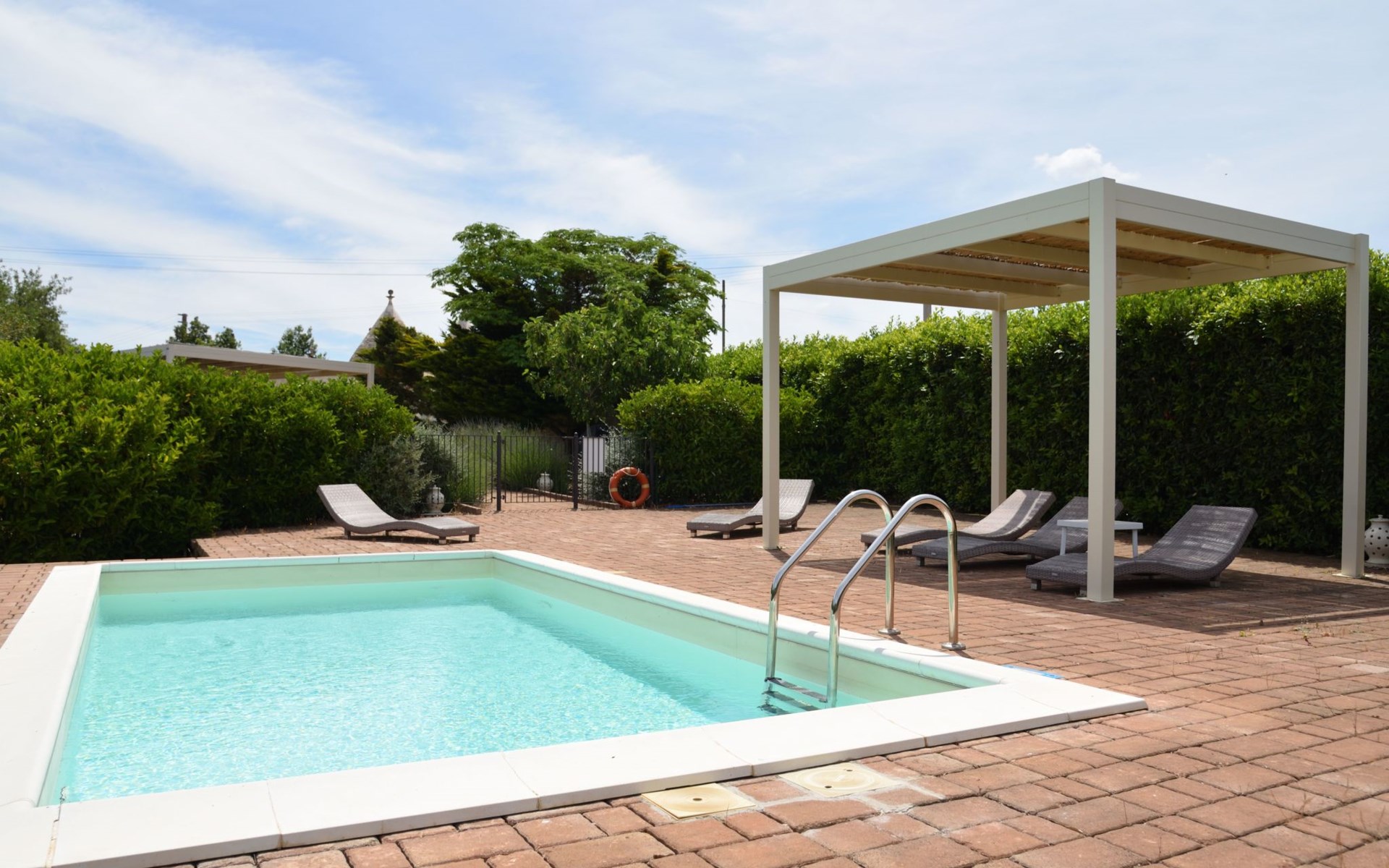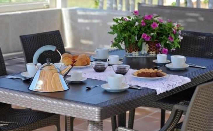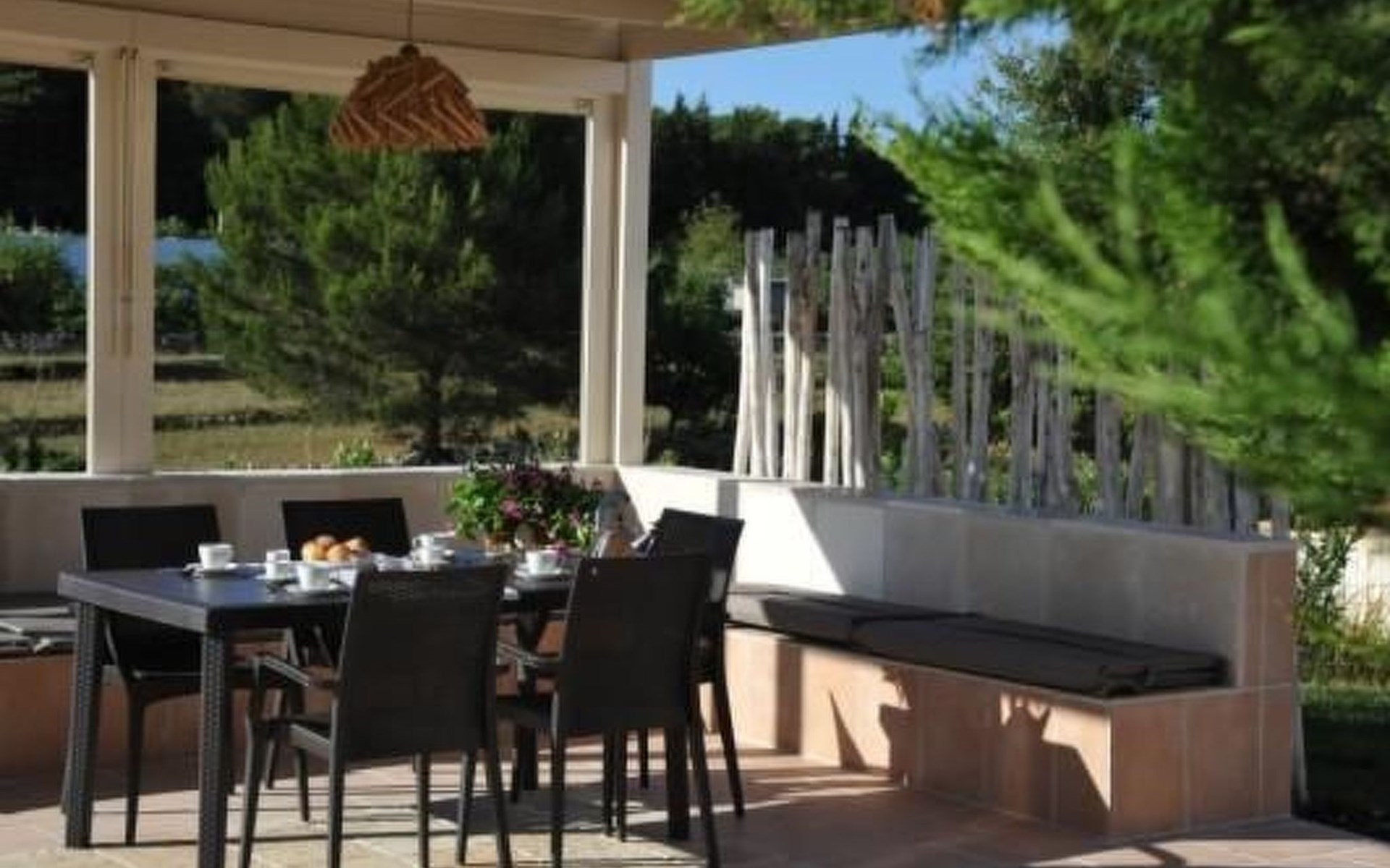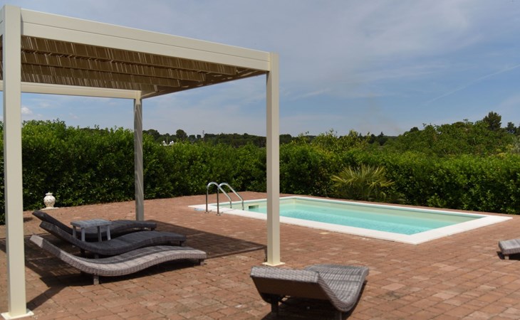 Outside (completely fenced) there is a large pergola with a table, chairs and a barbecue. There is also a 7 x 4m swimming pool for your own exclusive use. Around the pool there is a sun terrace with two parasols, five loungers and an outdoor shower. The pool is completely fenced and accessed via a gate. In a small corner there is also a small vegetable garden. A private, roofed car parking space is provided. A whirlpool, a small fitness room, bicycles, a laundry room with a washing machine (payable) and a large, completely fenced garden with typical Mediterranean plants and fruit trees are available for shared use.