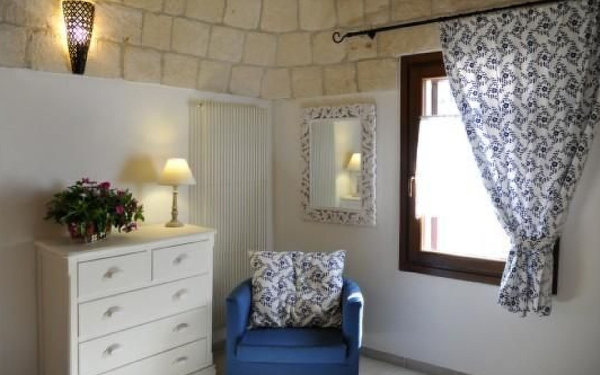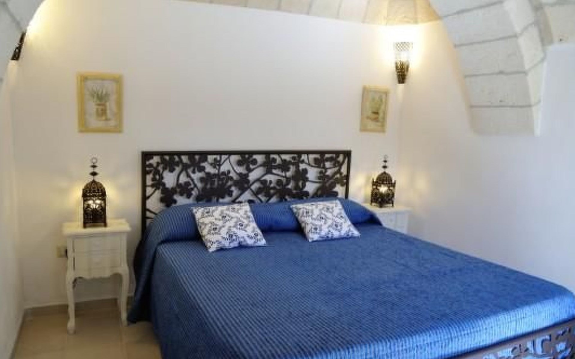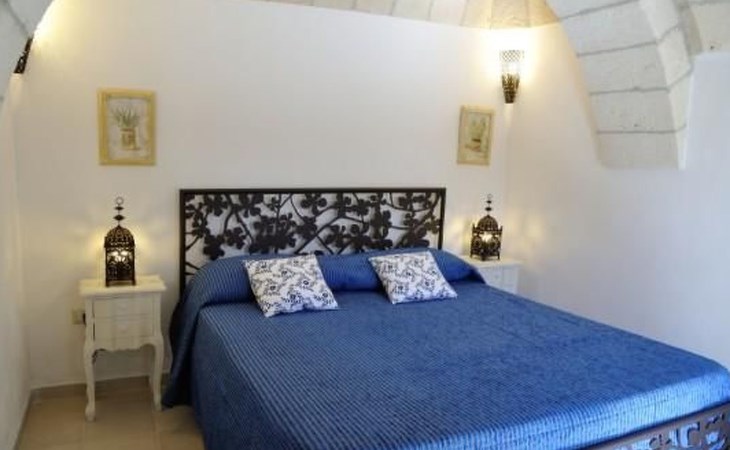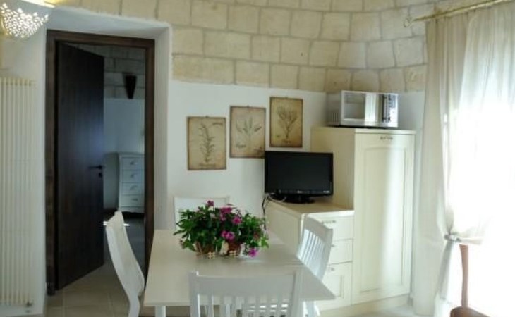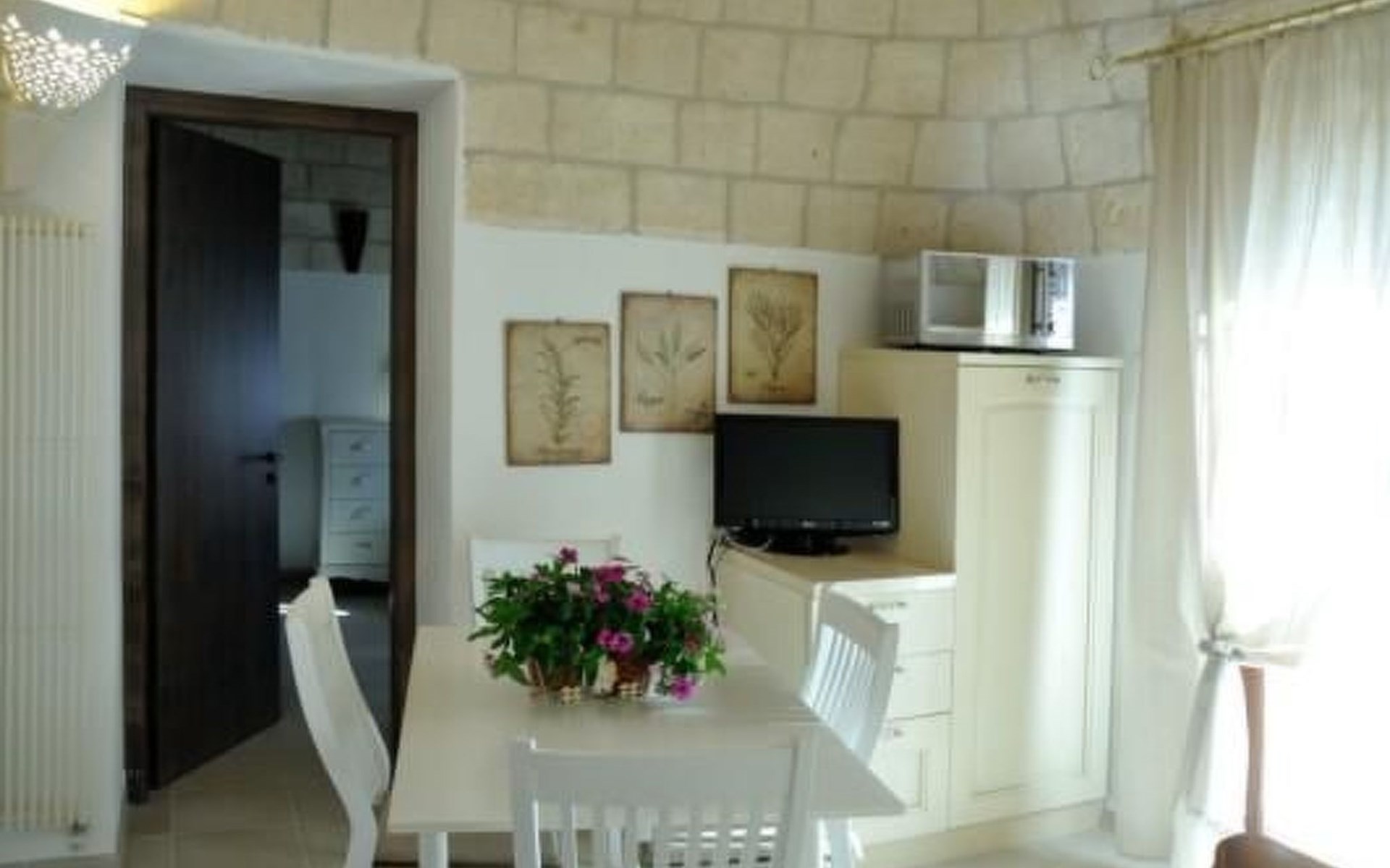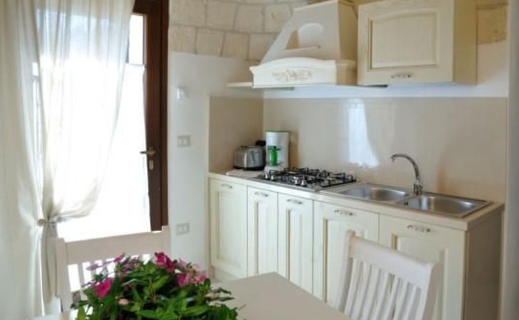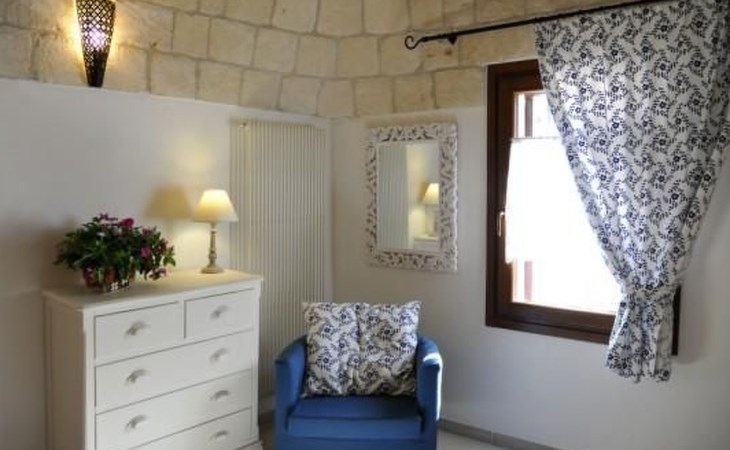The trullo of around 60m² has a bathroom with a shower, a bedroom with a double bed (180 x 200cm) and a bedroom with two single beds (90 x 200cm) that can be joined together as a double bed on request. Both bedrooms feature a shabby chic décor and each have a wardrobe, bedside tables, a dresser, an armchair and a TV (satellite reception). There is also a living room-kitchen with a table and chairs. The kitchen is equipped with a gas stove, microwave, coffee machine, dishwasher, toaster, kettle and fridge. The trullo was renovated in 2014, observing local traditions and new insulation techniques, which ensure a pleasant indoor climate during the hot summer months. The trullo is accessed via an electric gate. Wireless Internet access is available (max. 2GB per week).