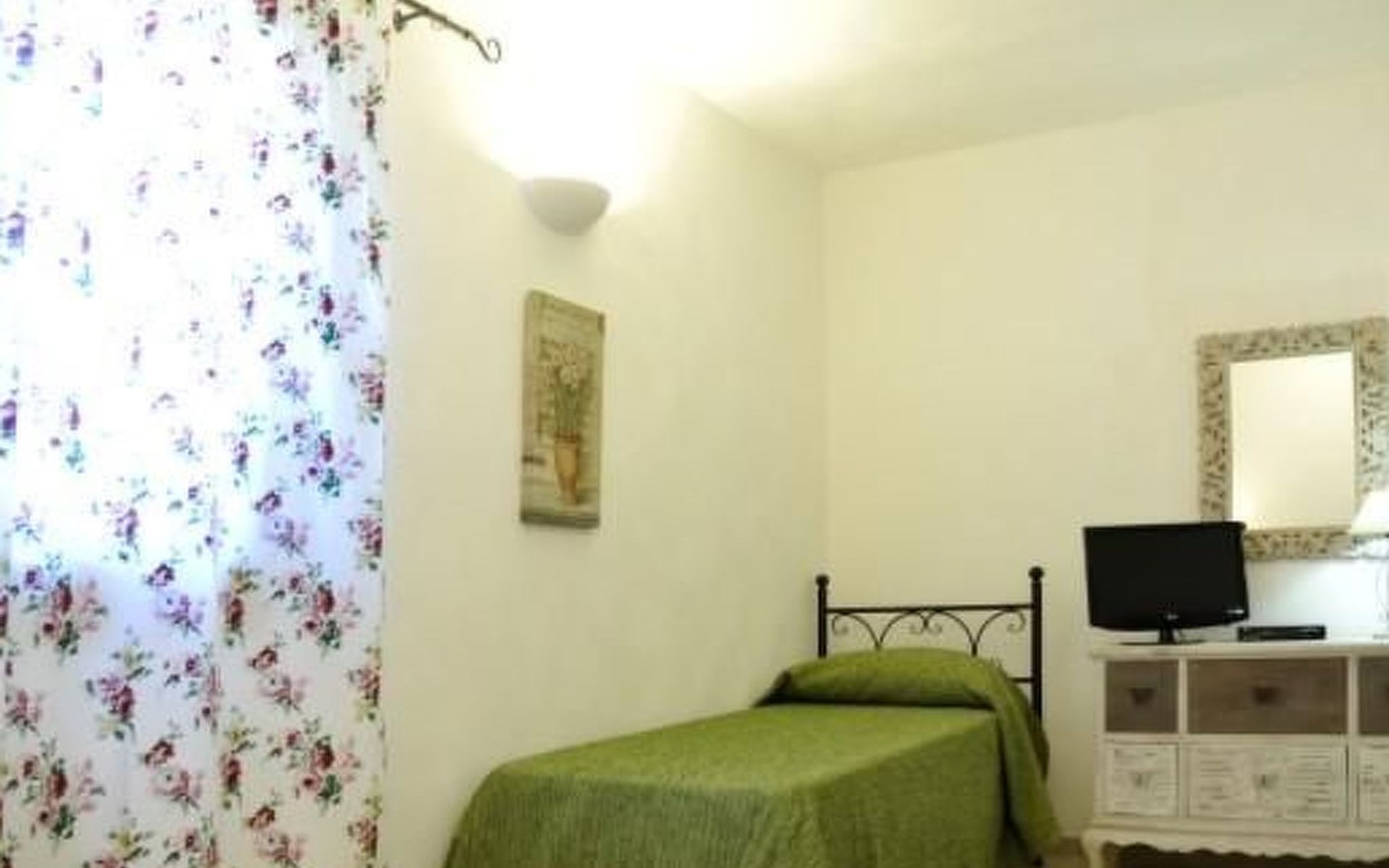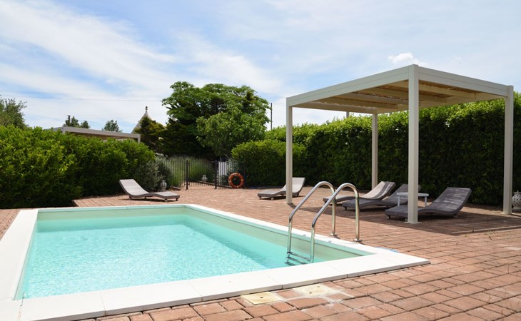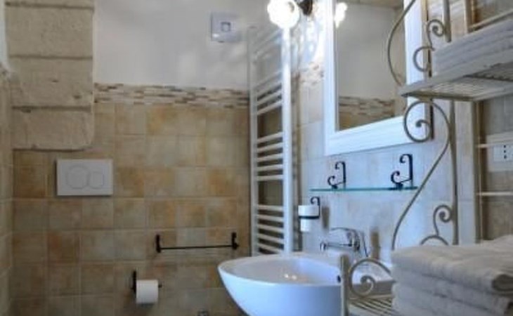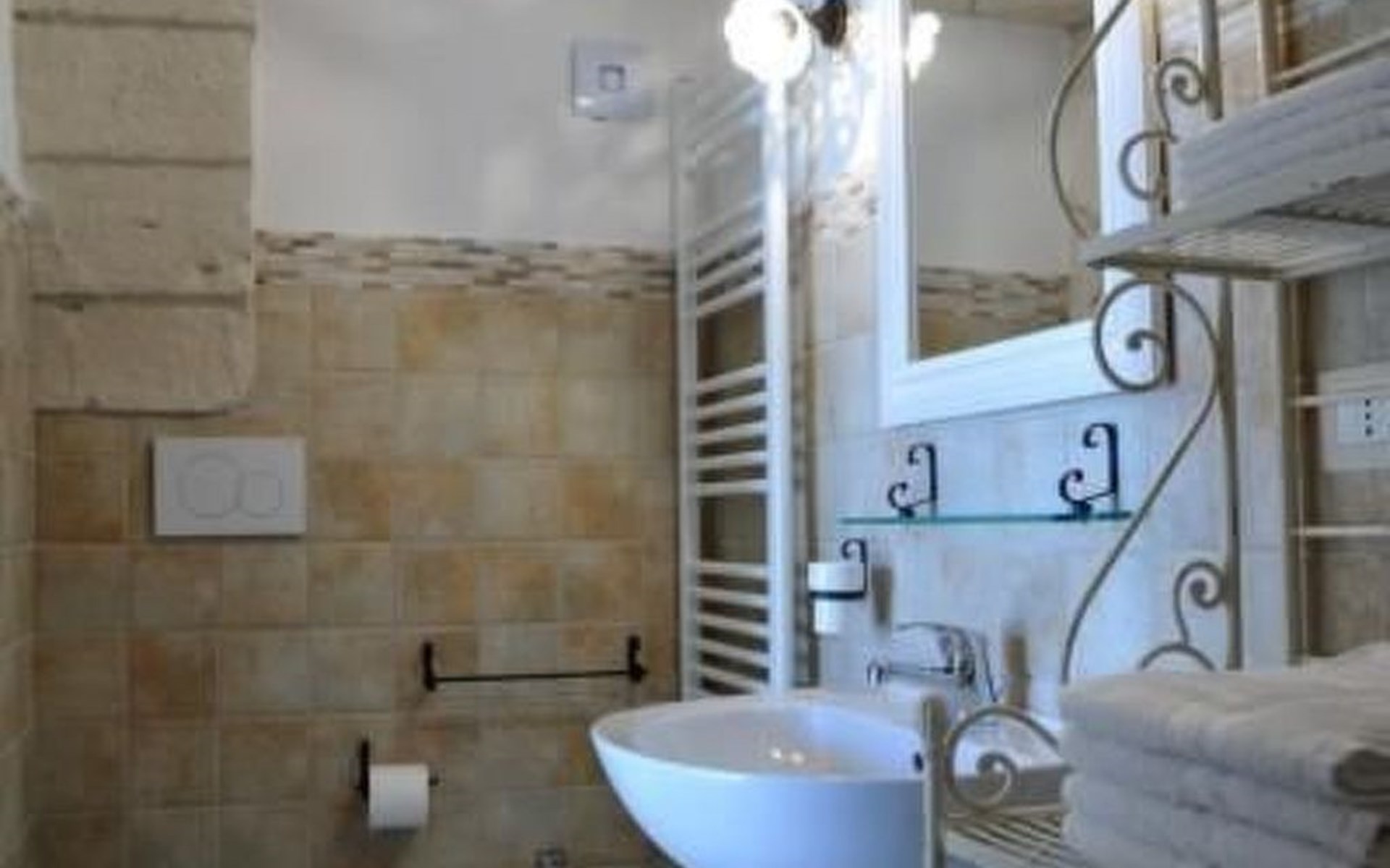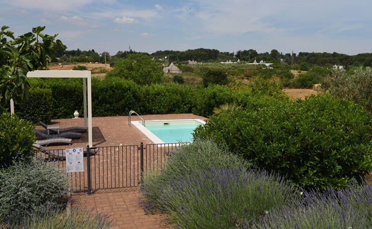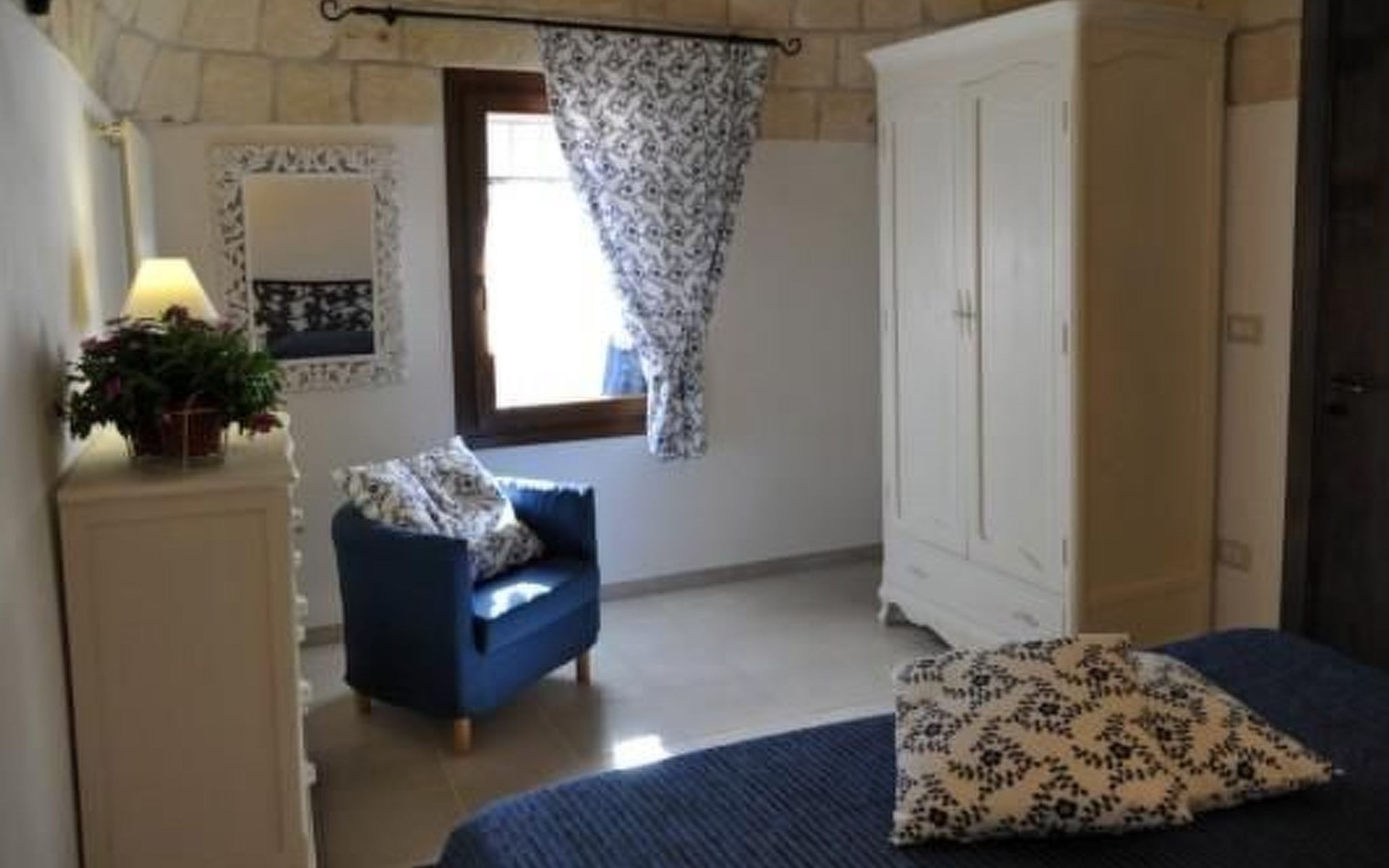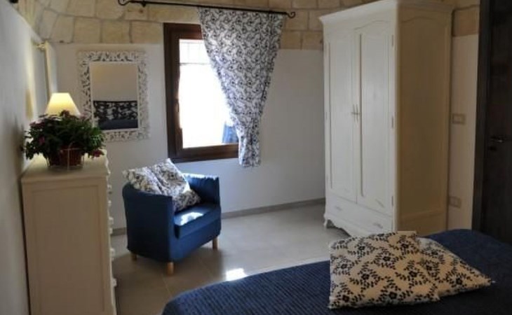 The trullo of around 60m² has a bathroom with a shower, a bedroom with a double bed (180 x 200cm) and a bedroom with two single beds (90 x 200cm) that can be joined together as a double bed on request. Both bedrooms feature a shabby chic décor and each have a wardrobe, bedside tables, a dresser, an armchair and a TV (satellite reception). There is also a living room-kitchen with a table and chairs. The kitchen is equipped with a gas stove, microwave, coffee machine, dishwasher, toaster, kettle and fridge. The trullo was renovated in 2014, observing local traditions and new insulation techniques, which ensure a pleasant indoor climate during the hot summer months. The trullo is accessed via an electric gate. Wireless Internet access is available (max. 2GB per week).