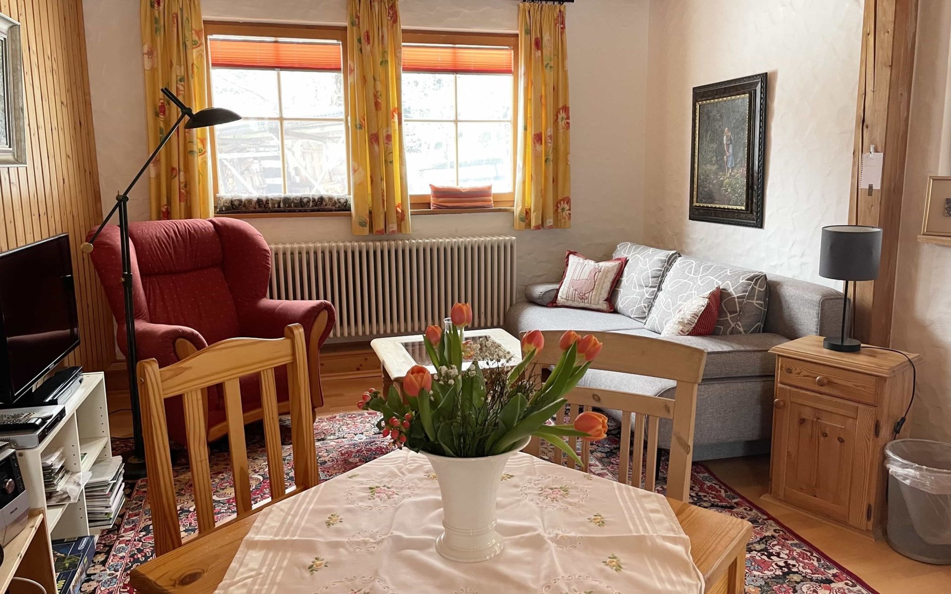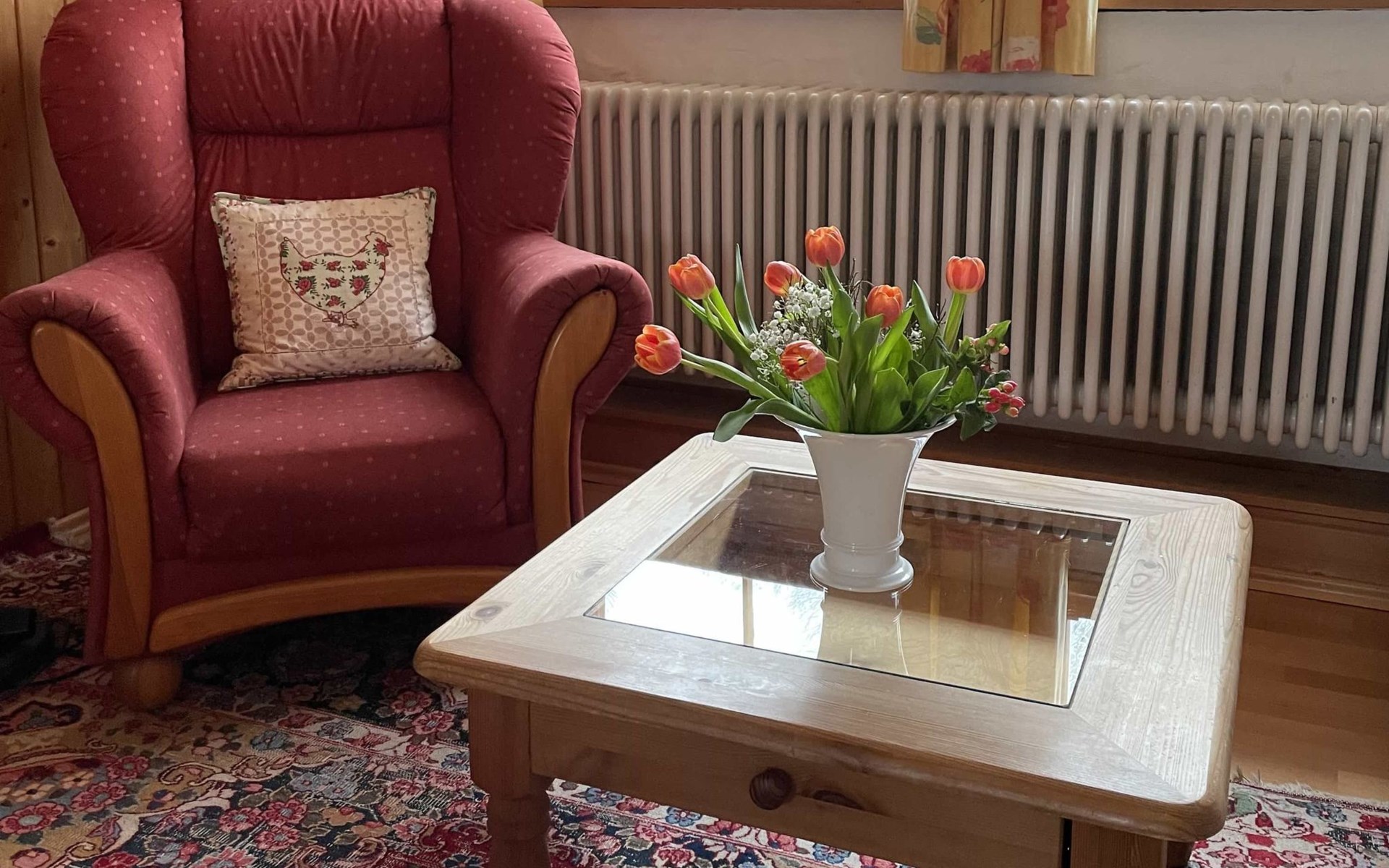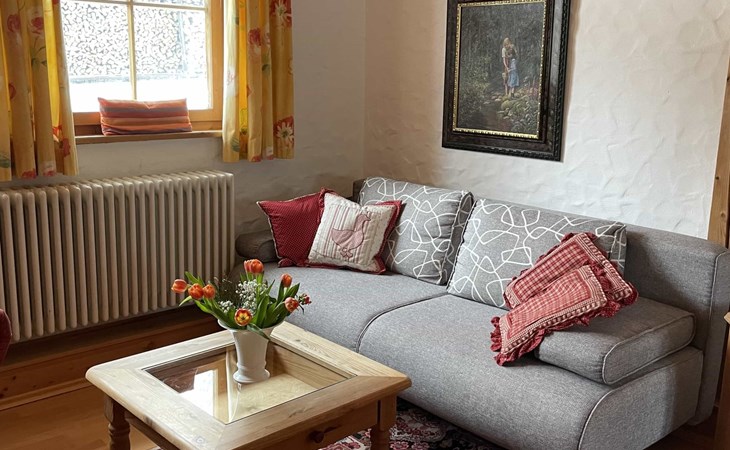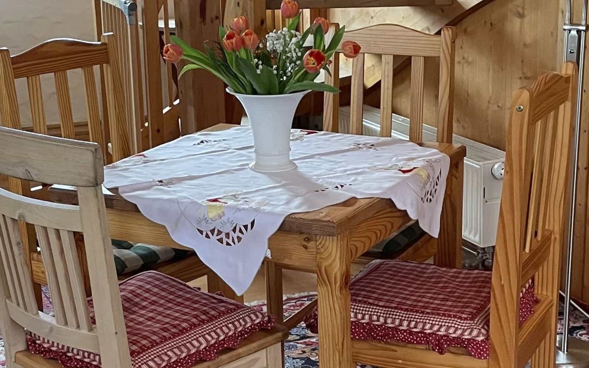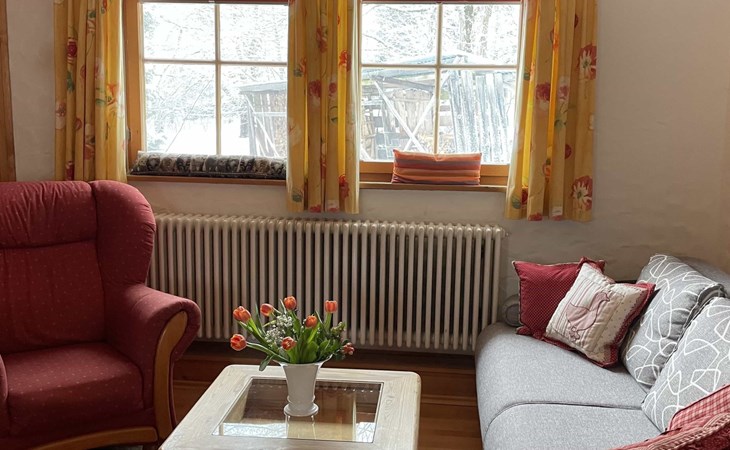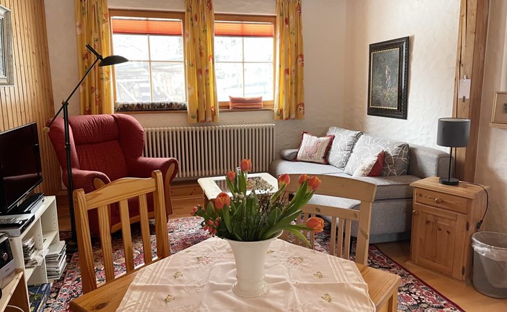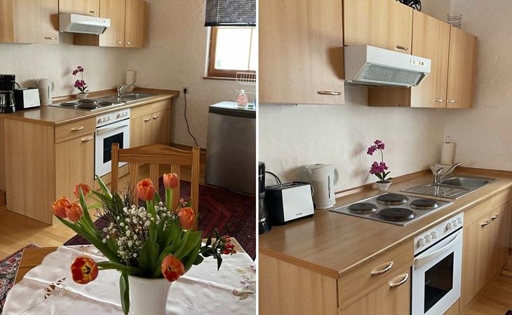 The lovingly furnished holiday flat offers many opportunities for relaxation and socialising. The entrance to the approx. 50m² holiday flat is on the ground floor of the house and offers space for two to three people. In the open-plan living, dining and cooking area you will find a fully equipped kitchenette. In addition to all the important kitchen utensils, there is also a toaster, a kettle, an electric hob and an oven. The dining table not only invites you to eat together but also to socialise. In the adjoining living area, a sofa corner with a TV invites you to linger. The sofa can also be used as a sofa bed (185cm x 125cm). A staircase takes you to the first floor, where you will find the cosy bedroom with a double bed. The shower room with hairdryer and WC completes the offer.