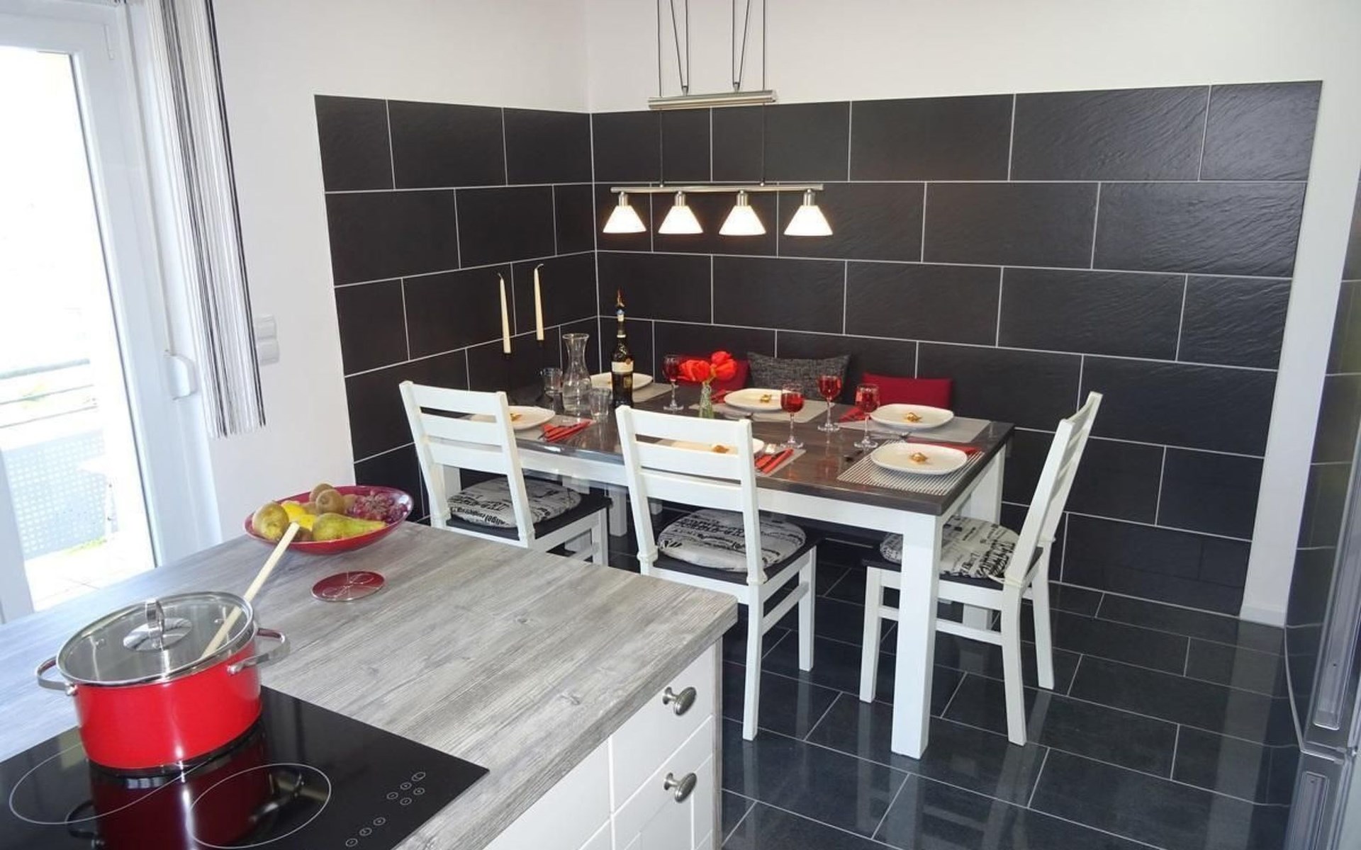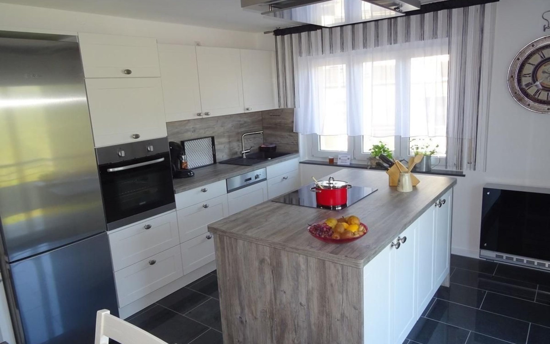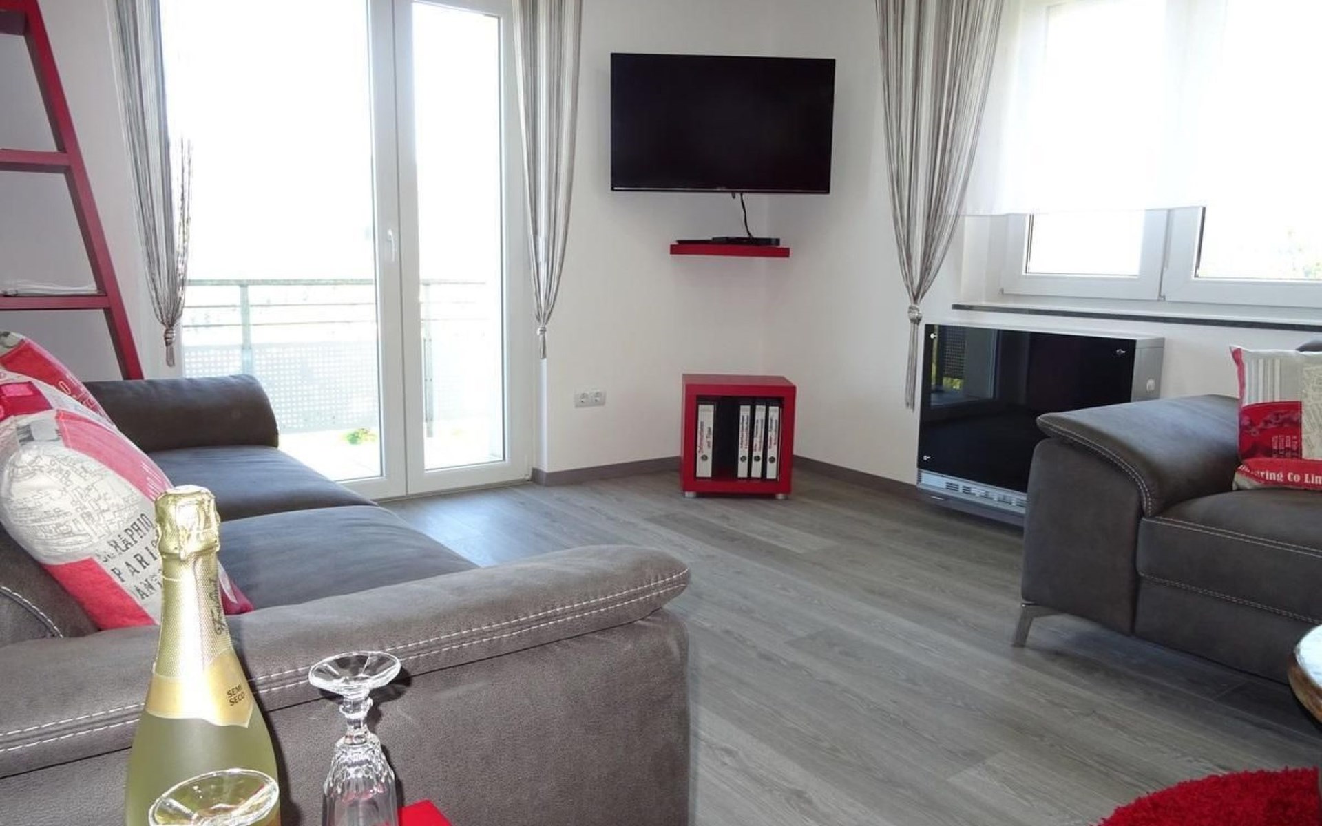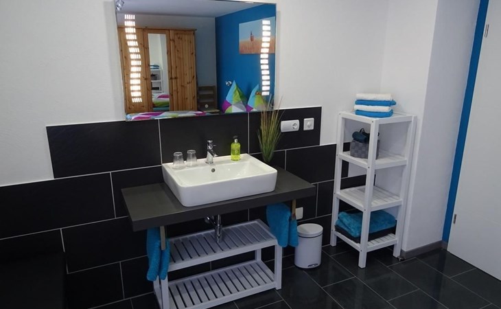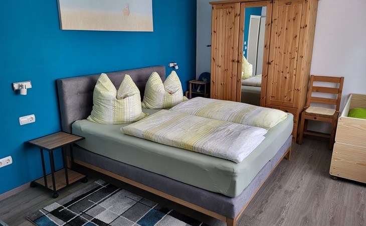 The spacious 100 m² flat offers everything you need for a comfortable stay. With a living room equipped with satellite TV and two comfortable sofas, two bedrooms with double beds (one including a cot and washing facilities) and a further bedroom with two single beds and TV, this accommodation leaves nothing to be desired. A fully equipped kitchen with a large cooking island, electric cooker, fridge, dishwasher, microwave and more, as well as a dining area provide the perfect basis for cosy cooking evenings. The bathroom has a walk-in shower and hairdryer, the WC is separate. Balconies, WLAN, stereo system, bed linen and towels are also included for your comfort.