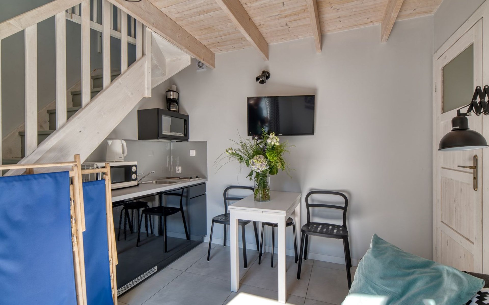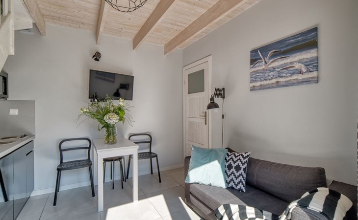 Your private, separate terrace has garden furniture and a table. You can also use your deckchairs and beach tent.Outside, in the well-kept natural-style garden, there are hammocks on racks, a place to prepare the barbecue or a playground for our youngest guests (trampoline , pirate castle, swings, slide and sandpit). The whole area of the resort is fenced, so children can play merrily and parents can rest assured of their safety. There is 1 free parking space for your car.