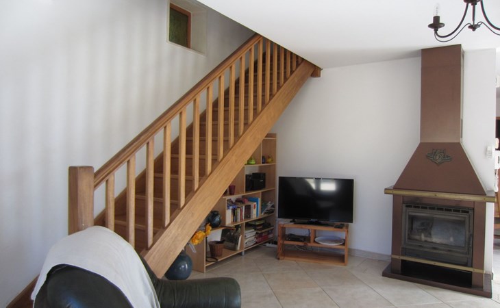 The 150 m² gîte has been completely renovated with stone walls and exposed beams. All the rooms in the house face south, with only the bathrooms and WCs facing north. On entering, on the ground floor, you find the very bright lounge with its two windows to the outside, furnished with a three-seater sofa and two armchairs. To the right is the fireplace, followed by the television area with international channels (German), the bookcase with the hi-fi system and, at the far end of the room, the wooden staircase to the first floor. To the right is the well-equipped kitchen with its large dining table and appliances (fridge with freezer compartment, microwave, dishwasher, three-element gas hob plus electric hob, large electric oven, coffee maker, kettle, toaster). To the right of the kitchen is a bedroom with a 140cm bed, followed by the shower room with shower, WC and washing machine. Upstairs, there are three bedrooms. One has a 160 cm bed and a large cupboard with shelving and hanging space, which opens onto a balcony with two armchairs and a coffee table. The other two bedrooms each have two 90 cm beds, one of which has a large wardrobe with shelving, while the other has a wardrobe with shelving in the hallway. There is a bath in the bathroom. The WC is separate.