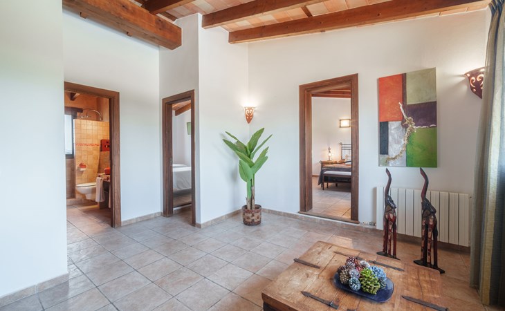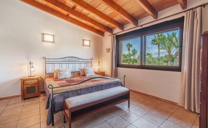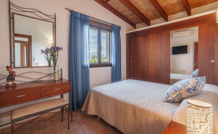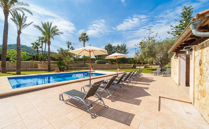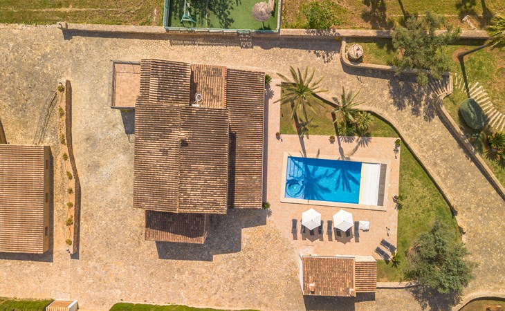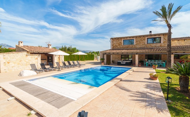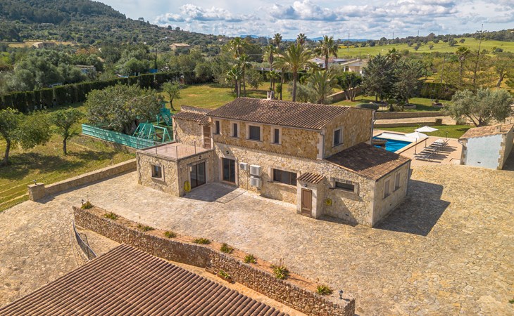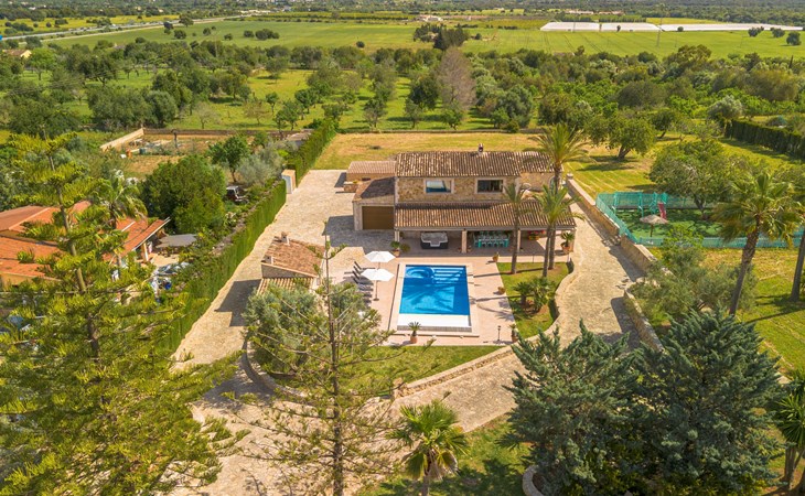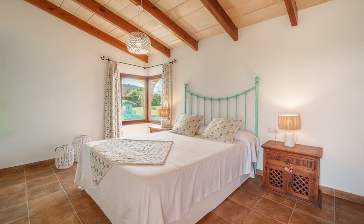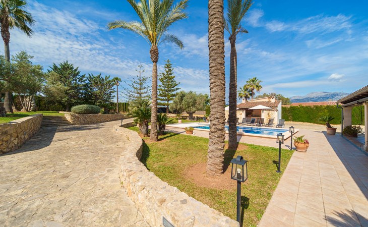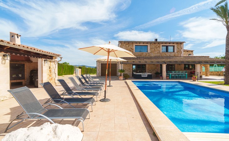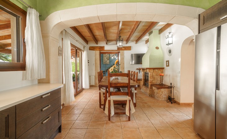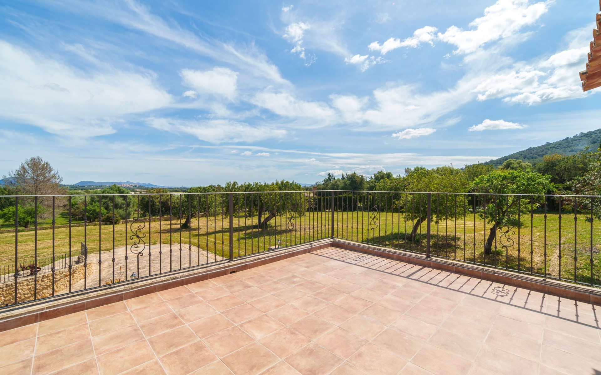 Very large, beautiful villa "Son Bosc", 2 storeys, surrounded by trees. Outside the resort, 4 km from the centre of Inca, in a quiet, sunny position residential area (villas), 2 km from the edge of the forest, 20 km from the sea, in the countryside. Private: property (fenced), garden with lawn and wildlife garden, swimming pool angular (11 x 5 m, depth 30 - 200 cm, seasonal availability: 01.Jan. - 31.Dec.). Outdoor shower, patio, arbour, pergola, garden furniture, barbecue, children's playground (slide, swing), pool maintenance by the owner/gardener. In the house: internet access, WiFi, storage room for bicycles, central heating system, air conditioning, washing machine, tumble dryer, heating available only from 01.Nov. - 31.Mar.. Parking at the house on the premises, single garage. Shop 5 km, grocery 5 km, supermarket 5 km, restaurant 3.5 km, bar 5 km, bakery 5 km, café 5 km, internet café 5 km, pedestrian zone 5 km, bicycle rental 5 km, pub garden 5 km, 60 minute walk to the centre, bus stop 5 km, railway station 5 km, sandy beach "Port Alcúdia" 23 km, rocky beach 23 km. Sports harbour 25 km, marina 25 km, golf course (18 hole) 25 km, sailing school 30 km, tennis 5 km, riding stable 8 km, sports centre 5 km, walking paths from the house 1.5 km, cycle lane 500 m. Nearby attractions: Ciudad de Inca 3.5 km, Palma de Mallorca 35 km, Mallorca Fashion Outlet & Cinemas 25 km, Pueblos:Búger-Campanet-Selva-Caimari. Playa y Faro de Formentor 35 km, Santuario de Lluc 22 km. Hiking paths: Puig de Santa Magdalena - Inca 3.6 km, Serra de Tramuntana. Please note: car recommended. Suitable for families. Object suitable for 9 adults. The owner does not accept any youth groups. Animals in the neighbourhood. Motorway 400 m from the property. Airfield 39.6 km from the property.