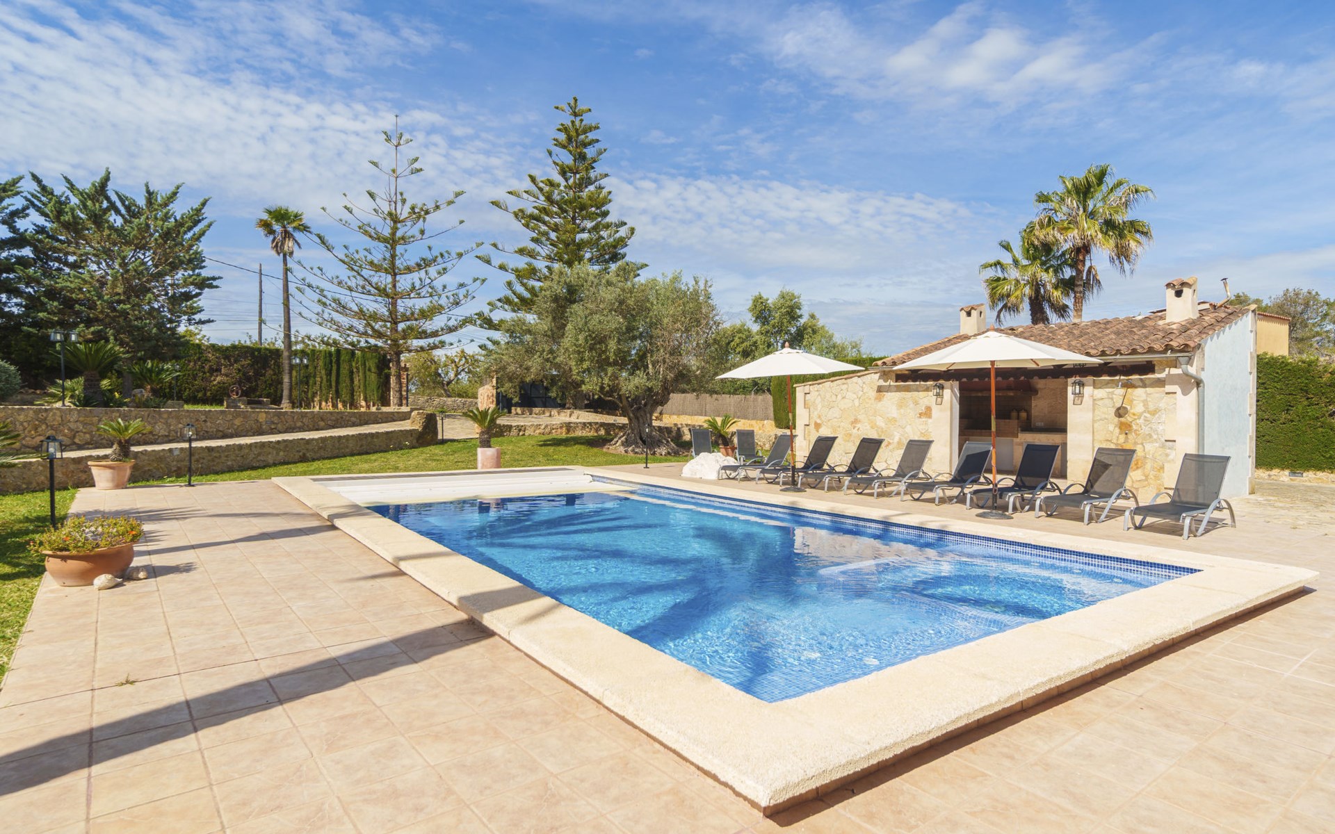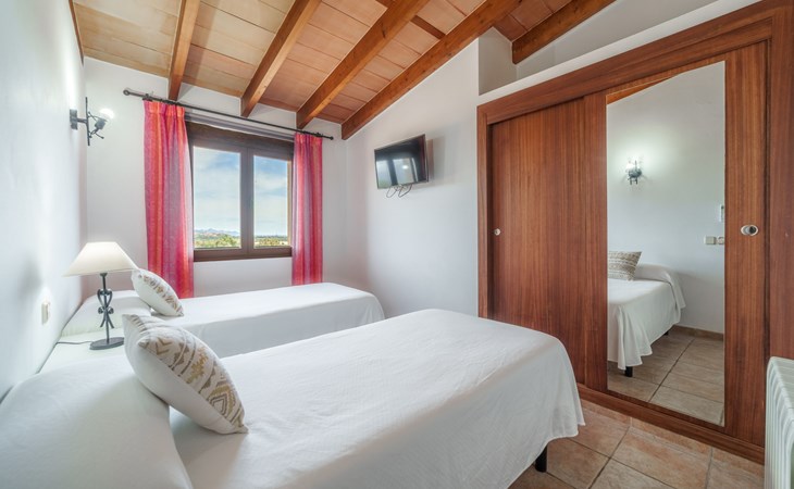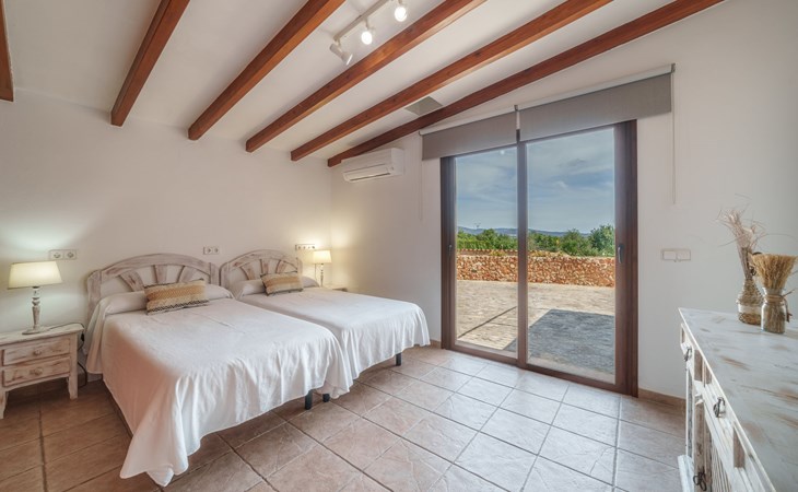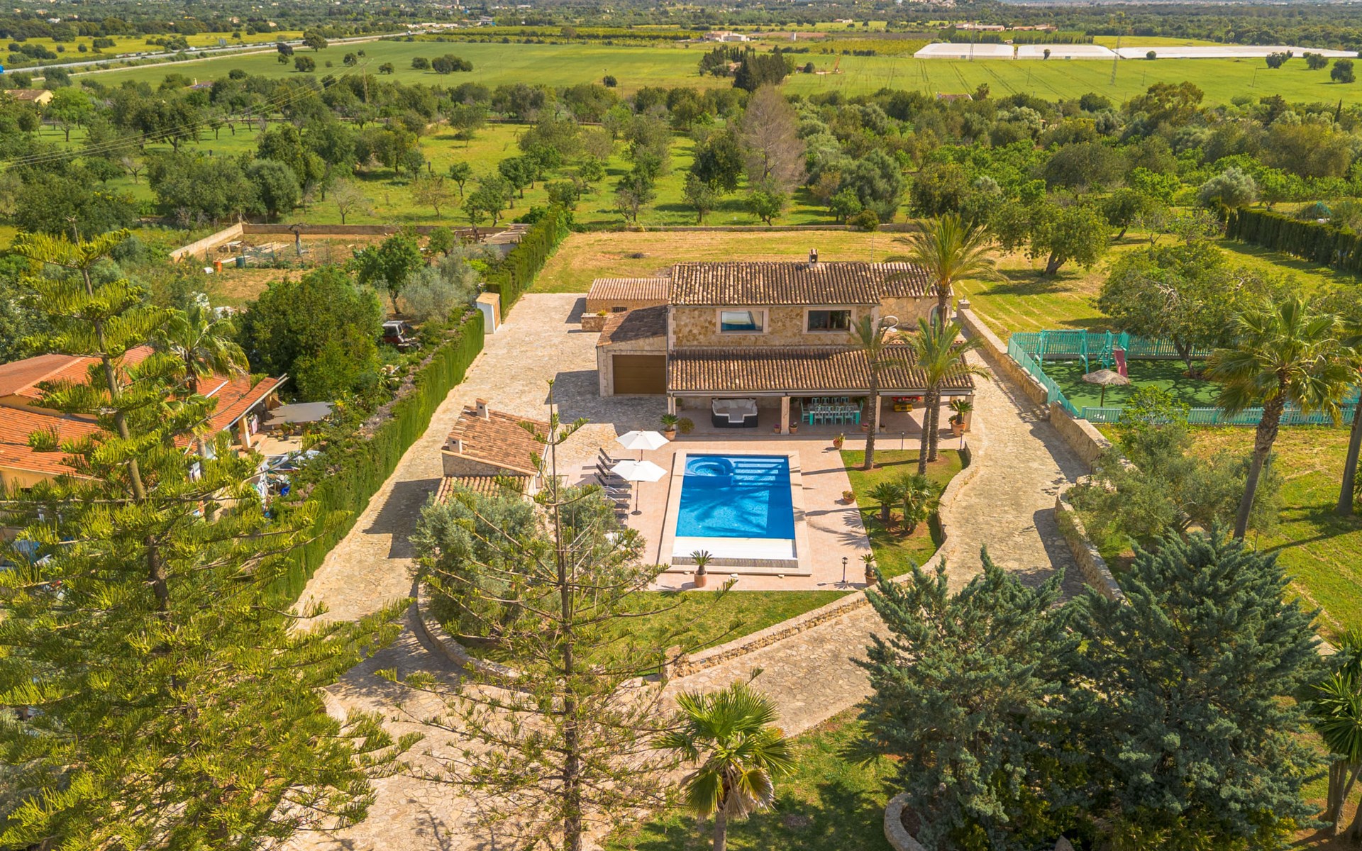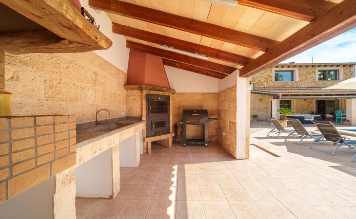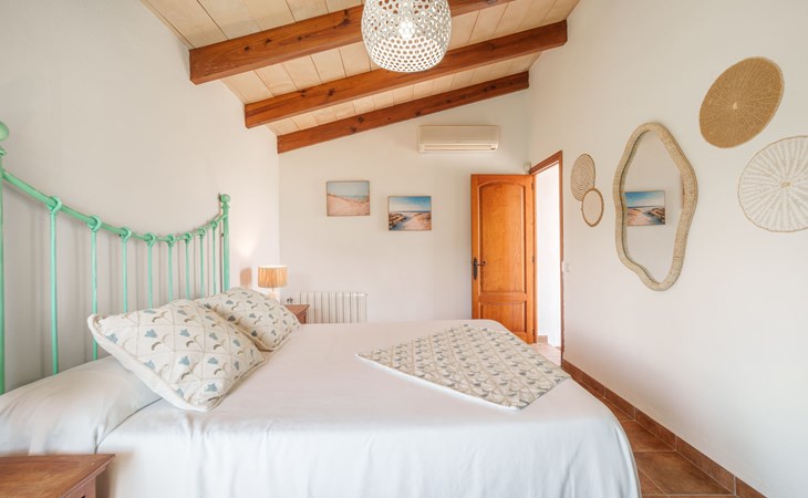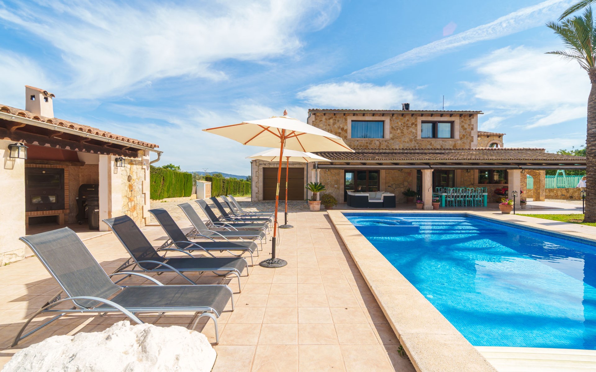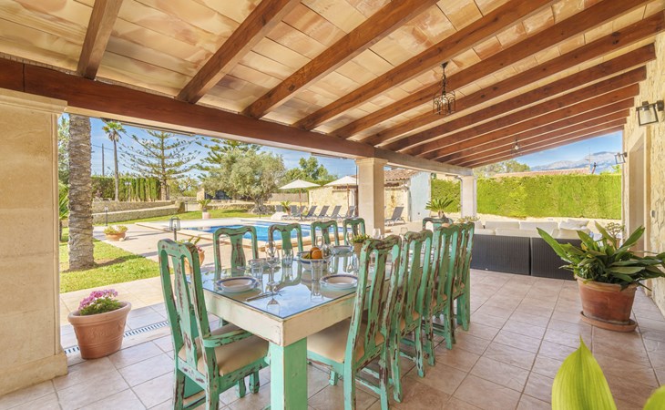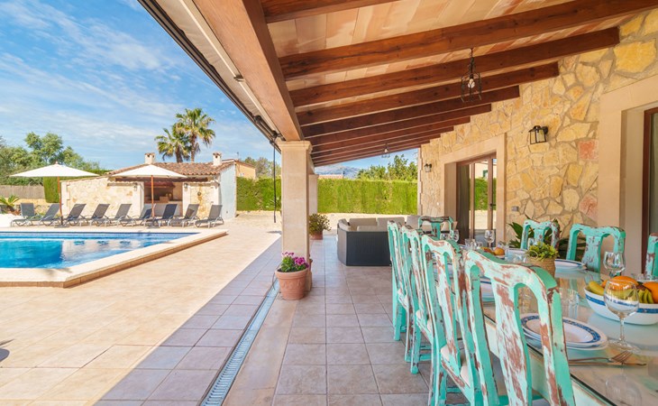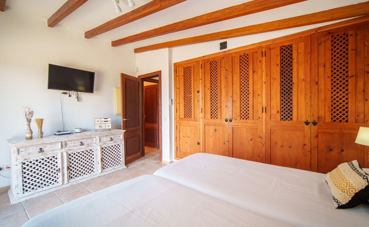 Very large, beautiful villa "Son Bosc", 2 storeys, surrounded by trees. Outside the resort, 4 km from the centre of Inca, in a quiet, sunny position residential area (villas), 2 km from the edge of the forest, 20 km from the sea, in the countryside. Private: property (fenced), garden with lawn and wildlife garden, swimming pool angular (11 x 5 m, depth 30 - 200 cm, seasonal availability: 01.Jan. - 31.Dec.). Outdoor shower, patio, arbour, pergola, garden furniture, barbecue, children's playground (slide, swing), pool maintenance by the owner/gardener. In the house: internet access, WiFi, storage room for bicycles, central heating system, air conditioning, washing machine, tumble dryer, heating available only from 01.Nov. - 31.Mar.. Parking at the house on the premises, single garage. Shop 5 km, grocery 5 km, supermarket 5 km, restaurant 3.5 km, bar 5 km, bakery 5 km, café 5 km, internet café 5 km, pedestrian zone 5 km, bicycle rental 5 km, pub garden 5 km, 60 minute walk to the centre, bus stop 5 km, railway station 5 km, sandy beach "Port Alcúdia" 23 km, rocky beach 23 km. Sports harbour 25 km, marina 25 km, golf course (18 hole) 25 km, sailing school 30 km, tennis 5 km, riding stable 8 km, sports centre 5 km, walking paths from the house 1.5 km, cycle lane 500 m. Nearby attractions: Ciudad de Inca 3.5 km, Palma de Mallorca 35 km, Mallorca Fashion Outlet & Cinemas 25 km, Pueblos:Búger-Campanet-Selva-Caimari. Playa y Faro de Formentor 35 km, Santuario de Lluc 22 km. Hiking paths: Puig de Santa Magdalena - Inca 3.6 km, Serra de Tramuntana. Please note: car recommended. Suitable for families. Object suitable for 9 adults. The owner does not accept any youth groups. Animals in the neighbourhood. Motorway 400 m from the property. Airfield 39.6 km from the property.