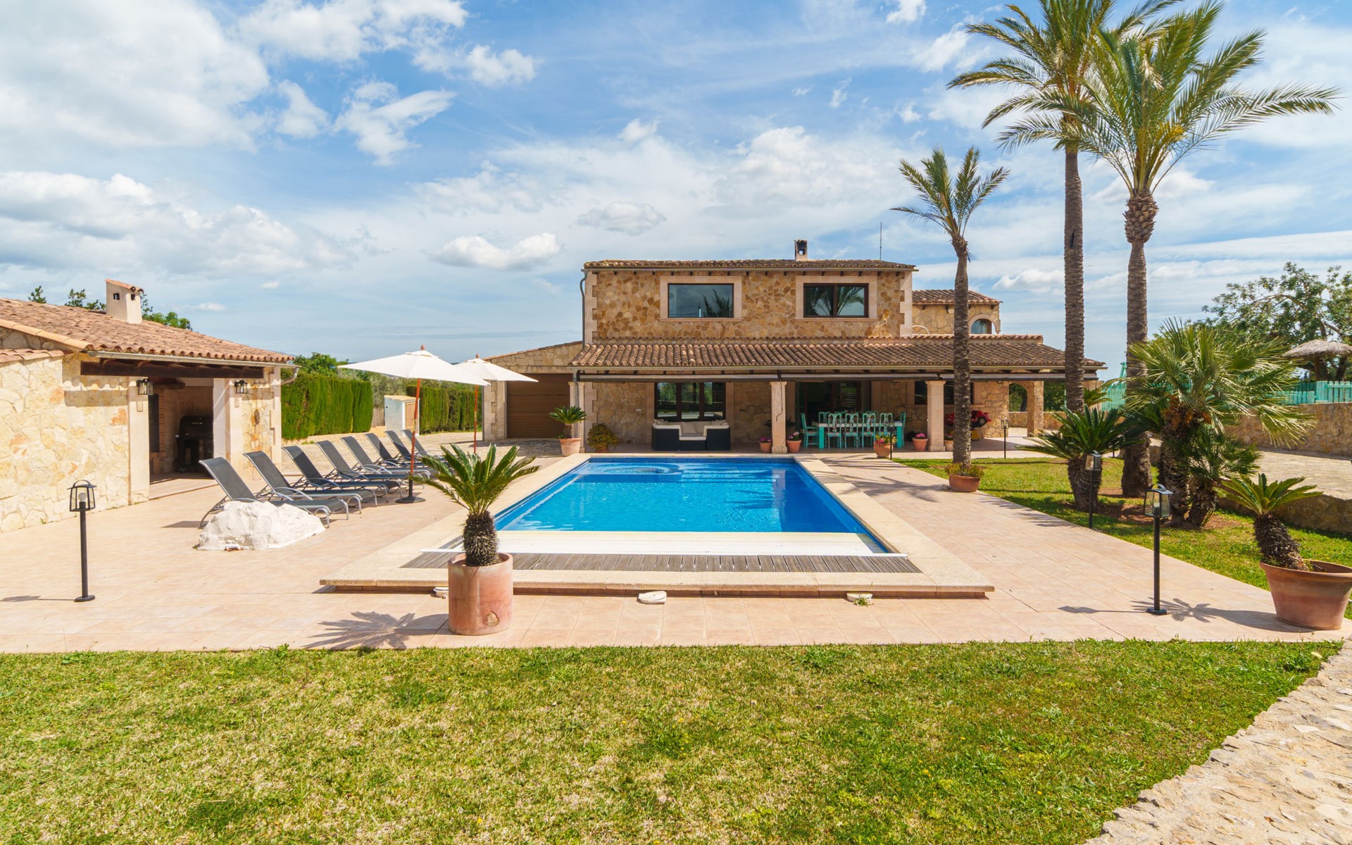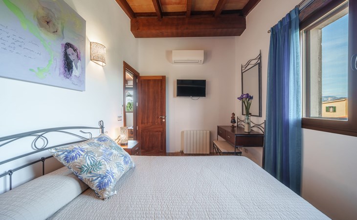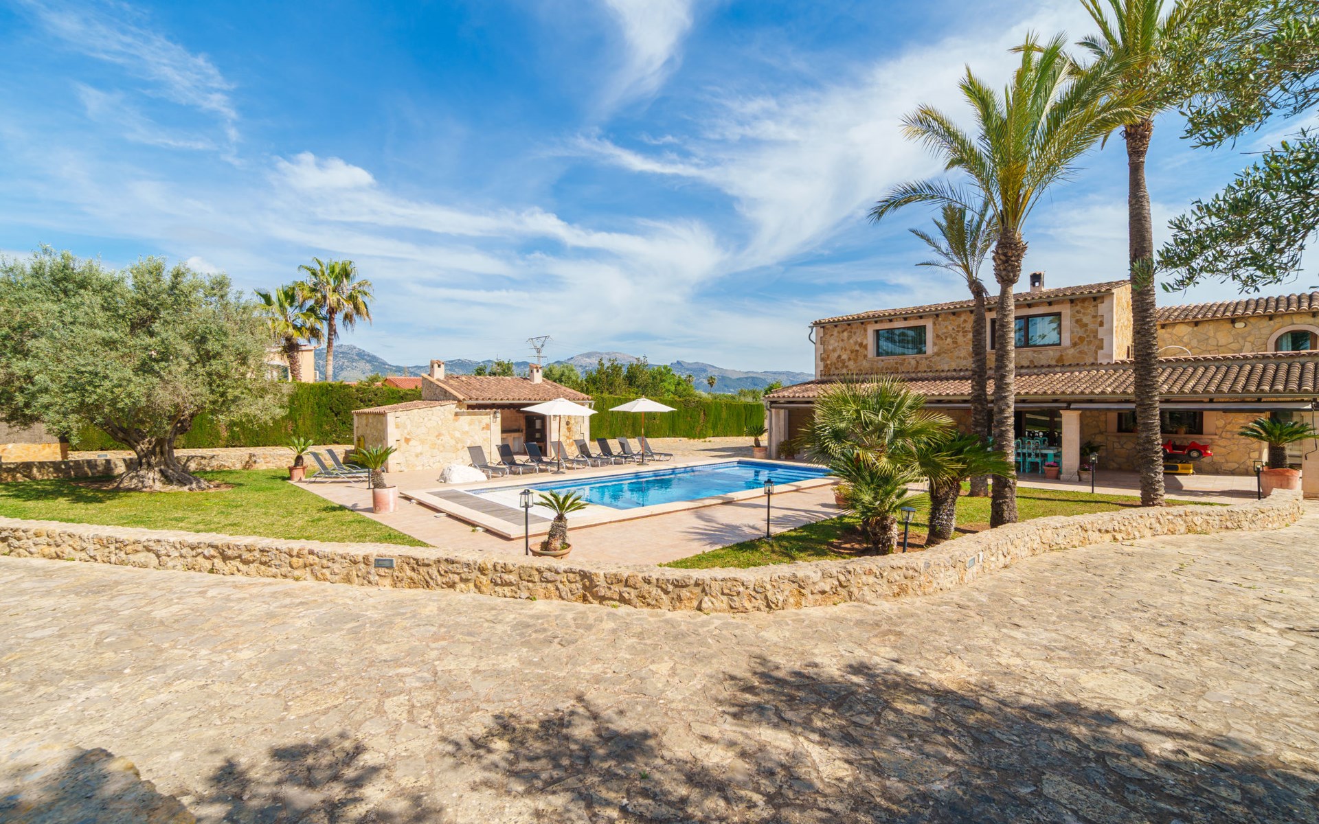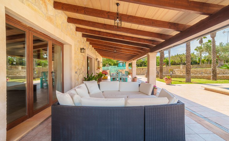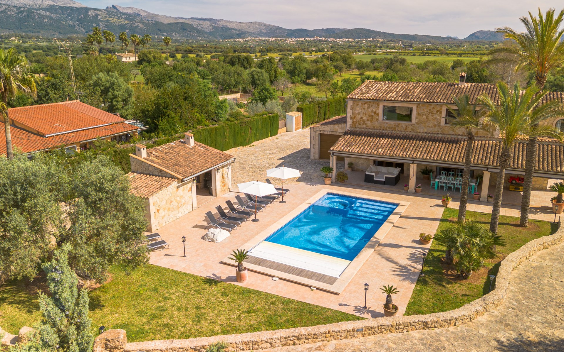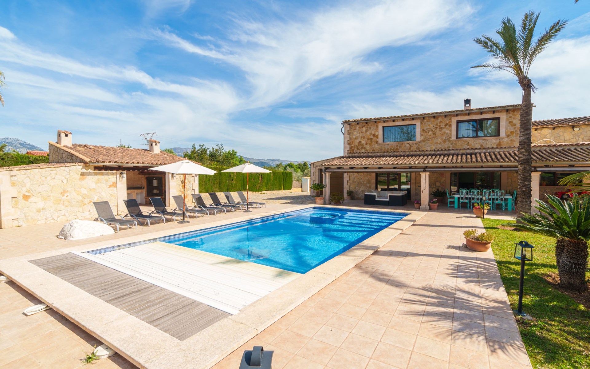 Very large, beautiful villa "Son Bosc", 2 storeys, surrounded by trees. Outside the resort, 4 km from the centre of Inca, in a quiet, sunny position residential area (villas), 2 km from the edge of the forest, 20 km from the sea, in the countryside. Private: property (fenced), garden with lawn and wildlife garden, swimming pool angular (11 x 5 m, depth 30 - 200 cm, seasonal availability: 01.Jan. - 31.Dec.). Outdoor shower, patio, arbour, pergola, garden furniture, barbecue, children's playground (slide, swing), pool maintenance by the owner/gardener. In the house: internet access, WiFi, storage room for bicycles, central heating system, air conditioning, washing machine, tumble dryer, heating available only from 01.Nov. - 31.Mar.. Parking at the house on the premises, single garage. Shop 5 km, grocery 5 km, supermarket 5 km, restaurant 3.5 km, bar 5 km, bakery 5 km, café 5 km, internet café 5 km, pedestrian zone 5 km, bicycle rental 5 km, pub garden 5 km, 60 minute walk to the centre, bus stop 5 km, railway station 5 km, sandy beach "Port Alcúdia" 23 km, rocky beach 23 km. Sports harbour 25 km, marina 25 km, golf course (18 hole) 25 km, sailing school 30 km, tennis 5 km, riding stable 8 km, sports centre 5 km, walking paths from the house 1.5 km, cycle lane 500 m. Nearby attractions: Ciudad de Inca 3.5 km, Palma de Mallorca 35 km, Mallorca Fashion Outlet & Cinemas 25 km, Pueblos:Búger-Campanet-Selva-Caimari. Playa y Faro de Formentor 35 km, Santuario de Lluc 22 km. Hiking paths: Puig de Santa Magdalena - Inca 3.6 km, Serra de Tramuntana. Please note: car recommended. Suitable for families. Object suitable for 9 adults. The owner does not accept any youth groups. Animals in the neighbourhood. Motorway 400 m from the property. Airfield 39.6 km from the property.
