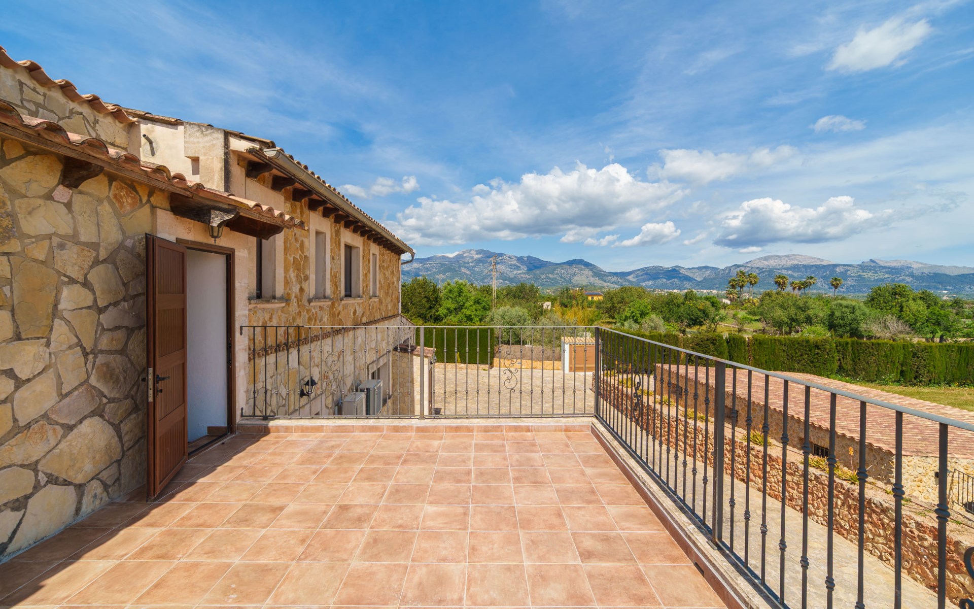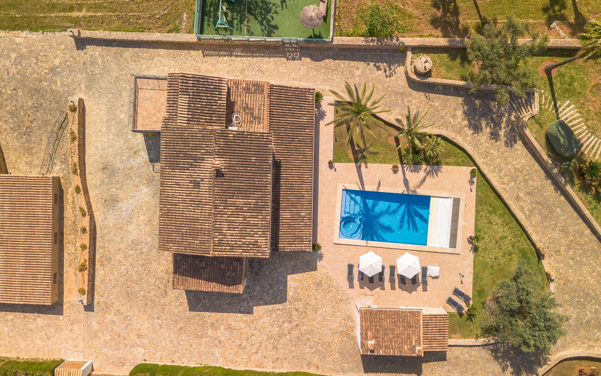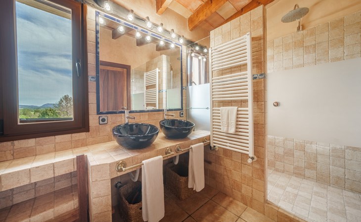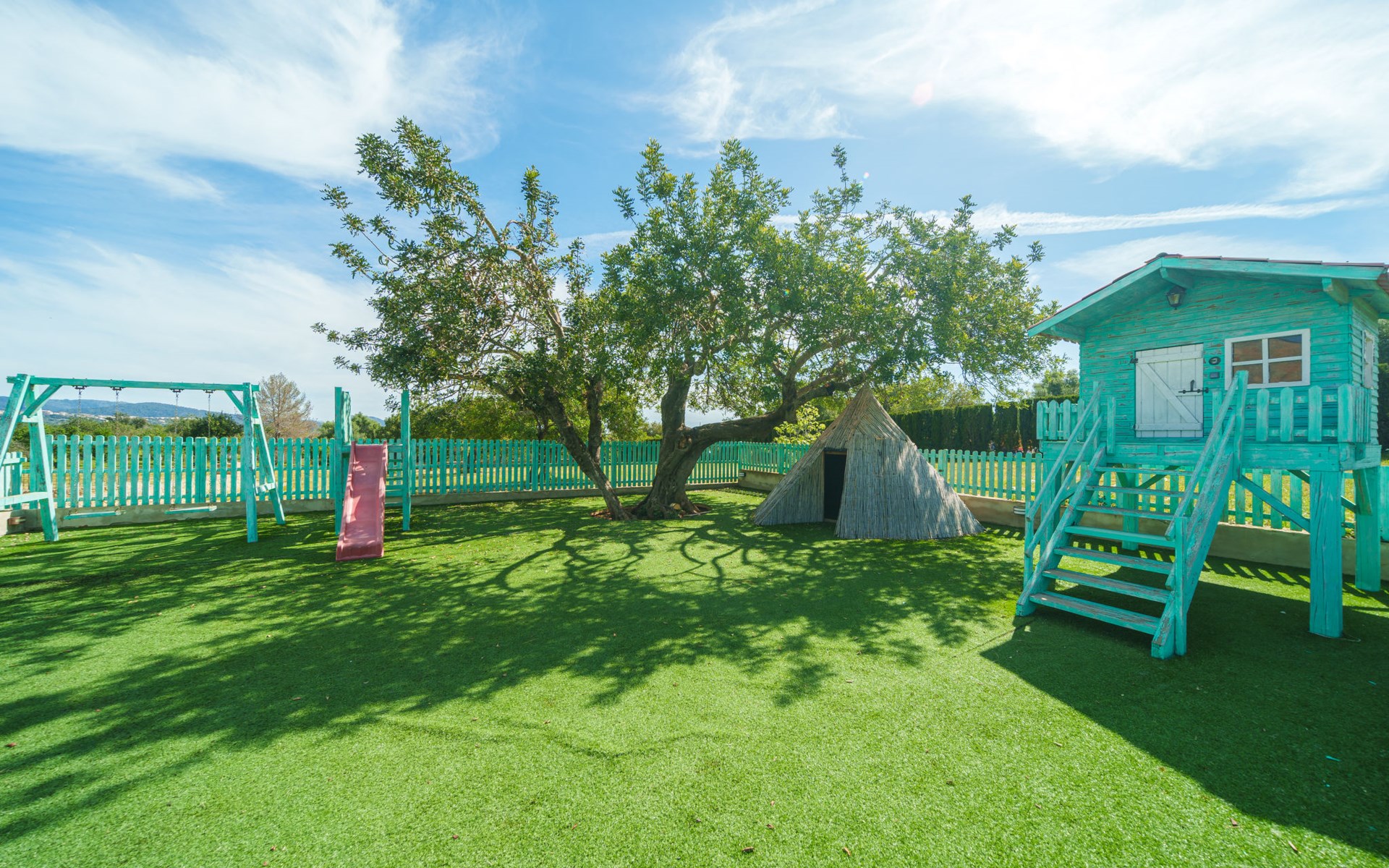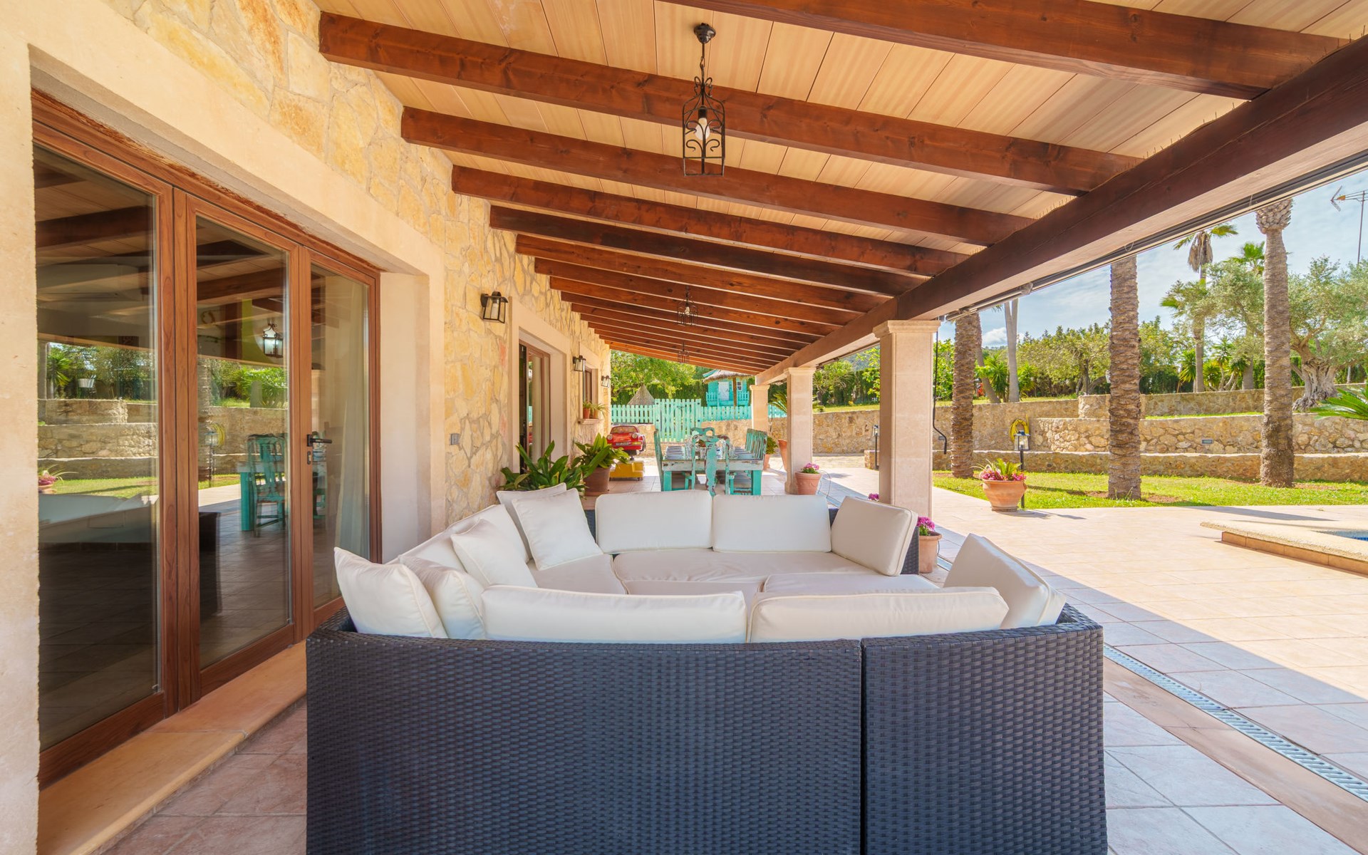 Very large, beautiful villa "Son Bosc", 2 storeys, surrounded by trees. Outside the resort, 4 km from the centre of Inca, in a quiet, sunny position residential area (villas), 2 km from the edge of the forest, 20 km from the sea, in the countryside. Private: property (fenced), garden with lawn and wildlife garden, swimming pool angular (11 x 5 m, depth 30 - 200 cm, seasonal availability: 01.Jan. - 31.Dec.). Outdoor shower, patio, arbour, pergola, garden furniture, barbecue, children's playground (slide, swing), pool maintenance by the owner/gardener. In the house: internet access, WiFi, storage room for bicycles, central heating system, air conditioning, washing machine, tumble dryer, heating available only from 01.Nov. - 31.Mar.. Parking at the house on the premises, single garage. Shop 5 km, grocery 5 km, supermarket 5 km, restaurant 3.5 km, bar 5 km, bakery 5 km, café 5 km, internet café 5 km, pedestrian zone 5 km, bicycle rental 5 km, pub garden 5 km, 60 minute walk to the centre, bus stop 5 km, railway station 5 km, sandy beach "Port Alcúdia" 23 km, rocky beach 23 km. Sports harbour 25 km, marina 25 km, golf course (18 hole) 25 km, sailing school 30 km, tennis 5 km, riding stable 8 km, sports centre 5 km, walking paths from the house 1.5 km, cycle lane 500 m. Nearby attractions: Ciudad de Inca 3.5 km, Palma de Mallorca 35 km, Mallorca Fashion Outlet & Cinemas 25 km, Pueblos:Búger-Campanet-Selva-Caimari. Playa y Faro de Formentor 35 km, Santuario de Lluc 22 km. Hiking paths: Puig de Santa Magdalena - Inca 3.6 km, Serra de Tramuntana. Please note: car recommended. Suitable for families. Object suitable for 9 adults. The owner does not accept any youth groups. Animals in the neighbourhood. Motorway 400 m from the property. Airfield 39.6 km from the property.