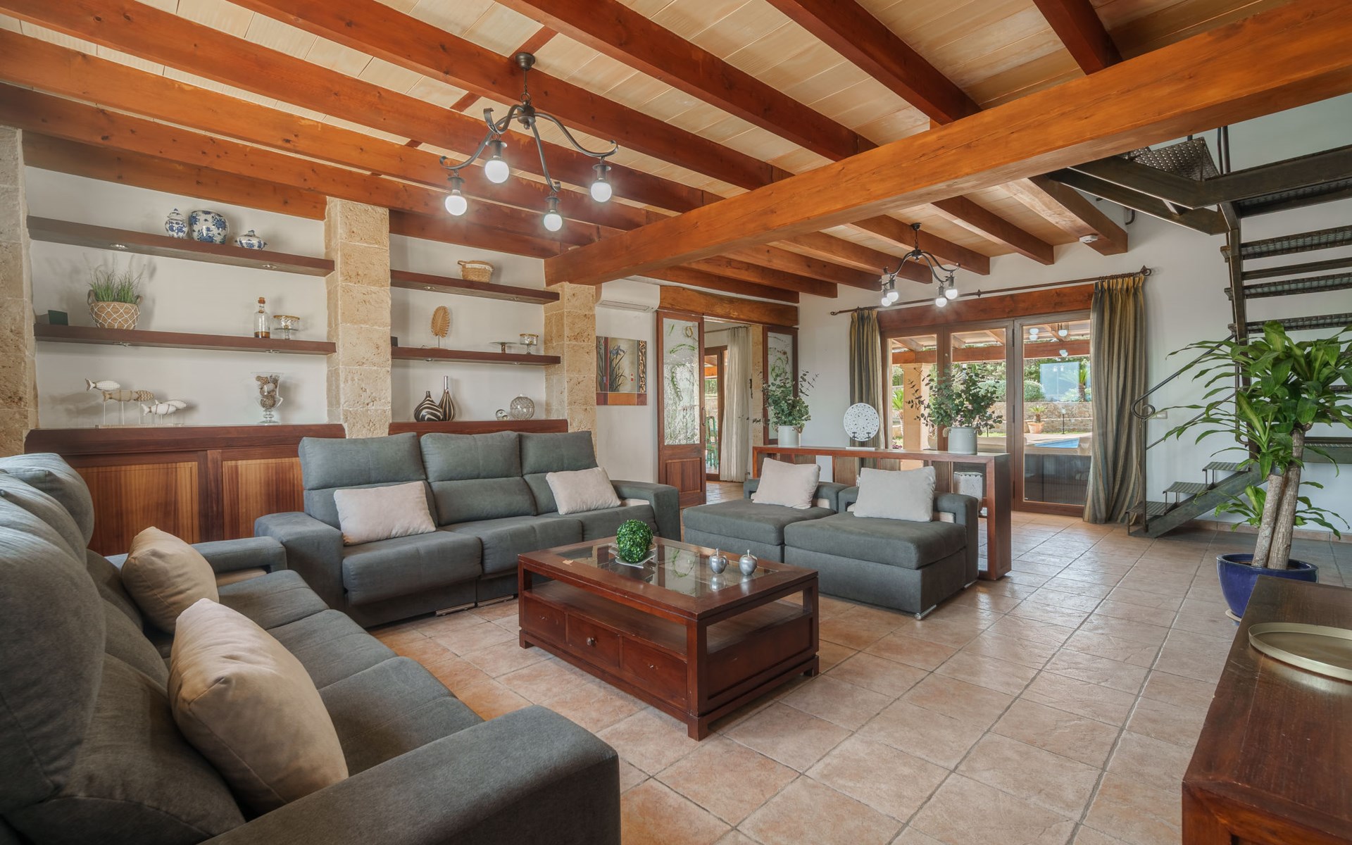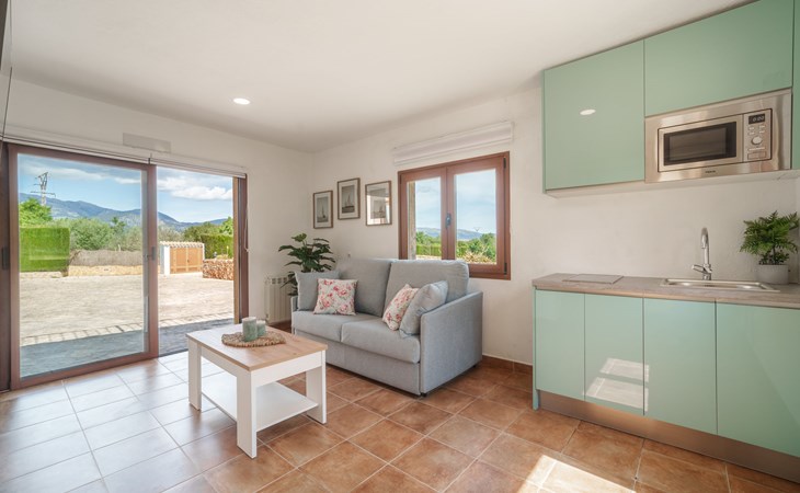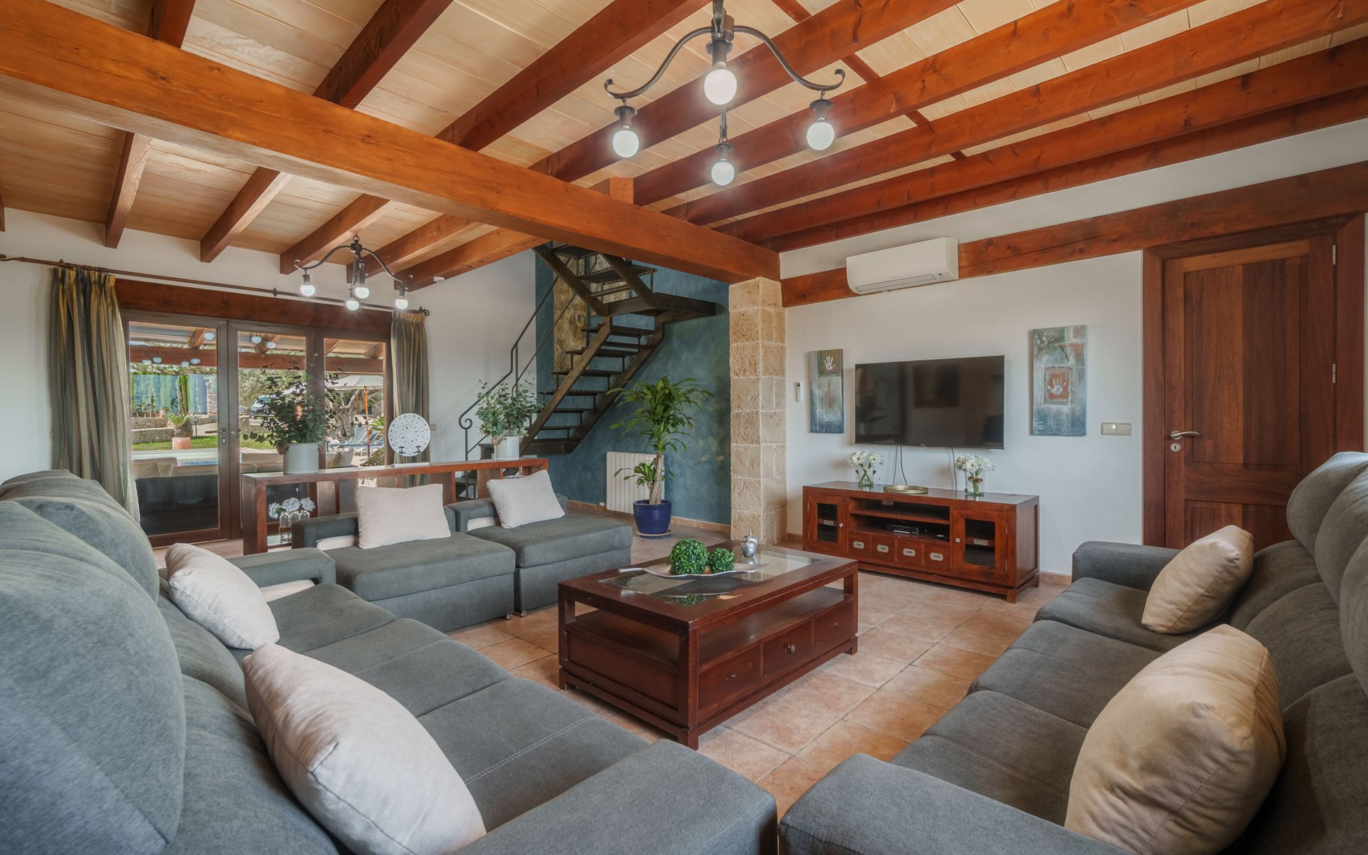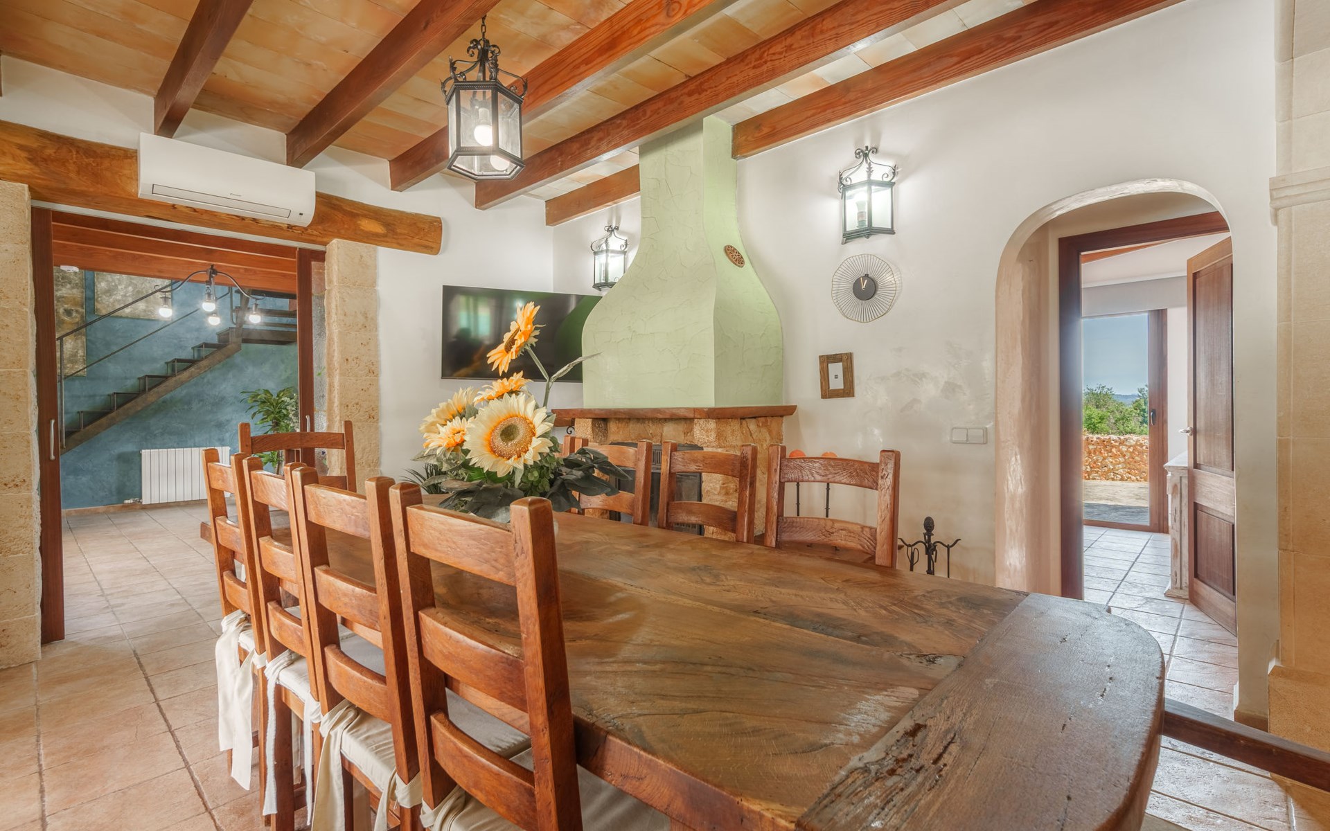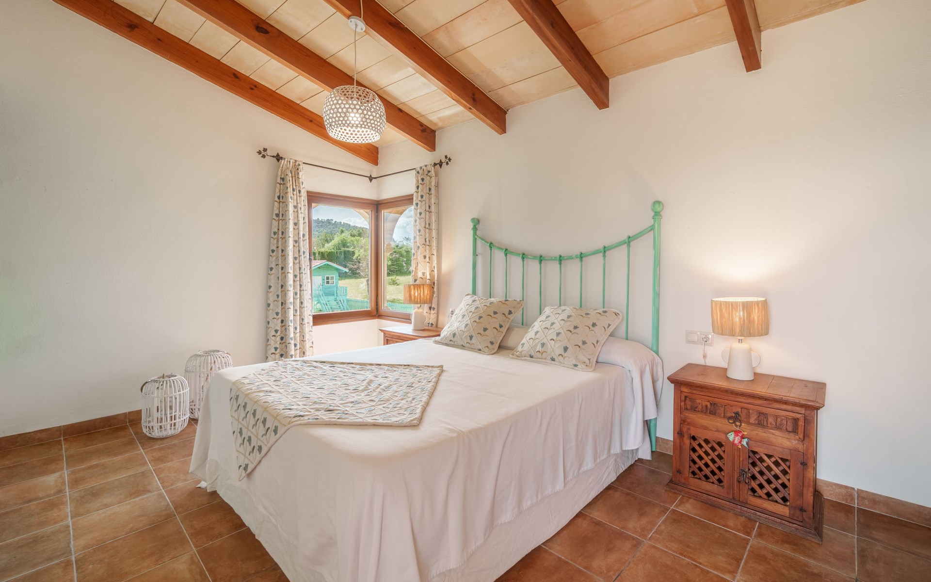 Very large, beautiful villa "Son Bosc", 2 storeys, surrounded by trees. Outside the resort, 4 km from the centre of Inca, in a quiet, sunny position residential area (villas), 2 km from the edge of the forest, 20 km from the sea, in the countryside. Private: property (fenced), garden with lawn and wildlife garden, swimming pool angular (11 x 5 m, depth 30 - 200 cm, seasonal availability: 01.Jan. - 31.Dec.). Outdoor shower, patio, arbour, pergola, garden furniture, barbecue, children's playground (slide, swing), pool maintenance by the owner/gardener. In the house: internet access, WiFi, storage room for bicycles, central heating system, air conditioning, washing machine, tumble dryer, heating available only from 01.Nov. - 31.Mar.. Parking at the house on the premises, single garage. Shop 5 km, grocery 5 km, supermarket 5 km, restaurant 3.5 km, bar 5 km, bakery 5 km, café 5 km, internet café 5 km, pedestrian zone 5 km, bicycle rental 5 km, pub garden 5 km, 60 minute walk to the centre, bus stop 5 km, railway station 5 km, sandy beach "Port Alcúdia" 23 km, rocky beach 23 km. Sports harbour 25 km, marina 25 km, golf course (18 hole) 25 km, sailing school 30 km, tennis 5 km, riding stable 8 km, sports centre 5 km, walking paths from the house 1.5 km, cycle lane 500 m. Nearby attractions: Ciudad de Inca 3.5 km, Palma de Mallorca 35 km, Mallorca Fashion Outlet & Cinemas 25 km, Pueblos:Búger-Campanet-Selva-Caimari. Playa y Faro de Formentor 35 km, Santuario de Lluc 22 km. Hiking paths: Puig de Santa Magdalena - Inca 3.6 km, Serra de Tramuntana. Please note: car recommended. Suitable for families. Object suitable for 9 adults. The owner does not accept any youth groups. Animals in the neighbourhood. Motorway 400 m from the property. Airfield 39.6 km from the property.
