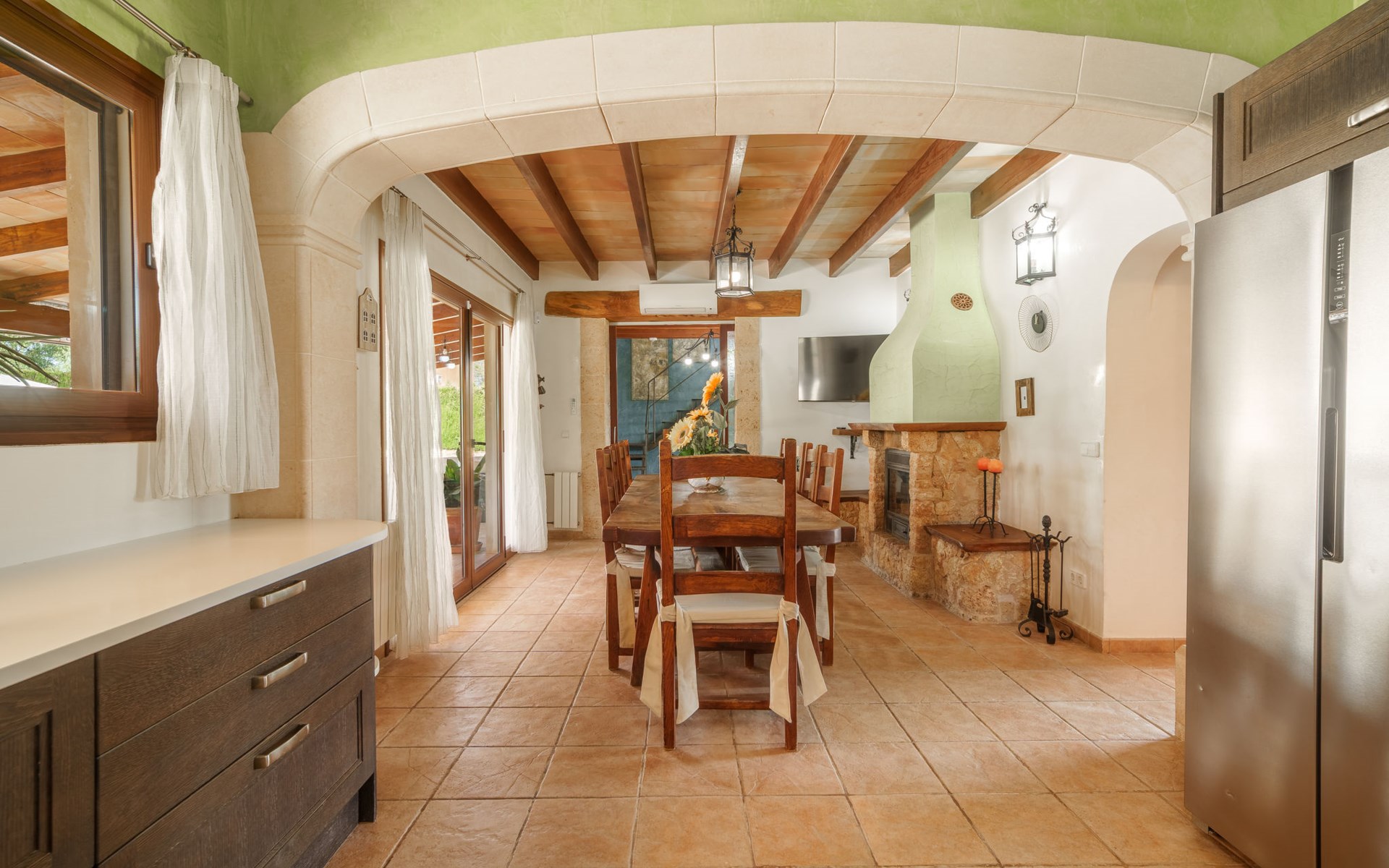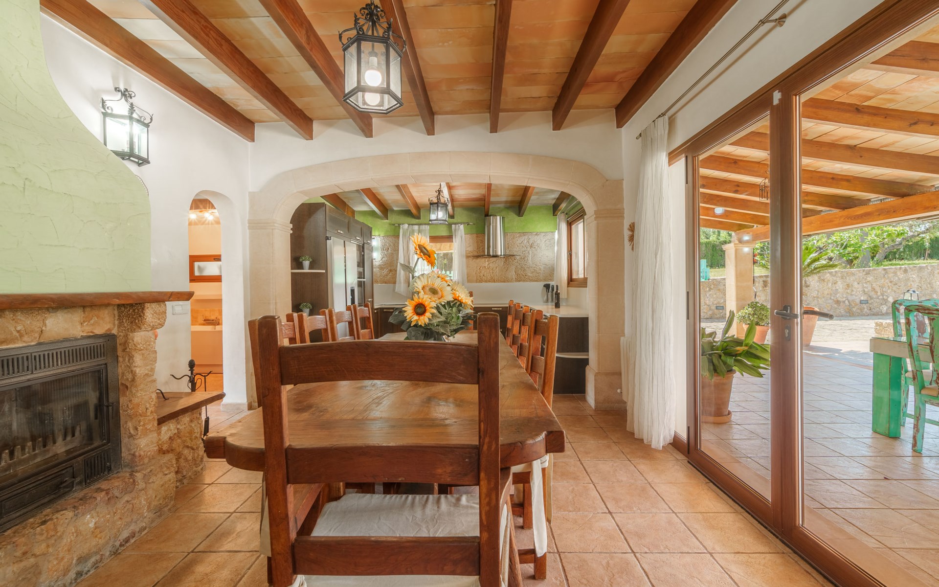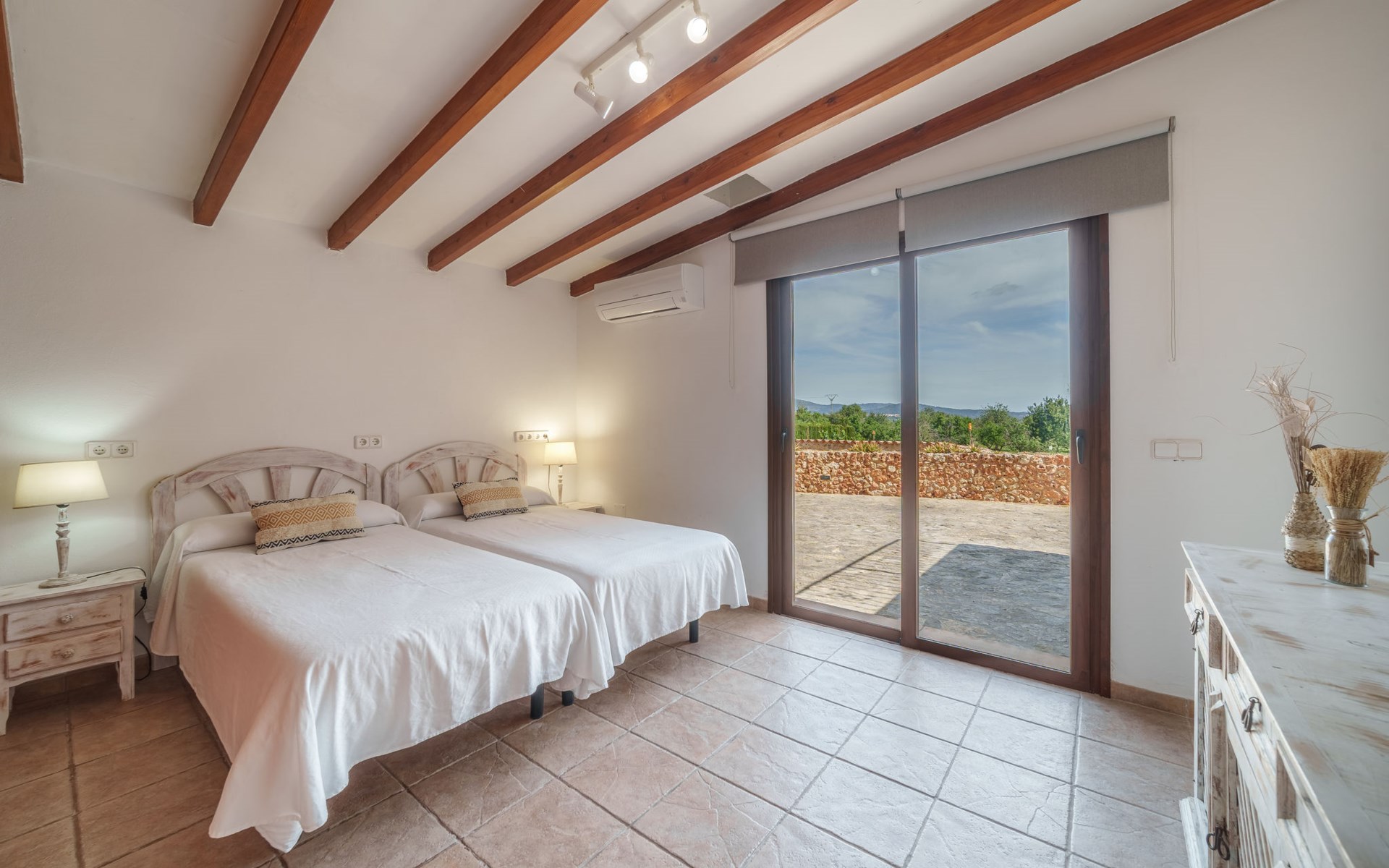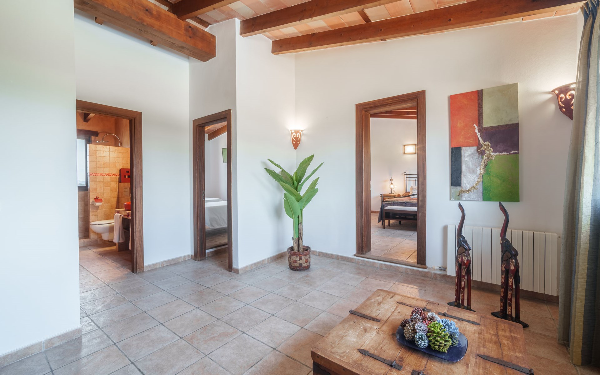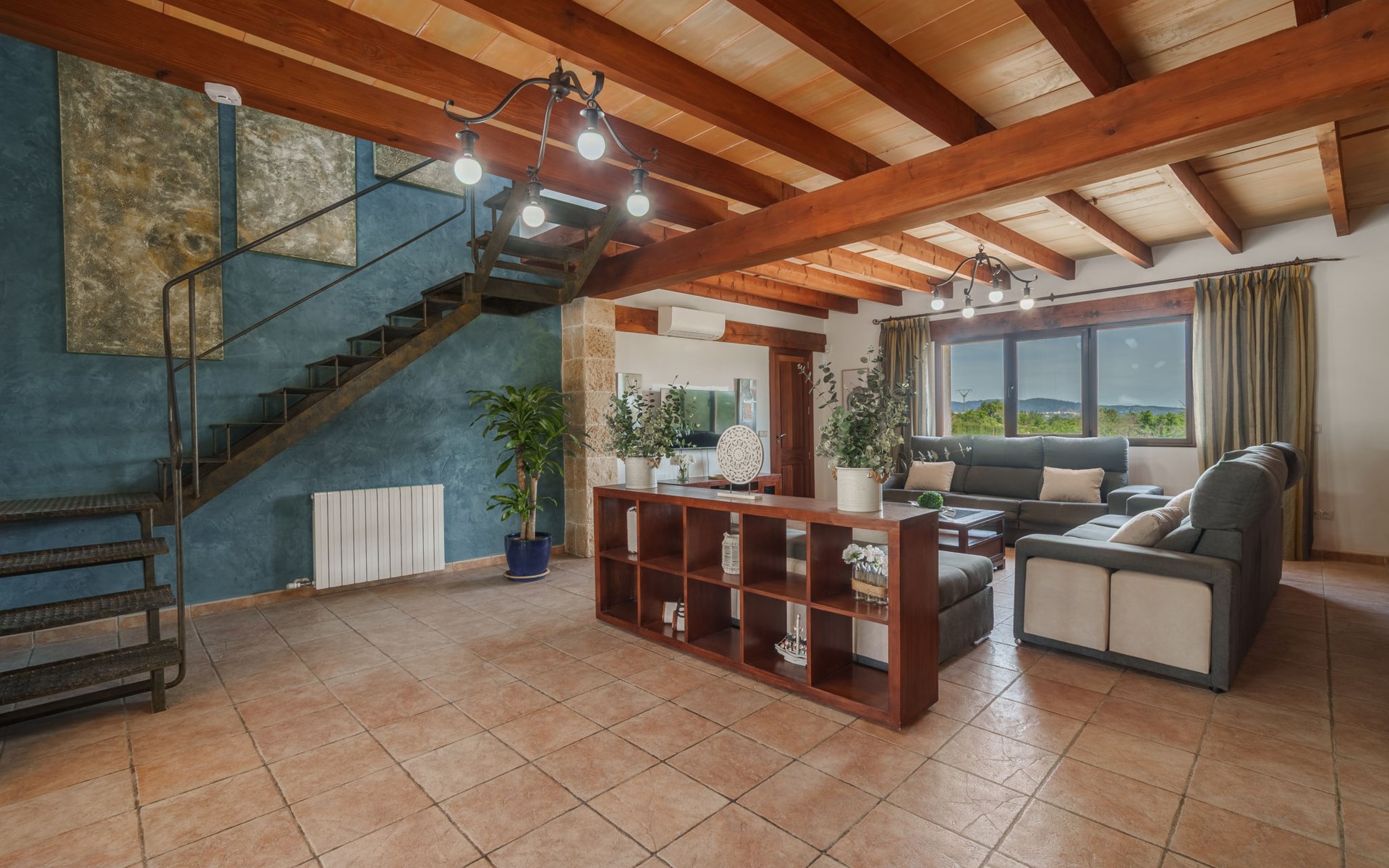 Very large, beautiful villa "Son Bosc", 2 storeys, surrounded by trees. Outside the resort, 4 km from the centre of Inca, in a quiet, sunny position residential area (villas), 2 km from the edge of the forest, 20 km from the sea, in the countryside. Private: property (fenced), garden with lawn and wildlife garden, swimming pool angular (11 x 5 m, depth 30 - 200 cm, seasonal availability: 01.Jan. - 31.Dec.). Outdoor shower, patio, arbour, pergola, garden furniture, barbecue, children's playground (slide, swing), pool maintenance by the owner/gardener. In the house: internet access, WiFi, storage room for bicycles, central heating system, air conditioning, washing machine, tumble dryer, heating available only from 01.Nov. - 31.Mar.. Parking at the house on the premises, single garage. Shop 5 km, grocery 5 km, supermarket 5 km, restaurant 3.5 km, bar 5 km, bakery 5 km, café 5 km, internet café 5 km, pedestrian zone 5 km, bicycle rental 5 km, pub garden 5 km, 60 minute walk to the centre, bus stop 5 km, railway station 5 km, sandy beach "Port Alcúdia" 23 km, rocky beach 23 km. Sports harbour 25 km, marina 25 km, golf course (18 hole) 25 km, sailing school 30 km, tennis 5 km, riding stable 8 km, sports centre 5 km, walking paths from the house 1.5 km, cycle lane 500 m. Nearby attractions: Ciudad de Inca 3.5 km, Palma de Mallorca 35 km, Mallorca Fashion Outlet & Cinemas 25 km, Pueblos:Búger-Campanet-Selva-Caimari. Playa y Faro de Formentor 35 km, Santuario de Lluc 22 km. Hiking paths: Puig de Santa Magdalena - Inca 3.6 km, Serra de Tramuntana. Please note: car recommended. Suitable for families. Object suitable for 9 adults. The owner does not accept any youth groups. Animals in the neighbourhood. Motorway 400 m from the property. Airfield 39.6 km from the property.