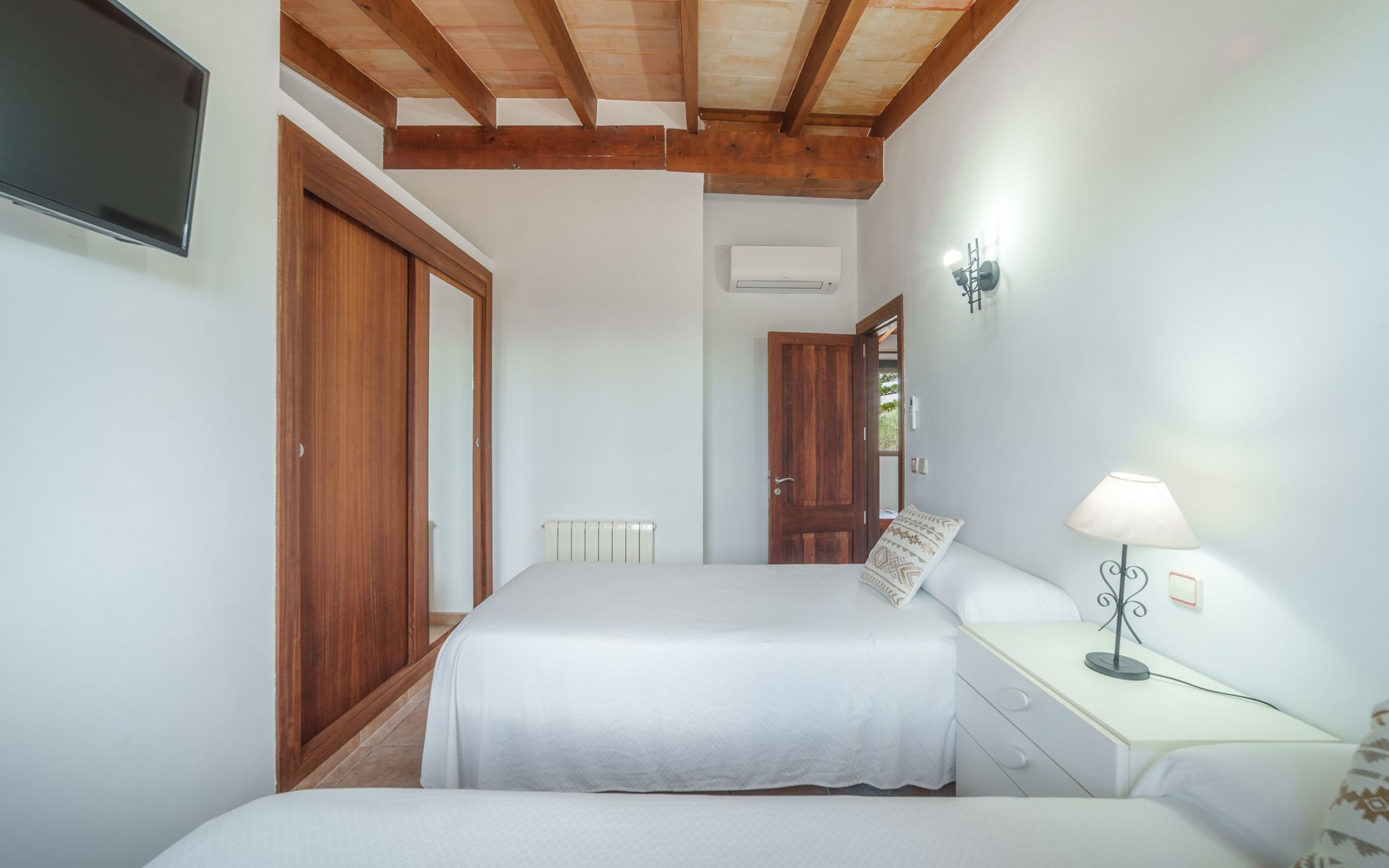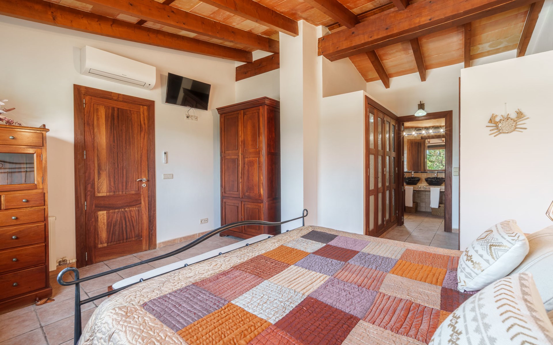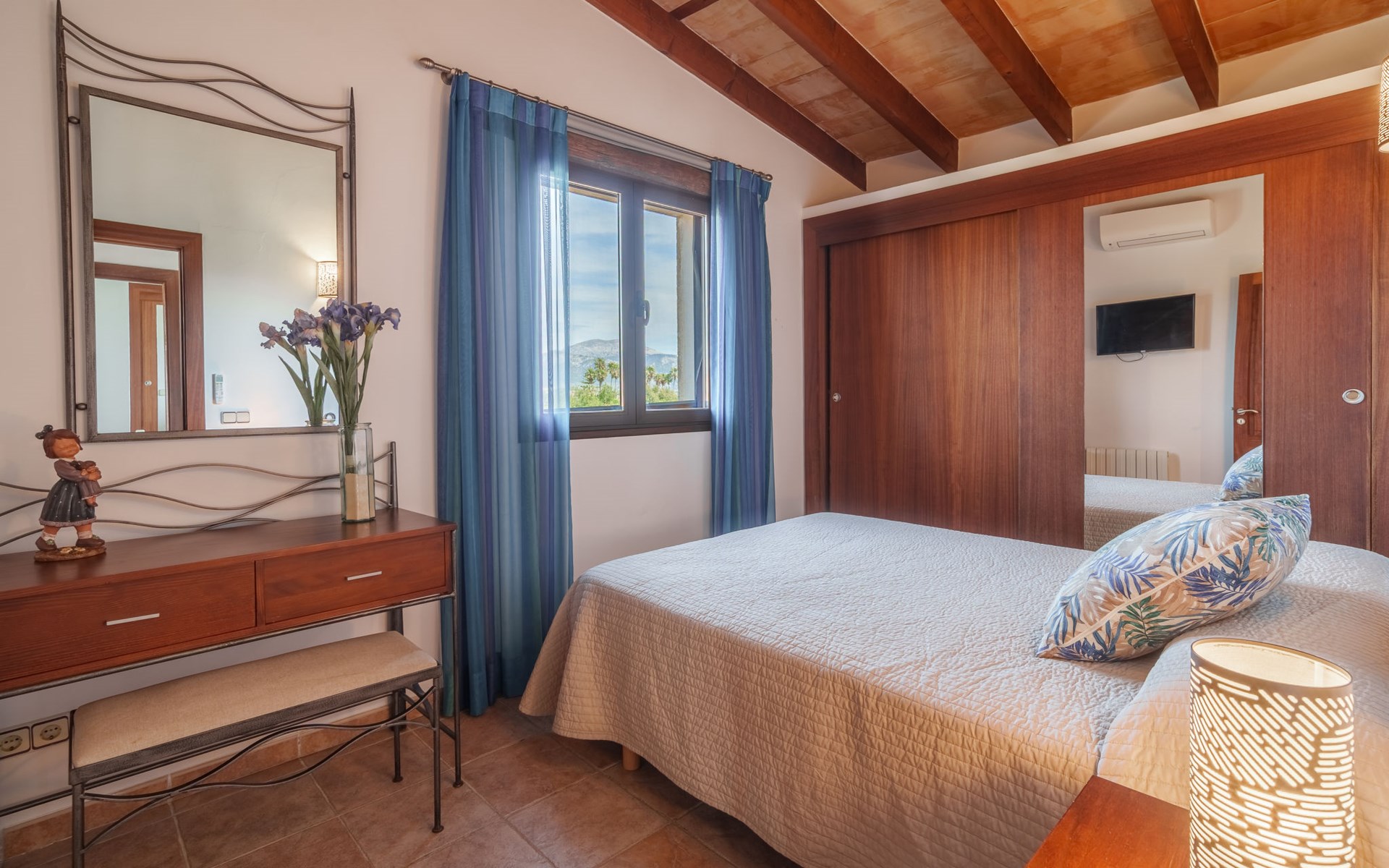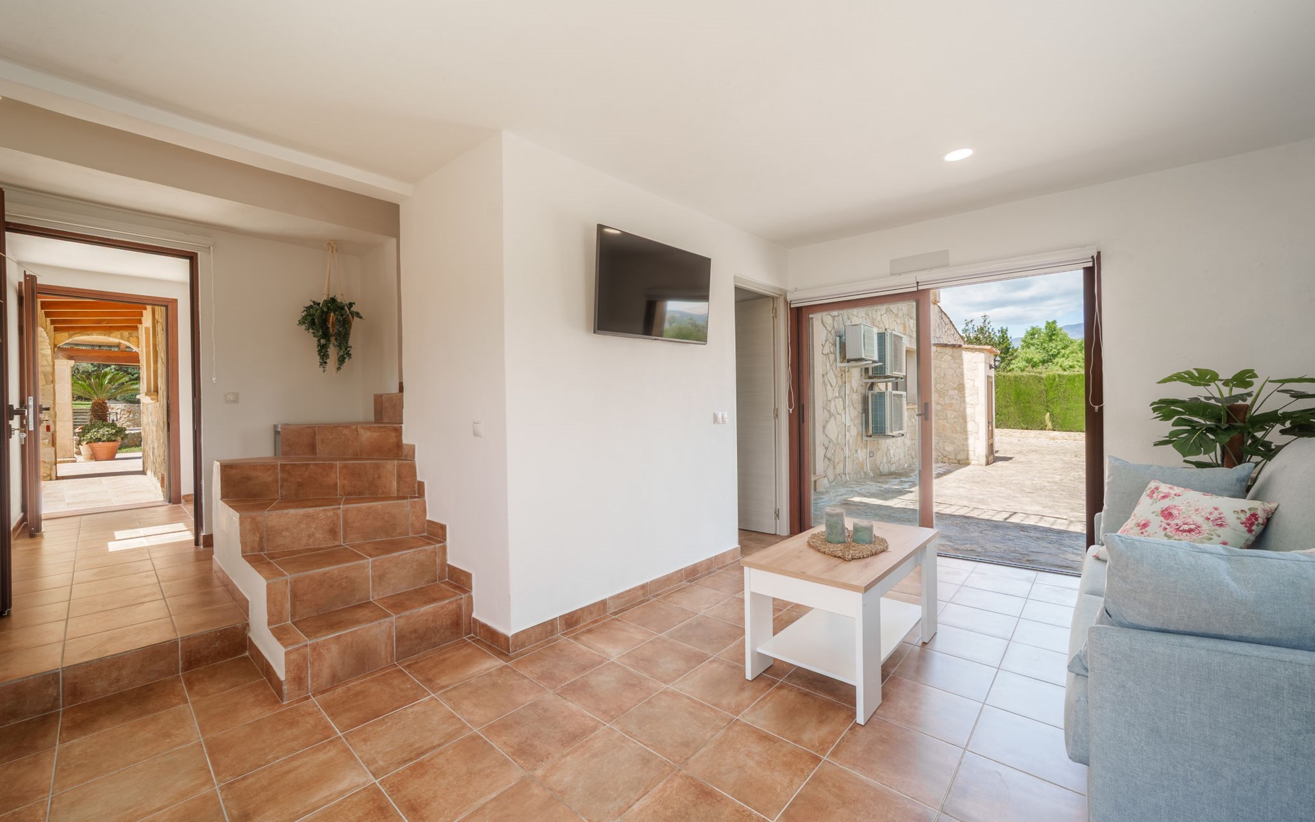 Very large, beautiful villa "Son Bosc", 2 storeys, surrounded by trees. Outside the resort, 4 km from the centre of Inca, in a quiet, sunny position residential area (villas), 2 km from the edge of the forest, 20 km from the sea, in the countryside. Private: property (fenced), garden with lawn and wildlife garden, swimming pool angular (11 x 5 m, depth 30 - 200 cm, seasonal availability: 01.Jan. - 31.Dec.). Outdoor shower, patio, arbour, pergola, garden furniture, barbecue, children's playground (slide, swing), pool maintenance by the owner/gardener. In the house: internet access, WiFi, storage room for bicycles, central heating system, air conditioning, washing machine, tumble dryer, heating available only from 01.Nov. - 31.Mar.. Parking at the house on the premises, single garage. Shop 5 km, grocery 5 km, supermarket 5 km, restaurant 3.5 km, bar 5 km, bakery 5 km, café 5 km, internet café 5 km, pedestrian zone 5 km, bicycle rental 5 km, pub garden 5 km, 60 minute walk to the centre, bus stop 5 km, railway station 5 km, sandy beach "Port Alcúdia" 23 km, rocky beach 23 km. Sports harbour 25 km, marina 25 km, golf course (18 hole) 25 km, sailing school 30 km, tennis 5 km, riding stable 8 km, sports centre 5 km, walking paths from the house 1.5 km, cycle lane 500 m. Nearby attractions: Ciudad de Inca 3.5 km, Palma de Mallorca 35 km, Mallorca Fashion Outlet & Cinemas 25 km, Pueblos:Búger-Campanet-Selva-Caimari. Playa y Faro de Formentor 35 km, Santuario de Lluc 22 km. Hiking paths: Puig de Santa Magdalena - Inca 3.6 km, Serra de Tramuntana. Please note: car recommended. Suitable for families. Object suitable for 9 adults. The owner does not accept any youth groups. Animals in the neighbourhood. Motorway 400 m from the property. Airfield 39.6 km from the property.