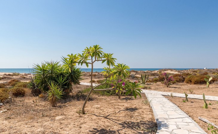 In front of the terrace, on the sand, is a sandy garden of succulent plants and flower beds.