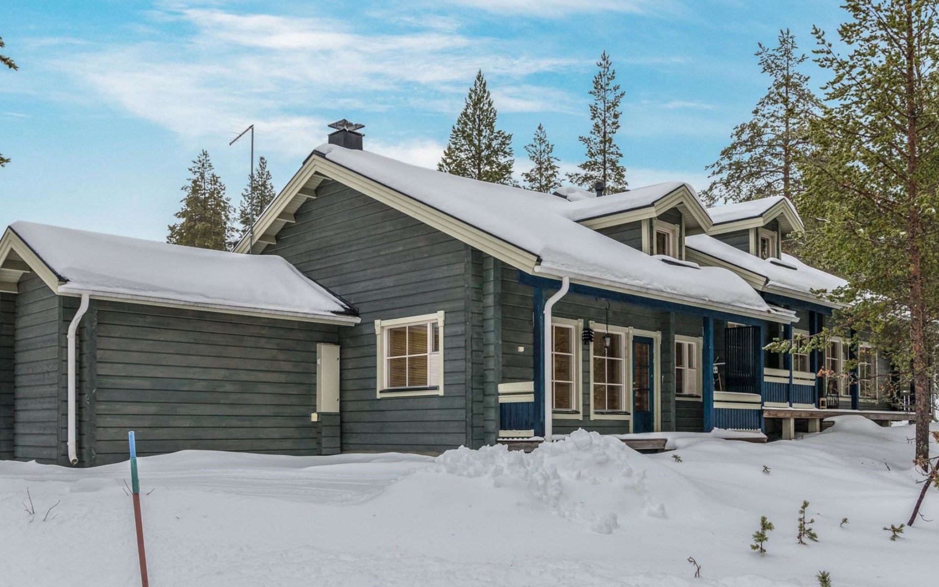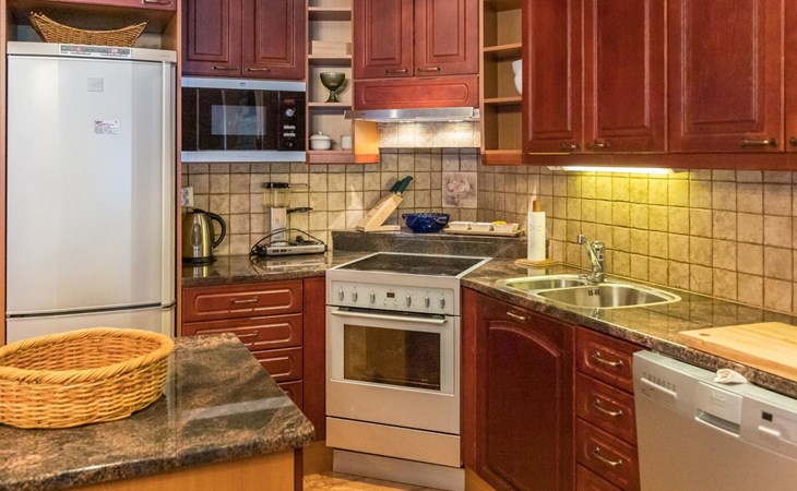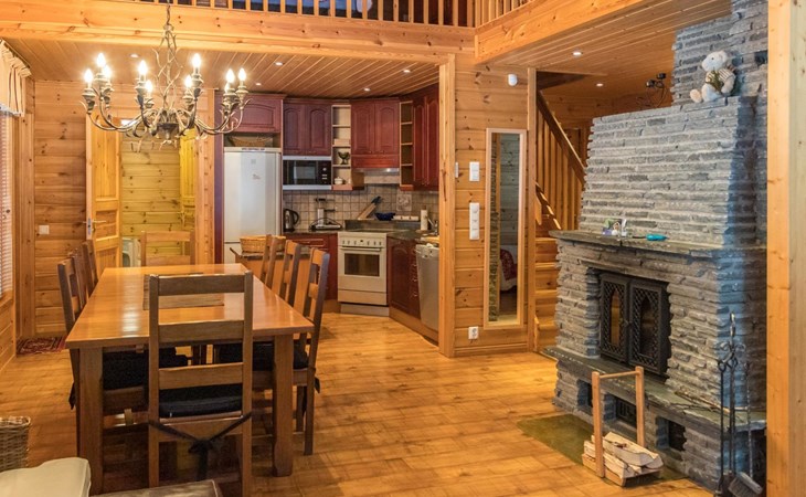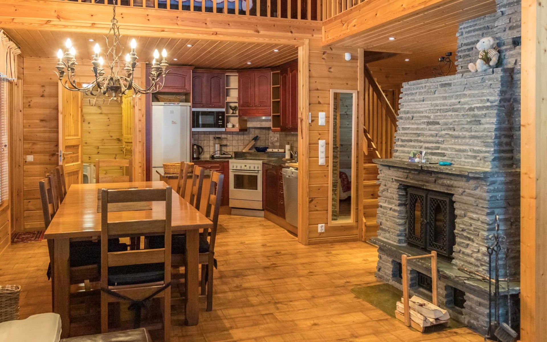 The apartment is beautifully decorated and has a fully equipped kitchen with plenty of cupboard space and high-quality crockery. The spacious and atmospheric living room has a fireplace. A fast internet connection and a workstation on the screen enable, for example, remote working.
