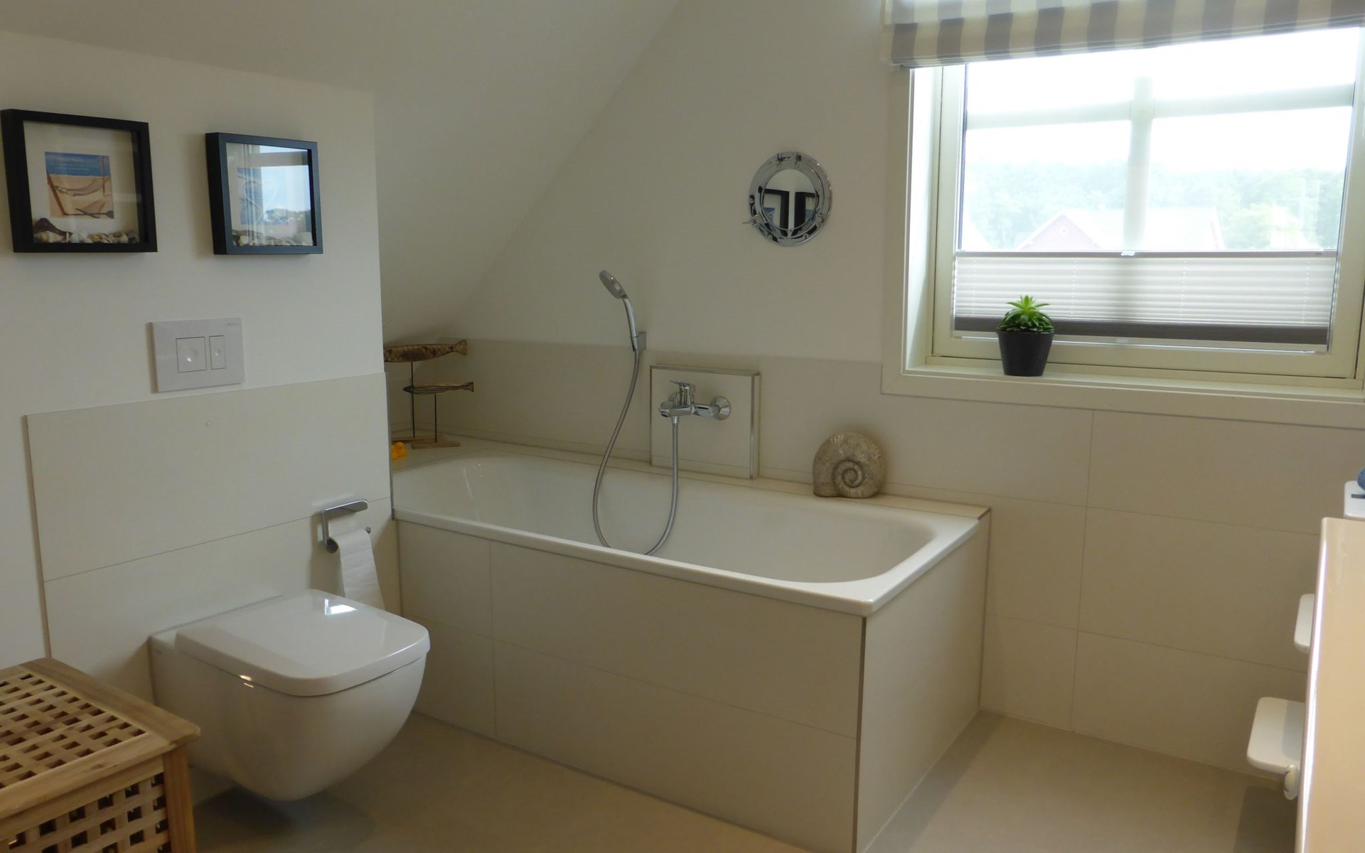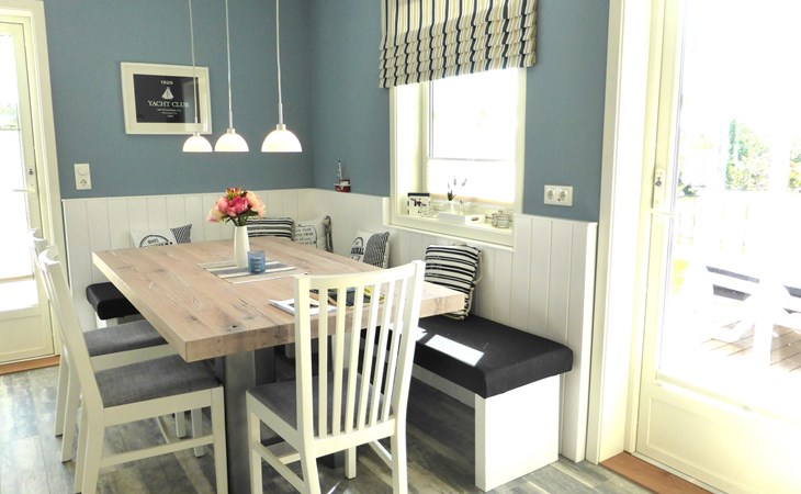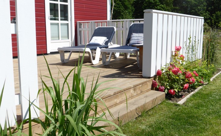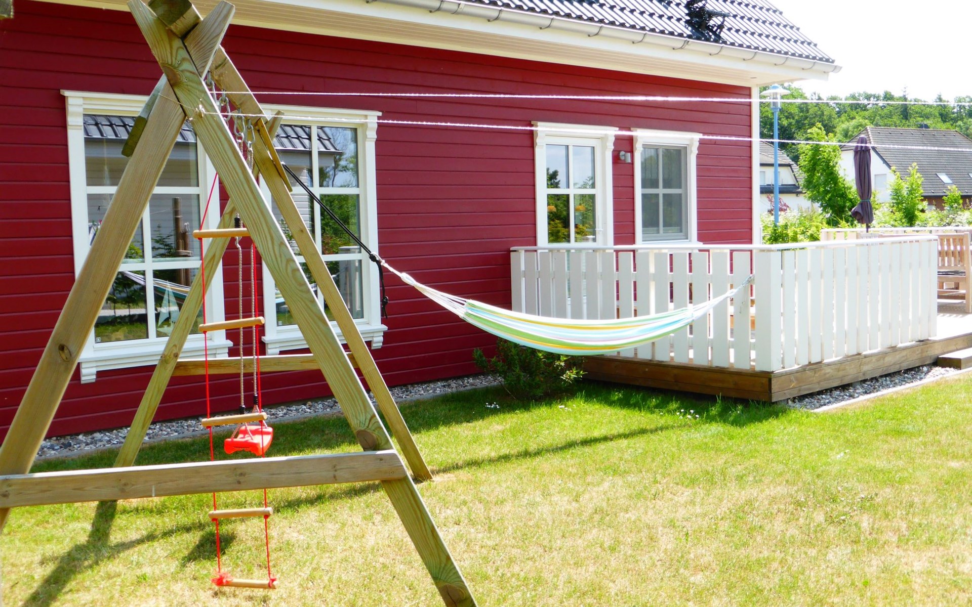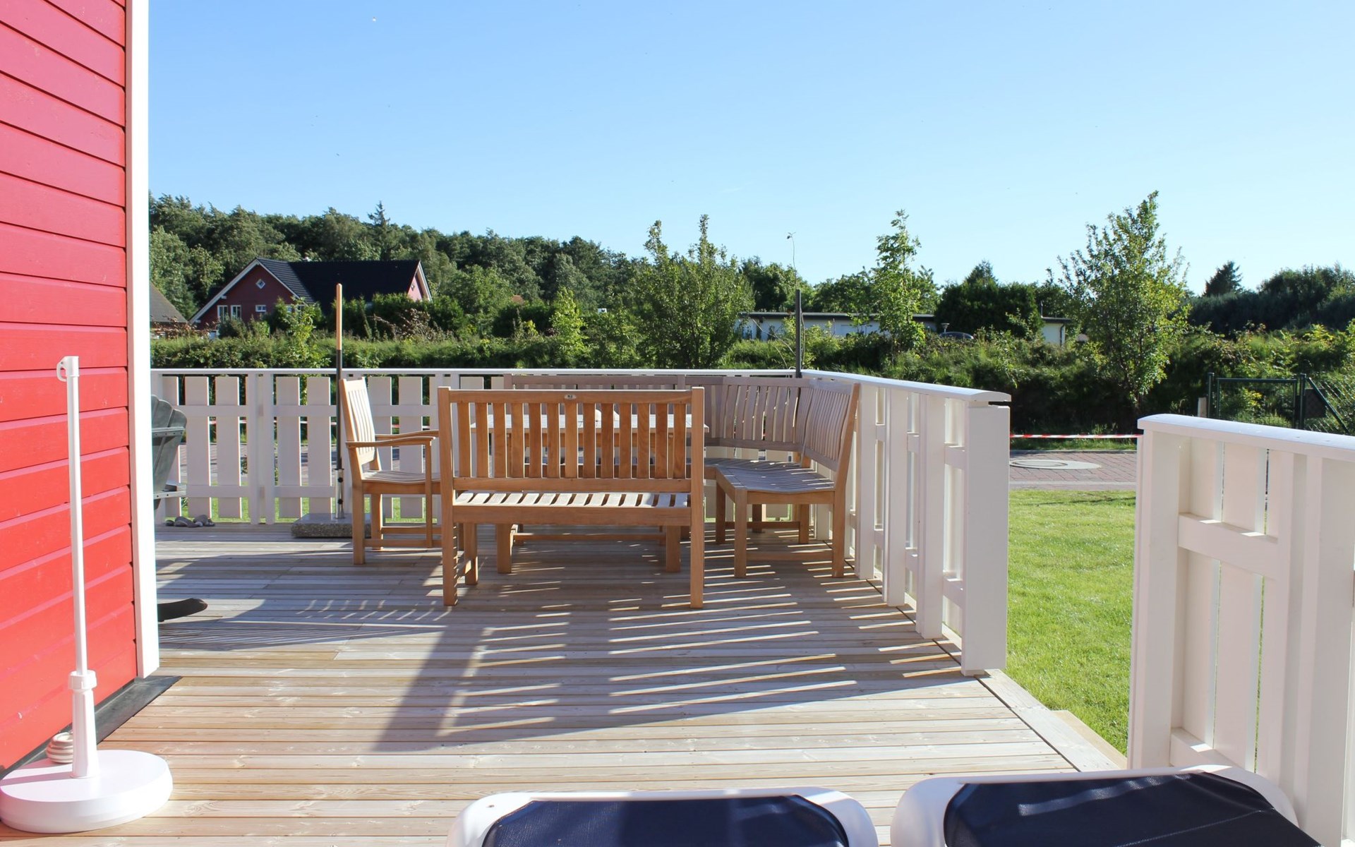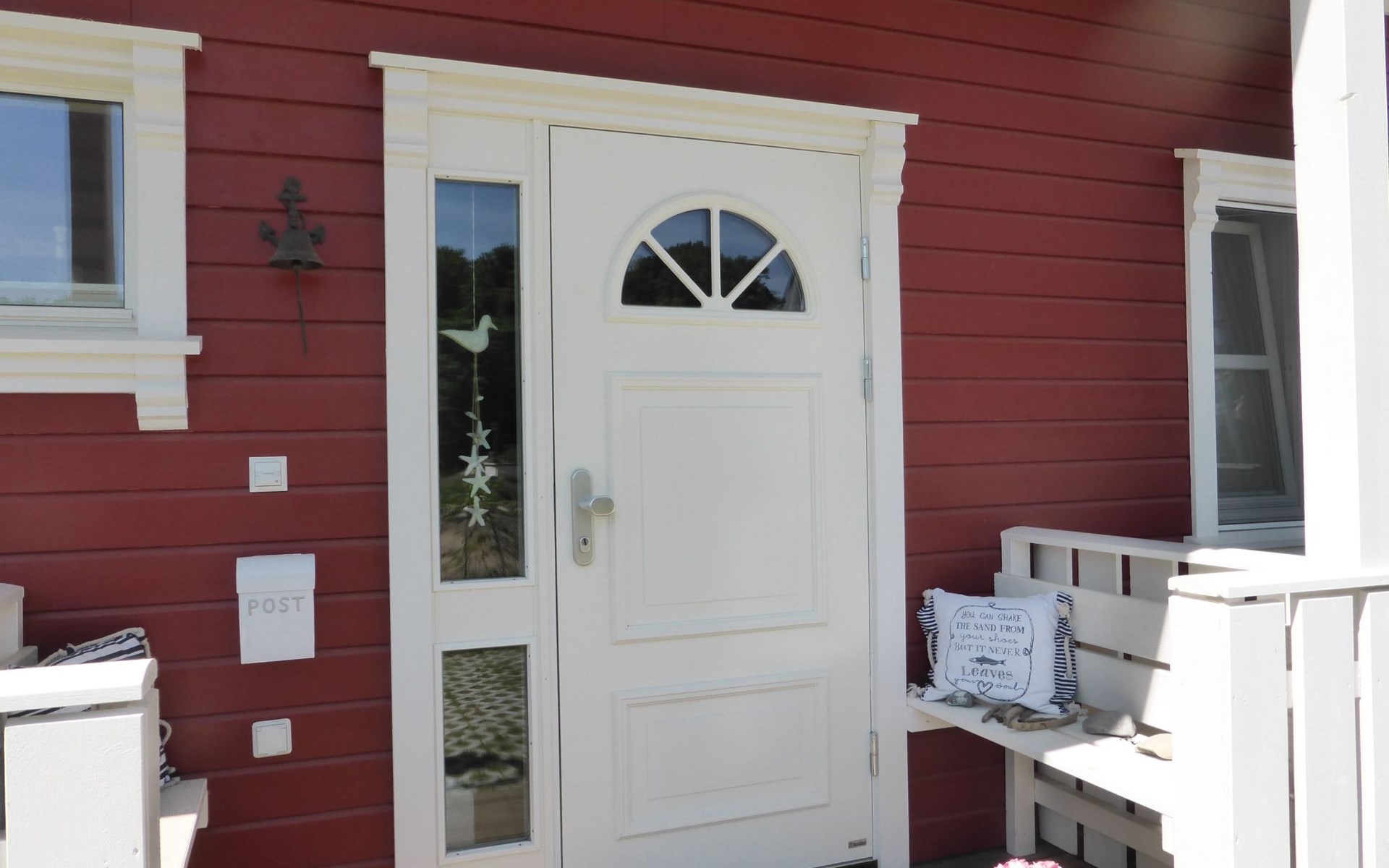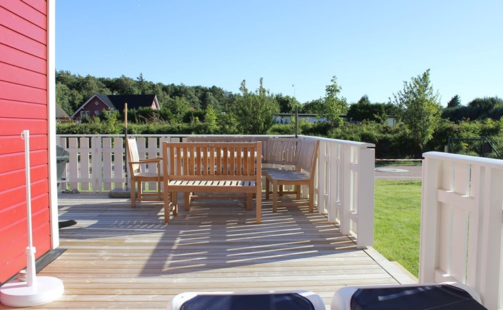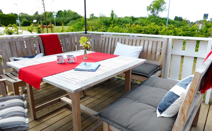 The fully enclosed outdoor area includes a ca. 50m² wooden terrace with seating and a garden for your own exclusive use. There is a wooden table on the terrace with a corner bench and chairs, four loungers, two parasols and a hammock. A children’s swing, a children’s bench and bicycle stands round off the child-friendly facilities. There is a grill in the garden for leisurely grill evenings. The ca. 500m² site has a lockable garden shed with a hand cart and beach toys. There are three private outdoor car parking spaces.