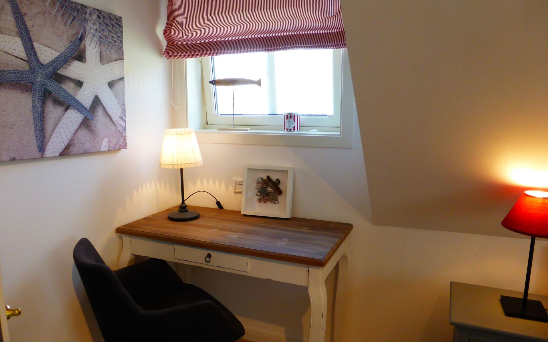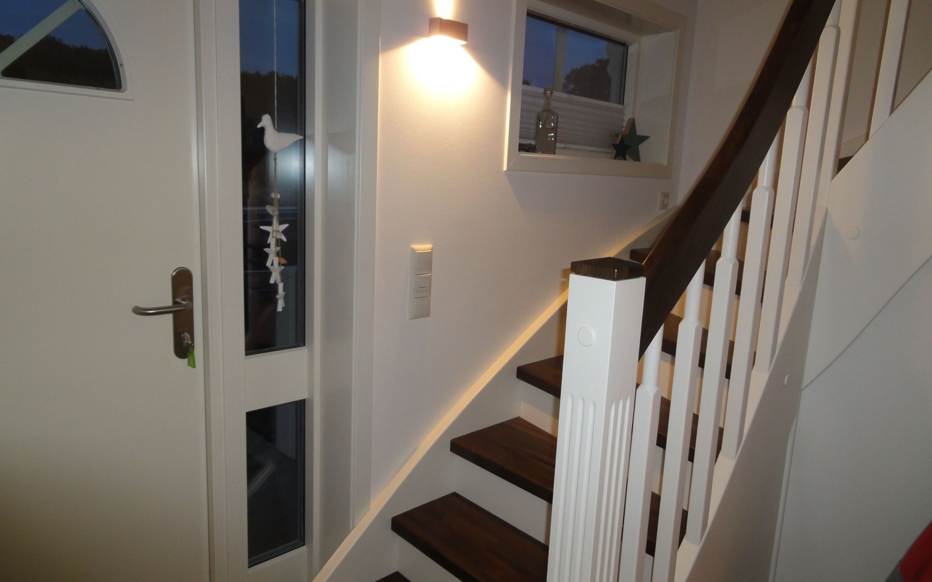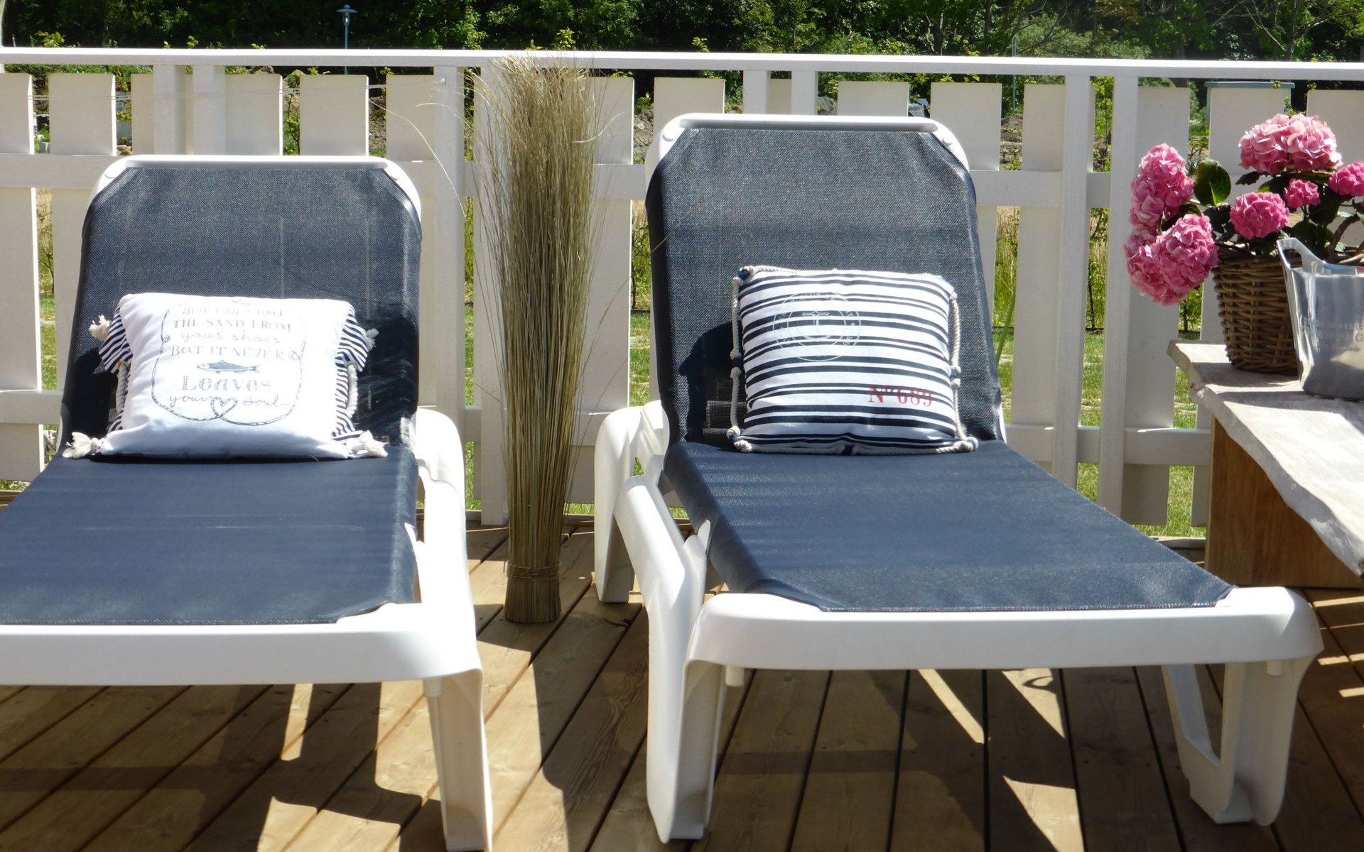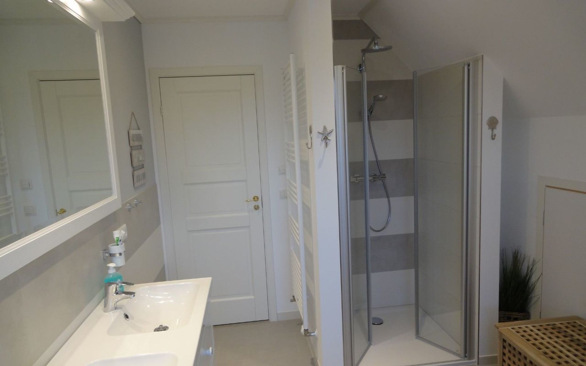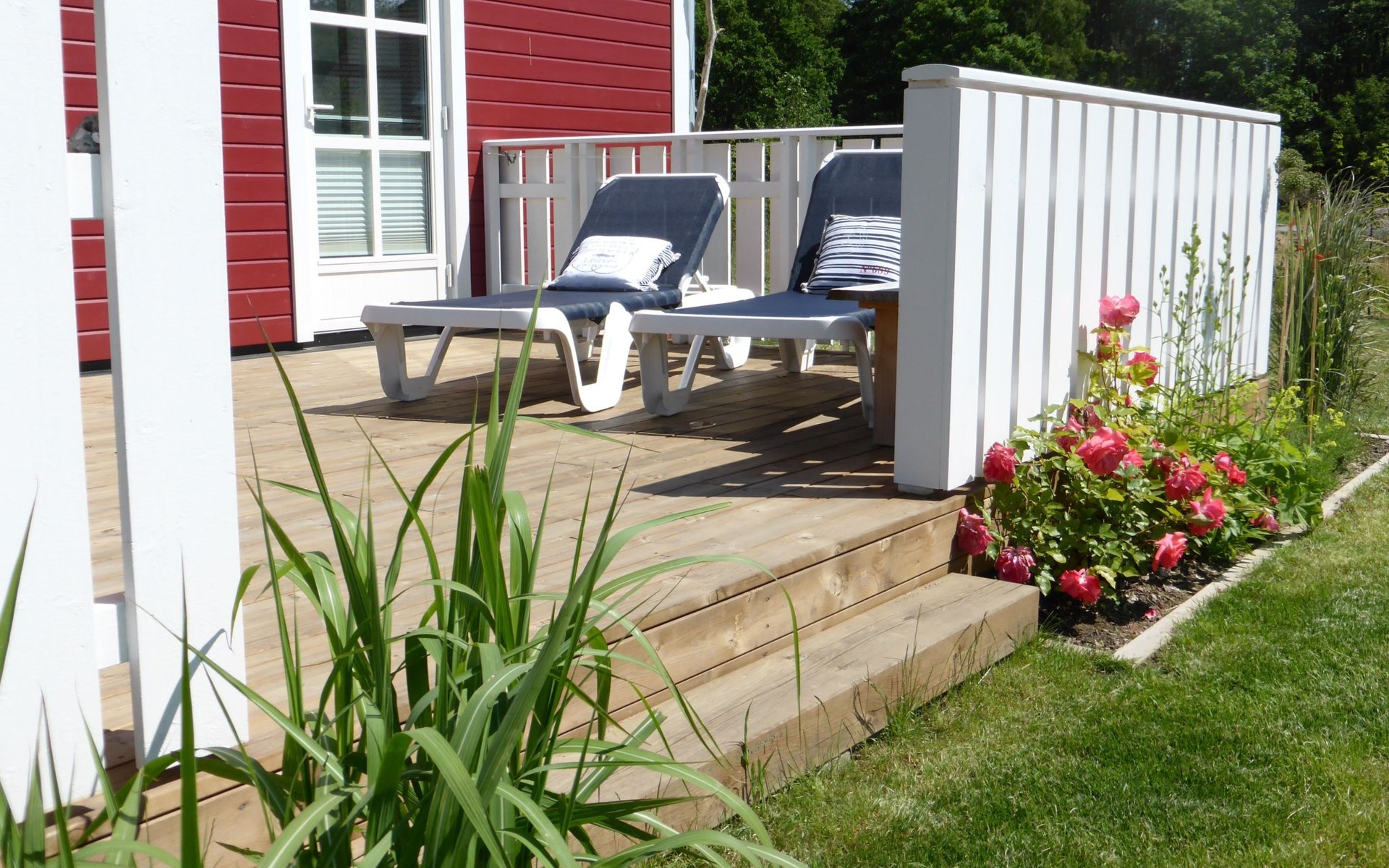 The fully enclosed outdoor area includes a ca. 50m² wooden terrace with seating and a garden for your own exclusive use. There is a wooden table on the terrace with a corner bench and chairs, four loungers, two parasols and a hammock. A children’s swing, a children’s bench and bicycle stands round off the child-friendly facilities. There is a grill in the garden for leisurely grill evenings. The ca. 500m² site has a lockable garden shed with a hand cart and beach toys. There are three private outdoor car parking spaces.