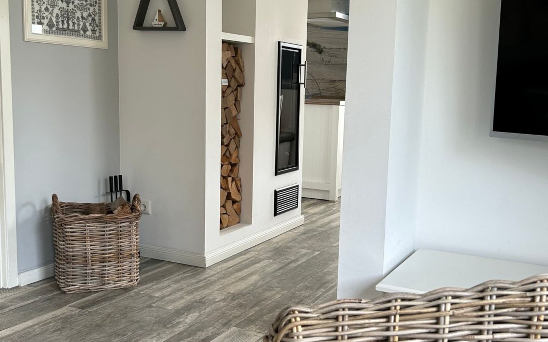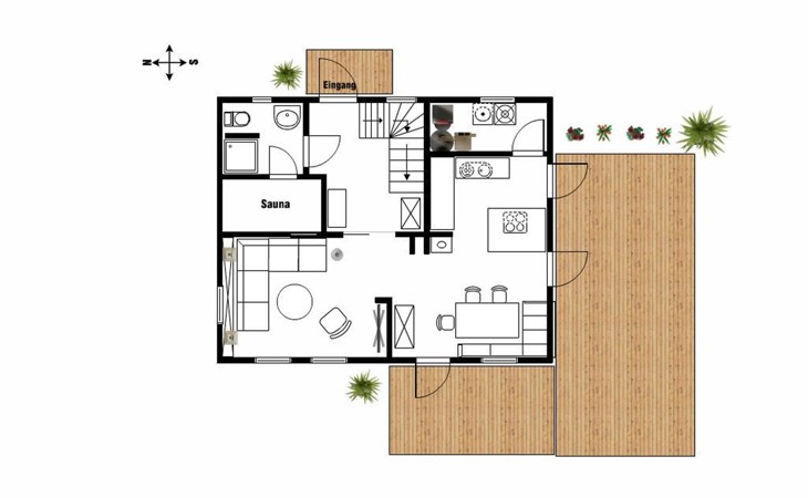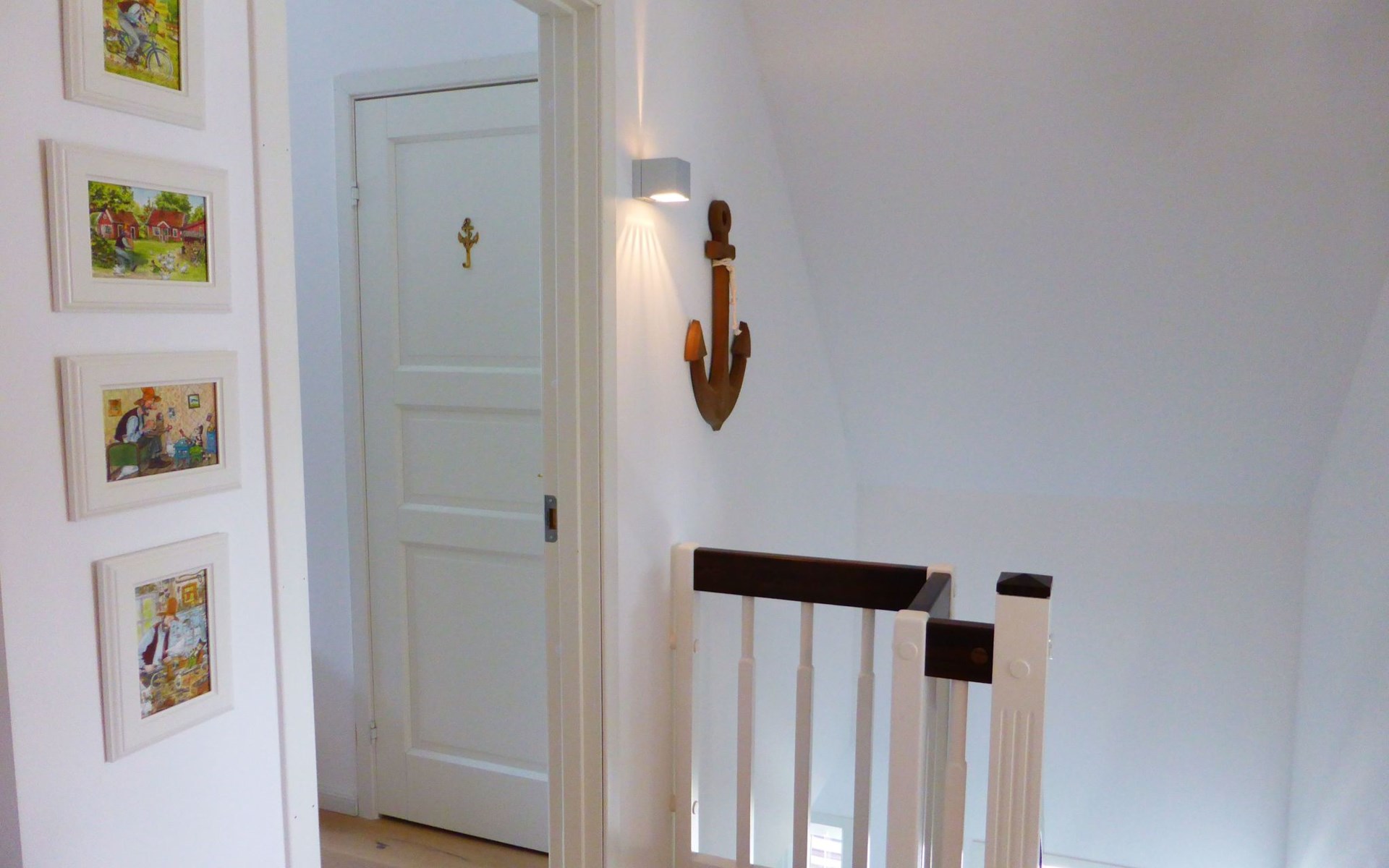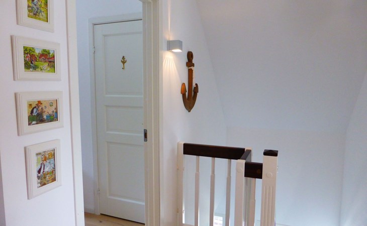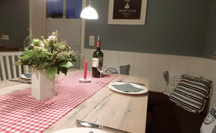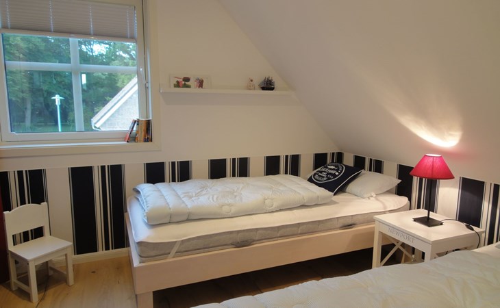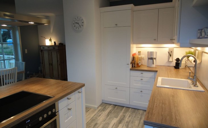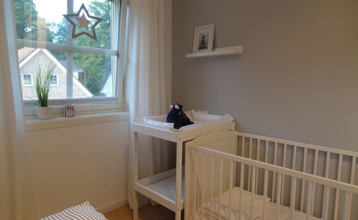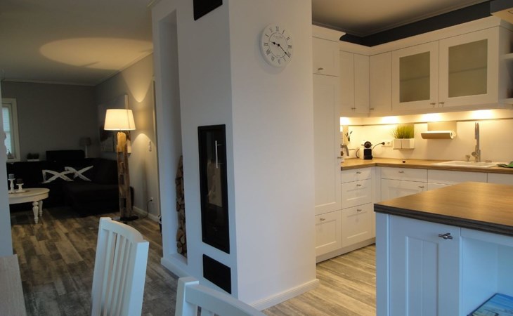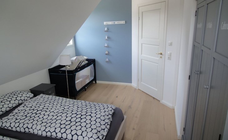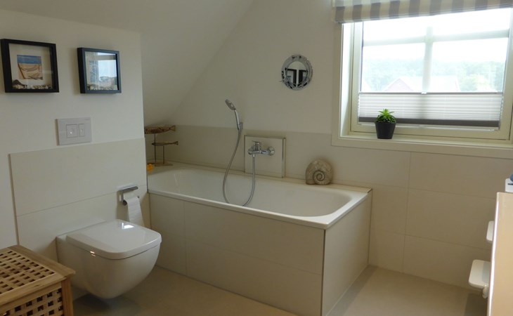 The comfortable holiday house in a Scandinavian style provides around 120m² of living space, spread over two fully-heated floors. The underfloor heating installed throughout exudes a cosy atmosphere. The ground floor has a fully-equipped kitchen with a cooking island, an adjoining generous living and dining room with a fireplace stove and modern electronics. A waffle maker and a raclette grill round off the modern built-in kitchen. Firewood for using the fireplace can be booked in addition for a fee or be purchased locally. The ground floor has a bathroom with a shower, washbasin and toilet. A sauna can be used free of charge, adjoining the bathroom. The upper floor comprises three individually furnished bedrooms and a further bathroom with a shower, bath, double washbasin, hairdryer and toilet. Two bedrooms are each furnished with a double bed (180cm wide) and a child’s bed. One of them has a cot (60 x 120cm), the other a children’s travel bed (65 x 125cm). The third bedroom has two single beds (90cm wide). The property has a child-friendly interior and has a selection of children’s toys and a safety gate on the stairs, as well as two highchairs for use free of charge. The laundry room has a washing machine and dryer for use free of charge, along with an ironing board, an iron and a vacuum cleaner.