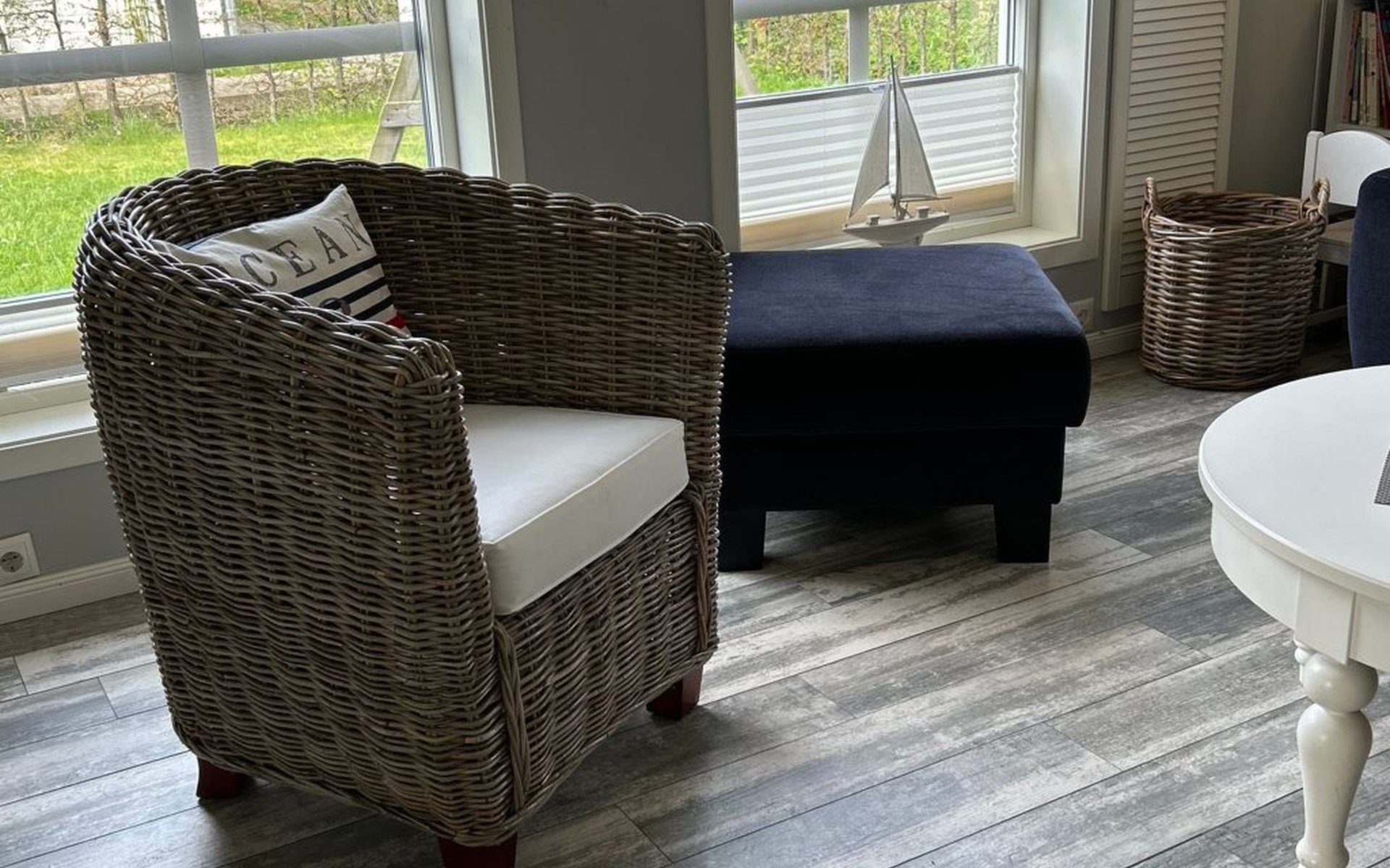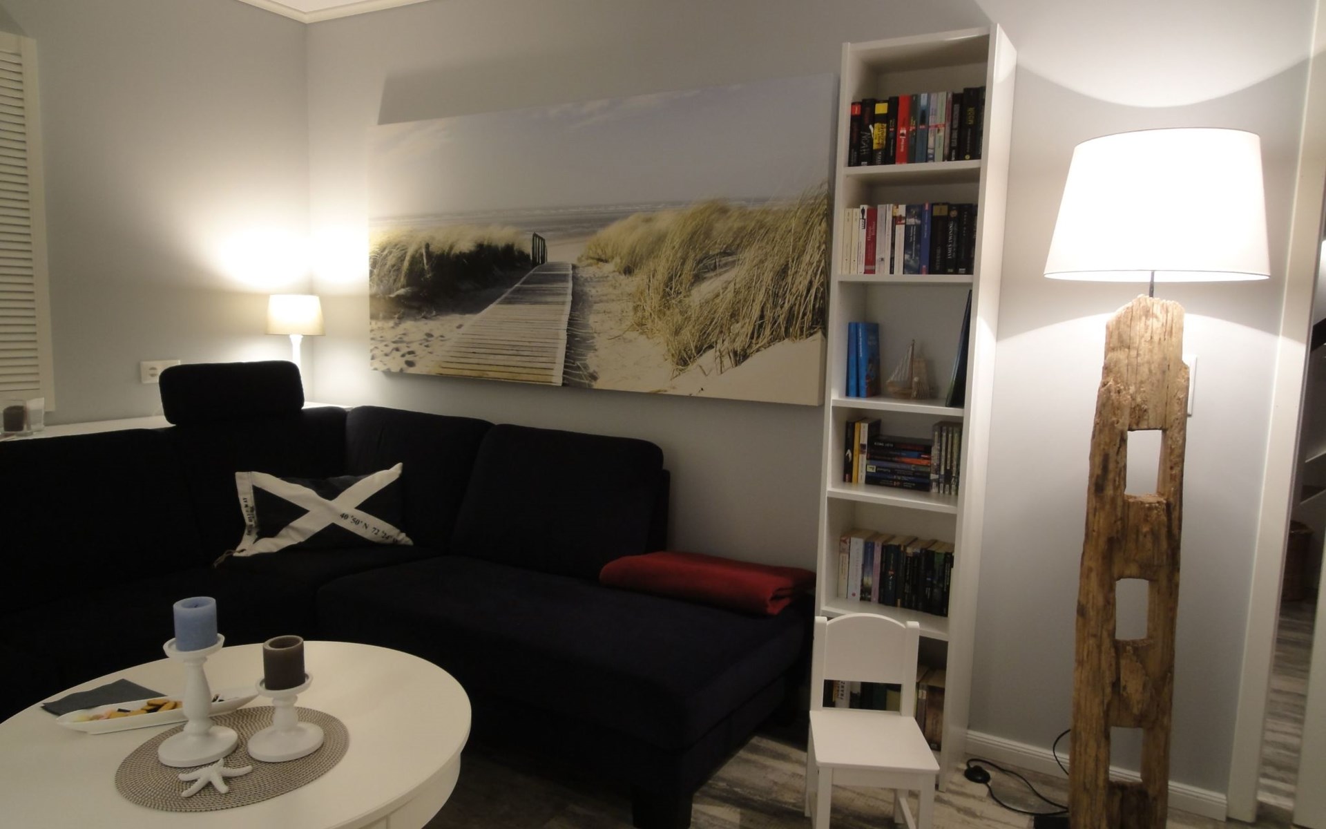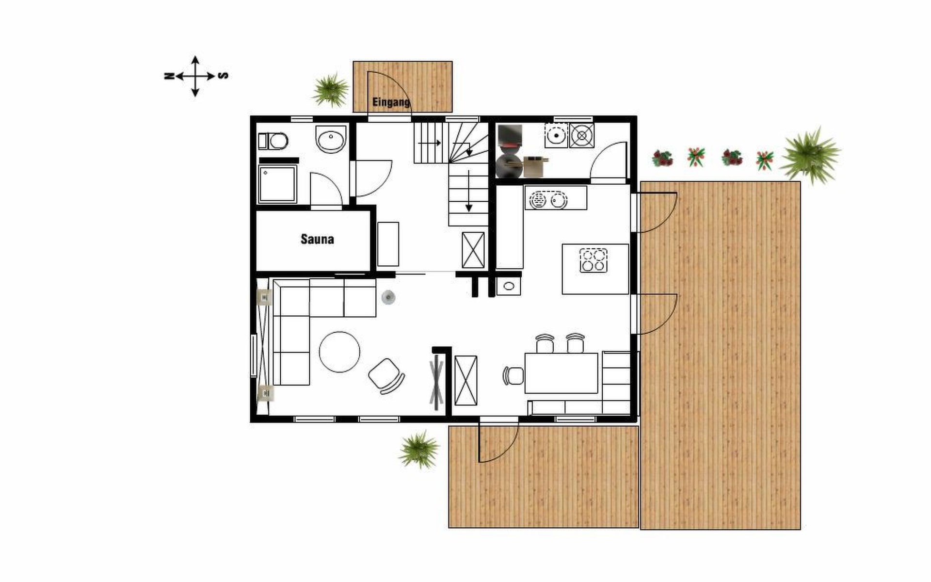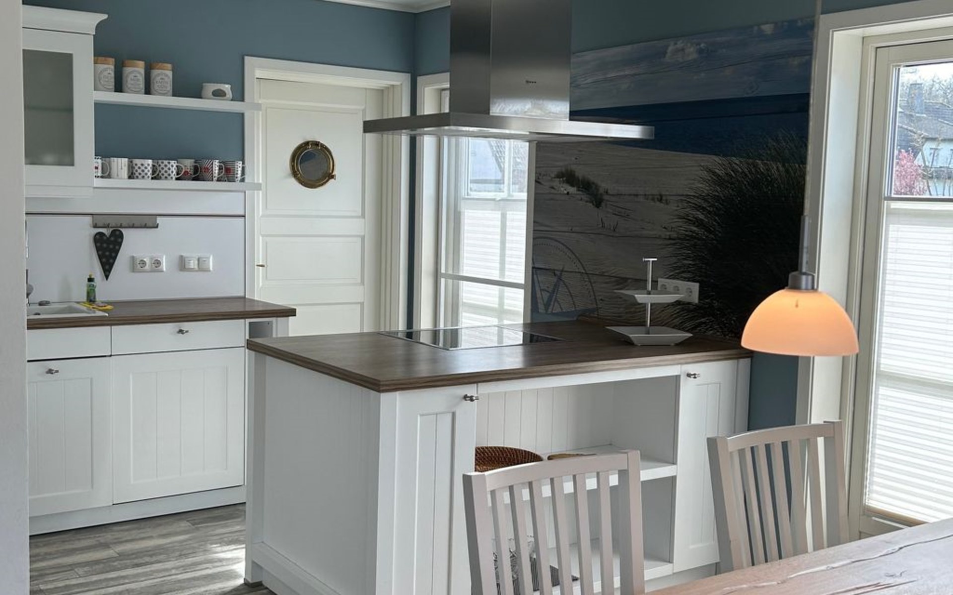 The comfortable holiday house in a Scandinavian style provides around 120m² of living space, spread over two fully-heated floors. The underfloor heating installed throughout exudes a cosy atmosphere. The ground floor has a fully-equipped kitchen with a cooking island, an adjoining generous living and dining room with a fireplace stove and modern electronics. A waffle maker and a raclette grill round off the modern built-in kitchen. Firewood for using the fireplace can be booked in addition for a fee or be purchased locally. The ground floor has a bathroom with a shower, washbasin and toilet. A sauna can be used free of charge, adjoining the bathroom. The upper floor comprises three individually furnished bedrooms and a further bathroom with a shower, bath, double washbasin, hairdryer and toilet. Two bedrooms are each furnished with a double bed (180cm wide) and a child’s bed. One of them has a cot (60 x 120cm), the other a children’s travel bed (65 x 125cm). The third bedroom has two single beds (90cm wide). The property has a child-friendly interior and has a selection of children’s toys and a safety gate on the stairs, as well as two highchairs for use free of charge. The laundry room has a washing machine and dryer for use free of charge, along with an ironing board, an iron and a vacuum cleaner.