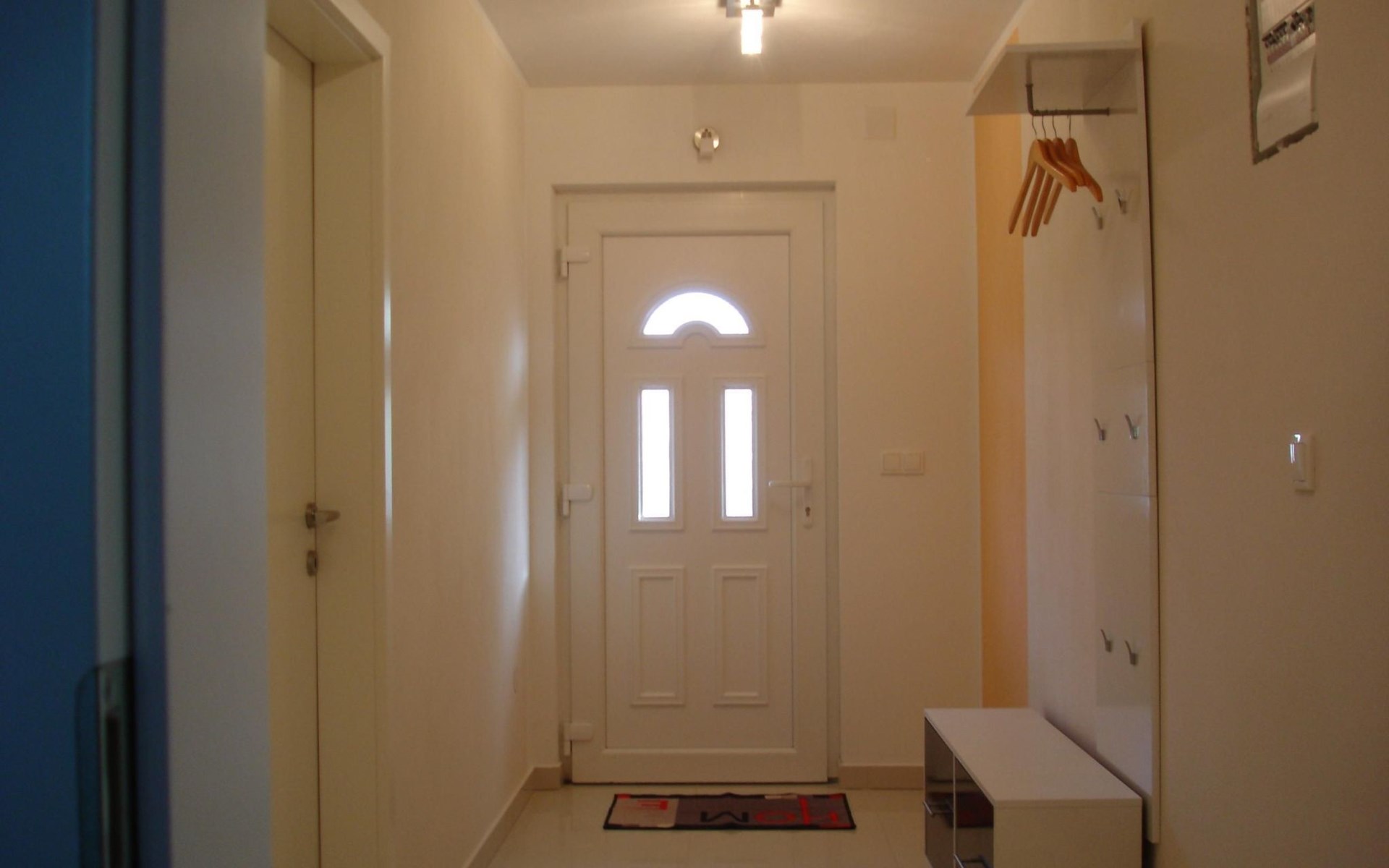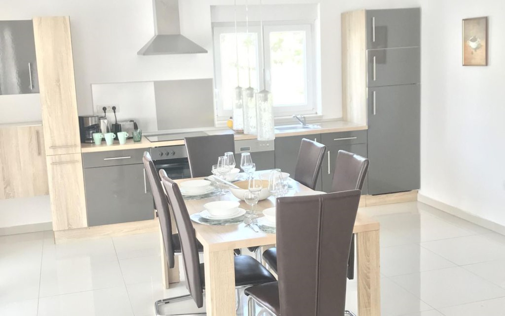 The house built in 2013 provides beds for up to six people and also has two supplementary beds. The interior provides a total living space of around 100m². It has a generous living room with an open, modern kitchen with an oven, fridge with freezer compartment, dishwasher, toaster, coffee machine, electric pan and a full set of tableware, cutlery etc. for twelve people. Of the two bedrooms, one has a box spring bed (160 x 200cm) for two people, the other has two pull-out single beds (80 x 200cm). The modern bathroom has a shower and underfloor heating. The rooms are connected via a spacious hallway. Bed linen, hand towels and bath towels are provided, but not beach towels. The house is equipped with satellite TV, air conditioning, a dishwasher, a washing machine, a washing line, an iron and an ironing board. There is a central air conditioning unit in the middle of the living area, primarily in the living room, but if the bedroom doors are open then they can be cooled as well.