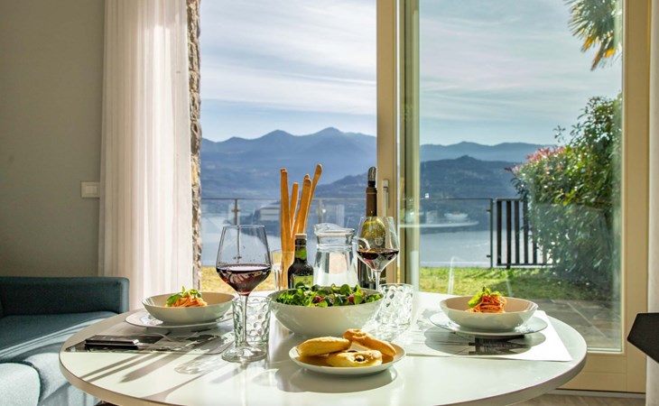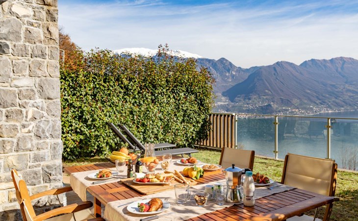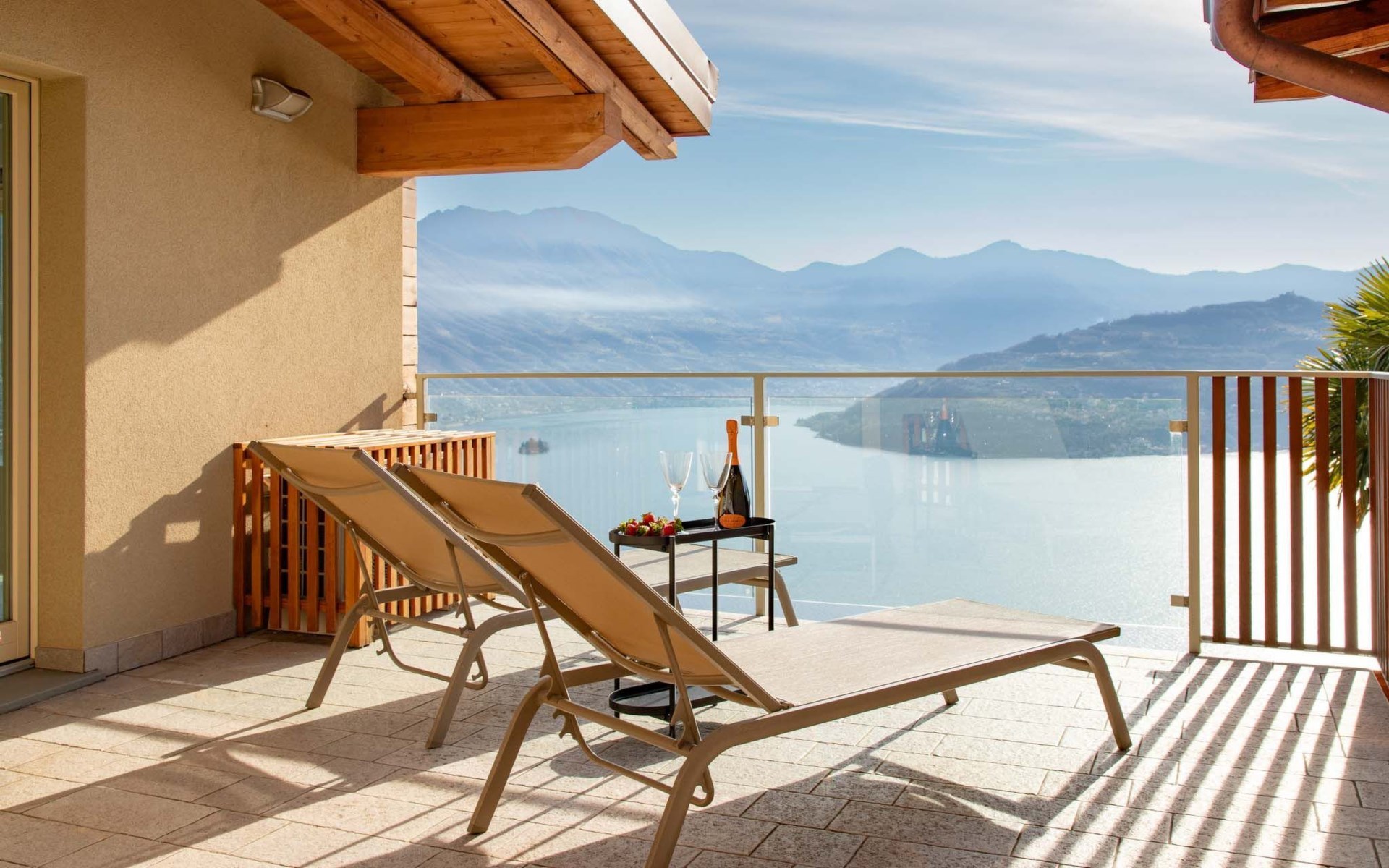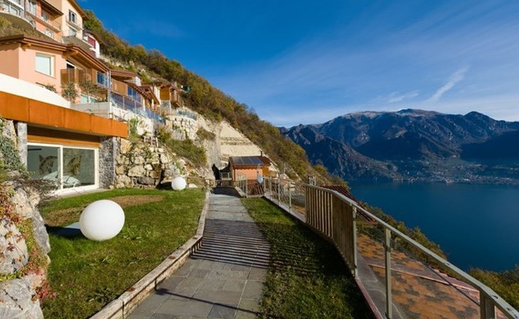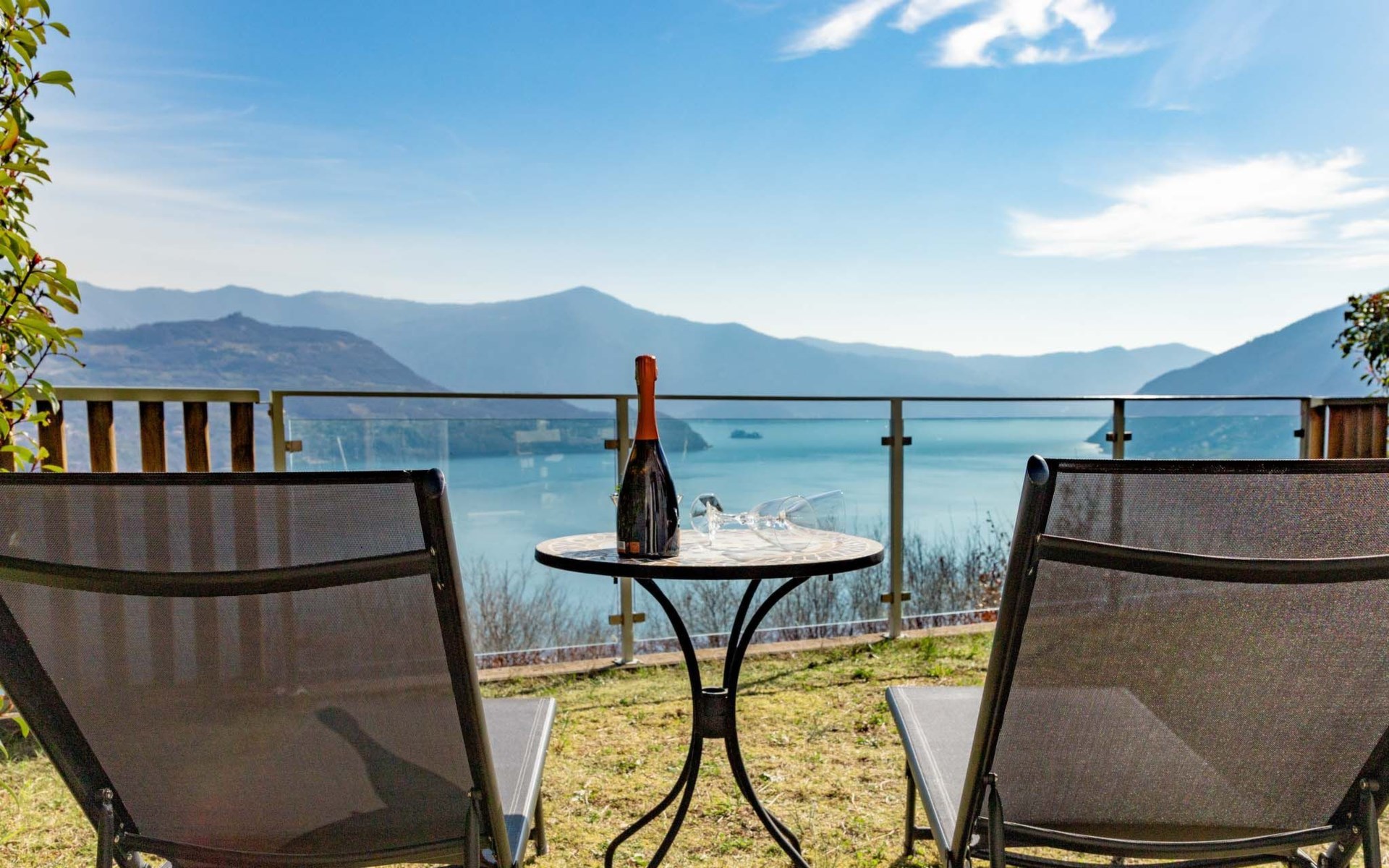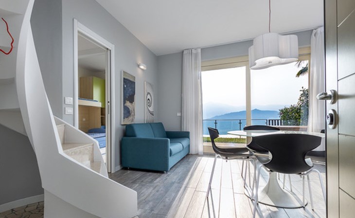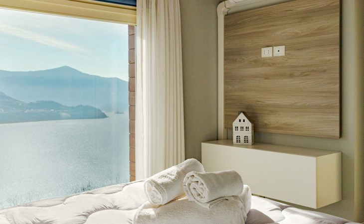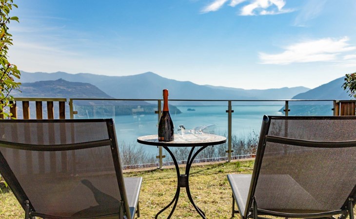 Arranged on two floors, the three-room apartment in a villa of over 60 square metres welcomes you with a very modern living room characterised by shades of black, white and blue, consisting of a table, sofa bed, corner kitchen with induction hobs, coffee maker and coffee machine with pods, kettle, dishwasher and oven. The double French window gives access to the large garden with an awning and glass parapets allowing an endless lake view. The floor is completed by the small bedroom and the bathroom with suspended sanitary fittings. The helicoidal staircase in cement and stone leads to the master bedroom, unique for the poetic view from the full-wall window, the exposed beams and the mirrored wardrobe that enlarges the available space; on the floor there is also the bathroom, also equipped with a bright full-wall window and an emotional shower, and the panoramic terrace with sun loungers, a true triumph of privacy and an apotheosis of emotion. There is unlimited Wi-Fi and a garage with lift to the floor.
