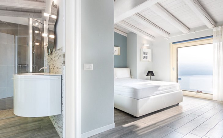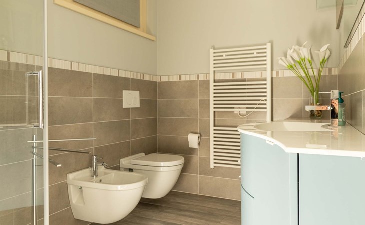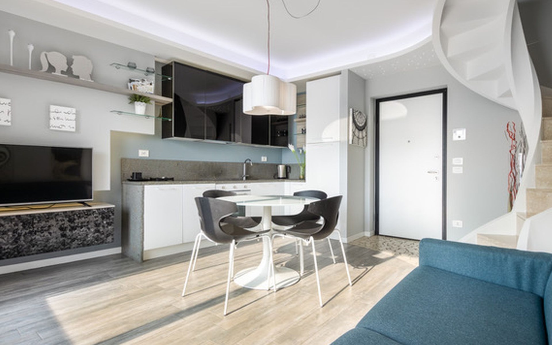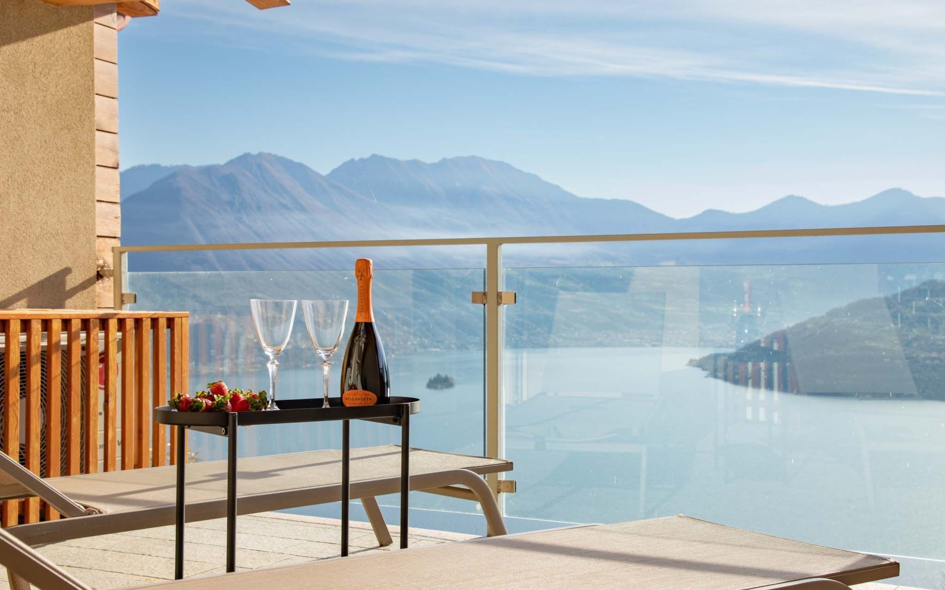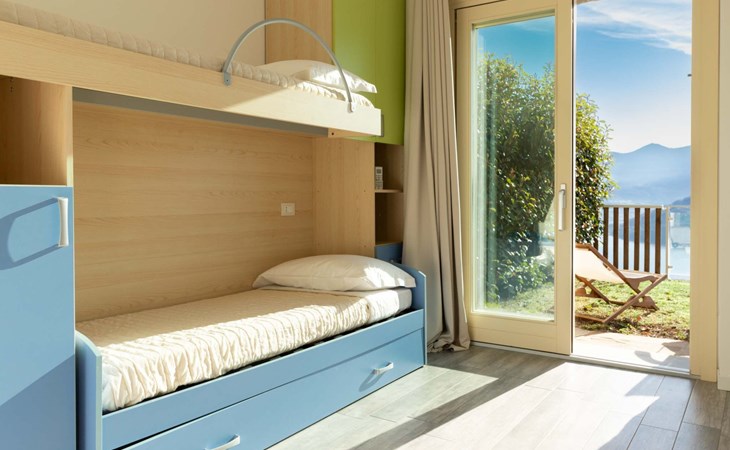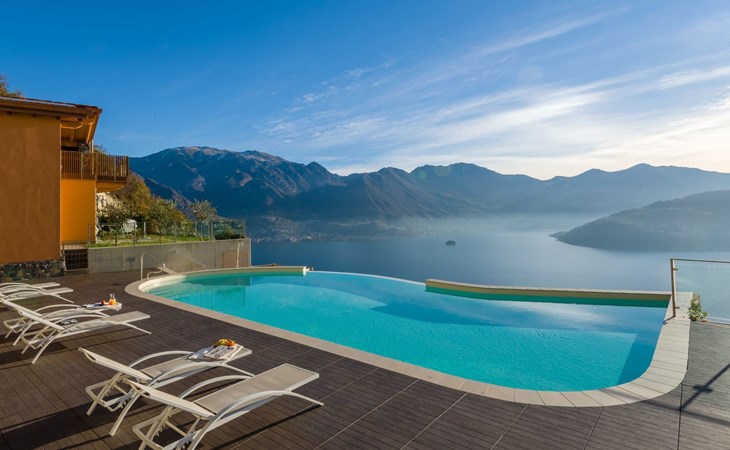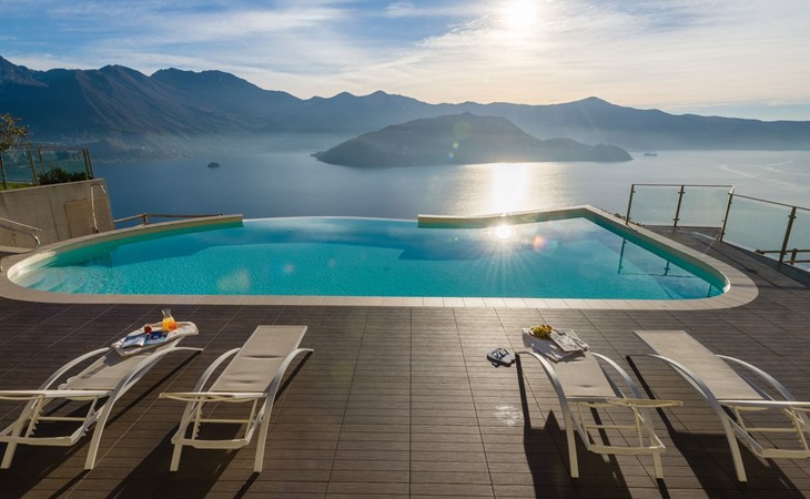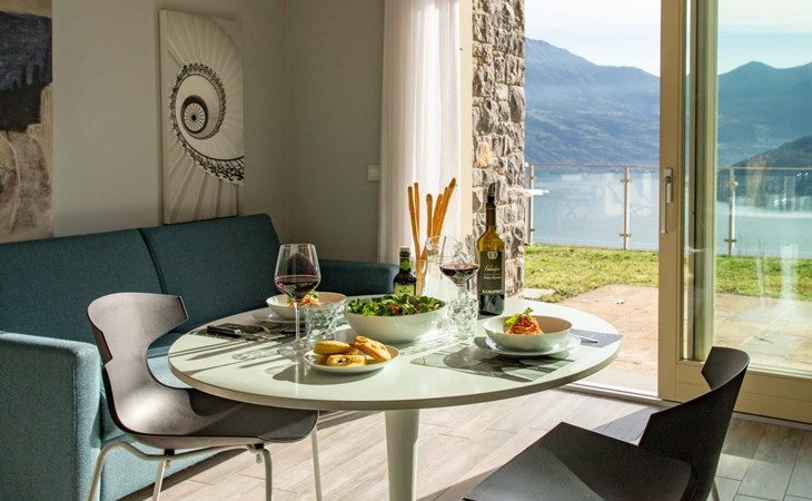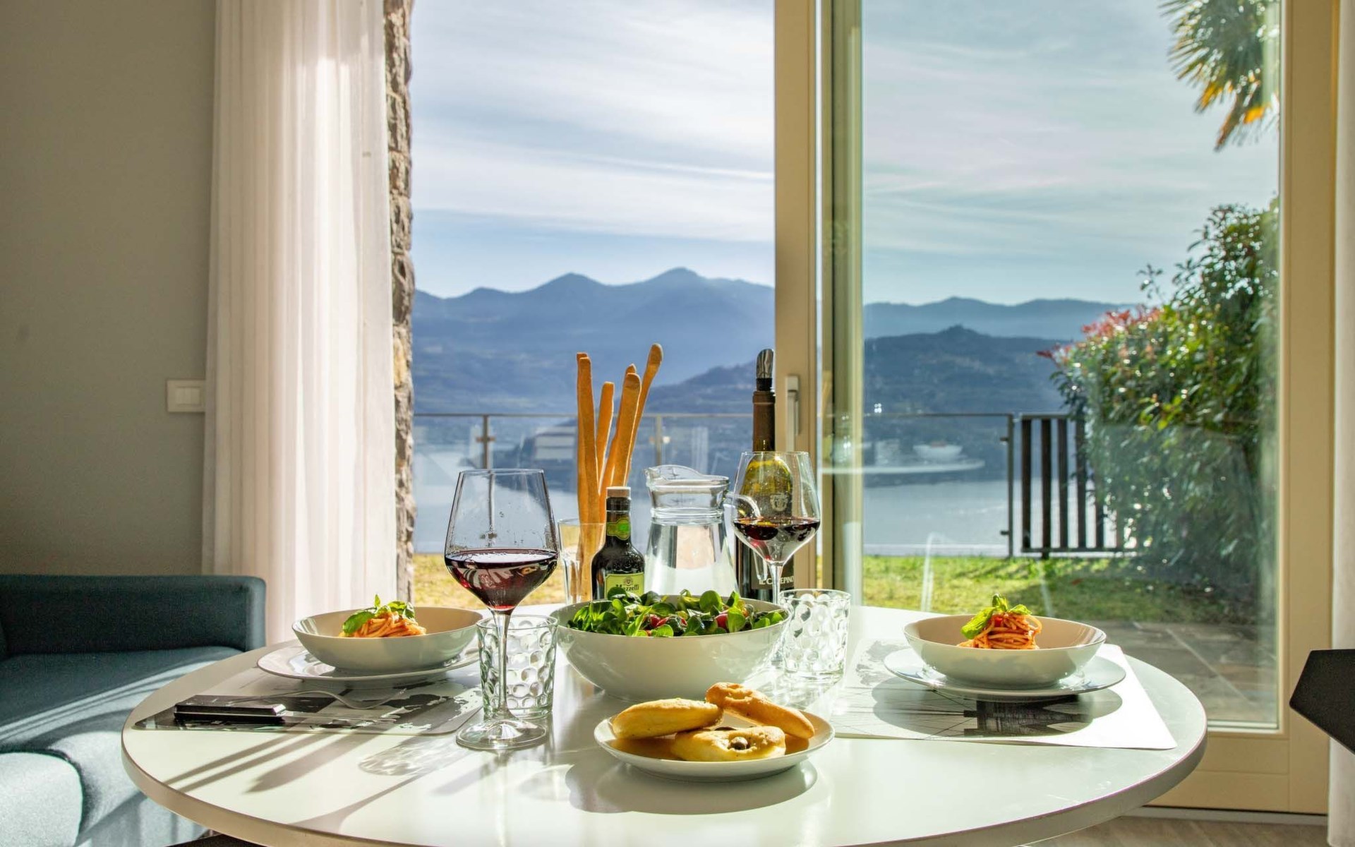 Arranged on two floors, the three-room apartment in a villa of over 60 square metres welcomes you with a very modern living room characterised by shades of black, white and blue, consisting of a table, sofa bed, corner kitchen with induction hobs, coffee maker and coffee machine with pods, kettle, dishwasher and oven. The double French window gives access to the large garden with an awning and glass parapets allowing an endless lake view. The floor is completed by the small bedroom and the bathroom with suspended sanitary fittings. The helicoidal staircase in cement and stone leads to the master bedroom, unique for the poetic view from the full-wall window, the exposed beams and the mirrored wardrobe that enlarges the available space; on the floor there is also the bathroom, also equipped with a bright full-wall window and an emotional shower, and the panoramic terrace with sun loungers, a true triumph of privacy and an apotheosis of emotion. There is unlimited Wi-Fi and a garage with lift to the floor.