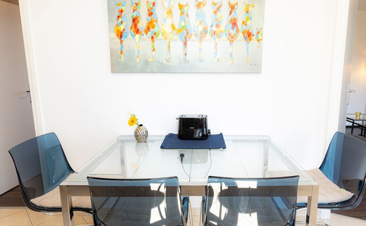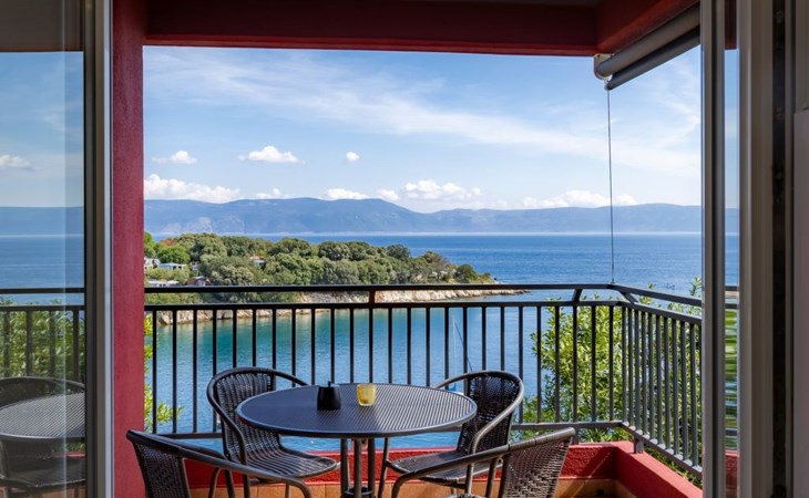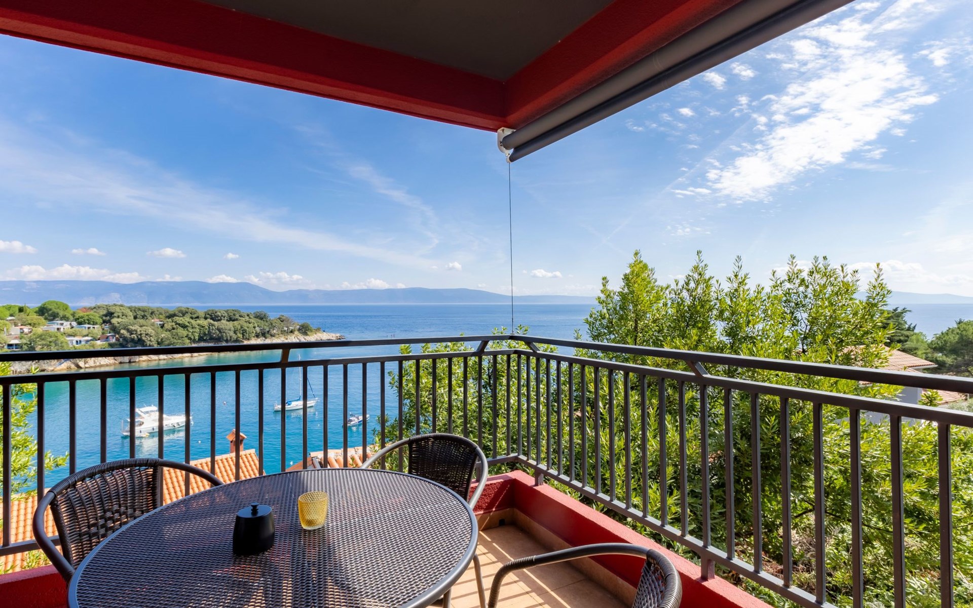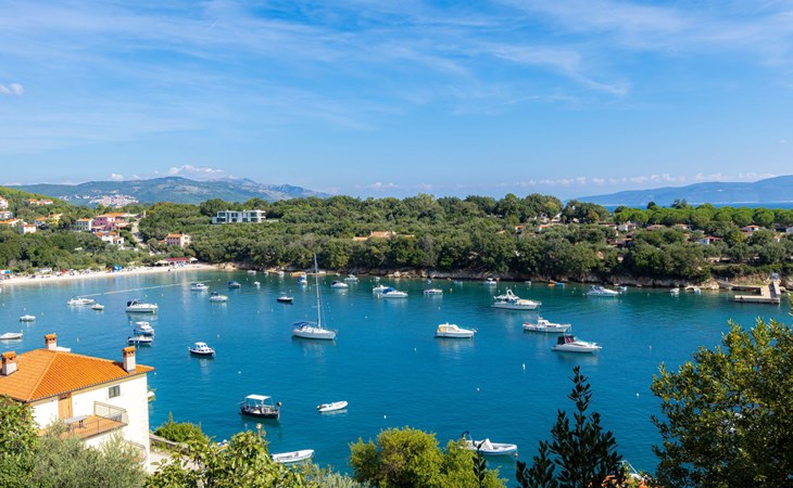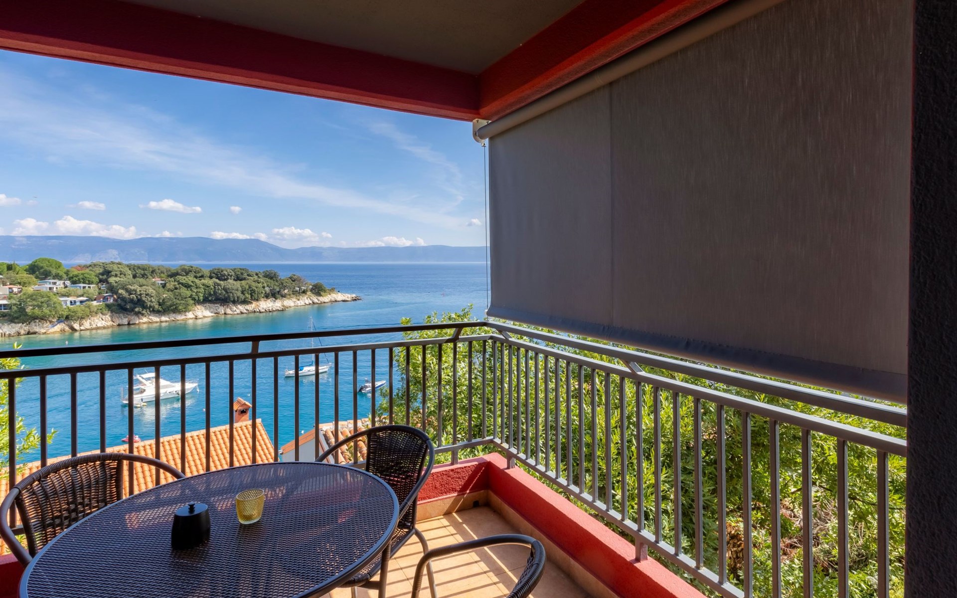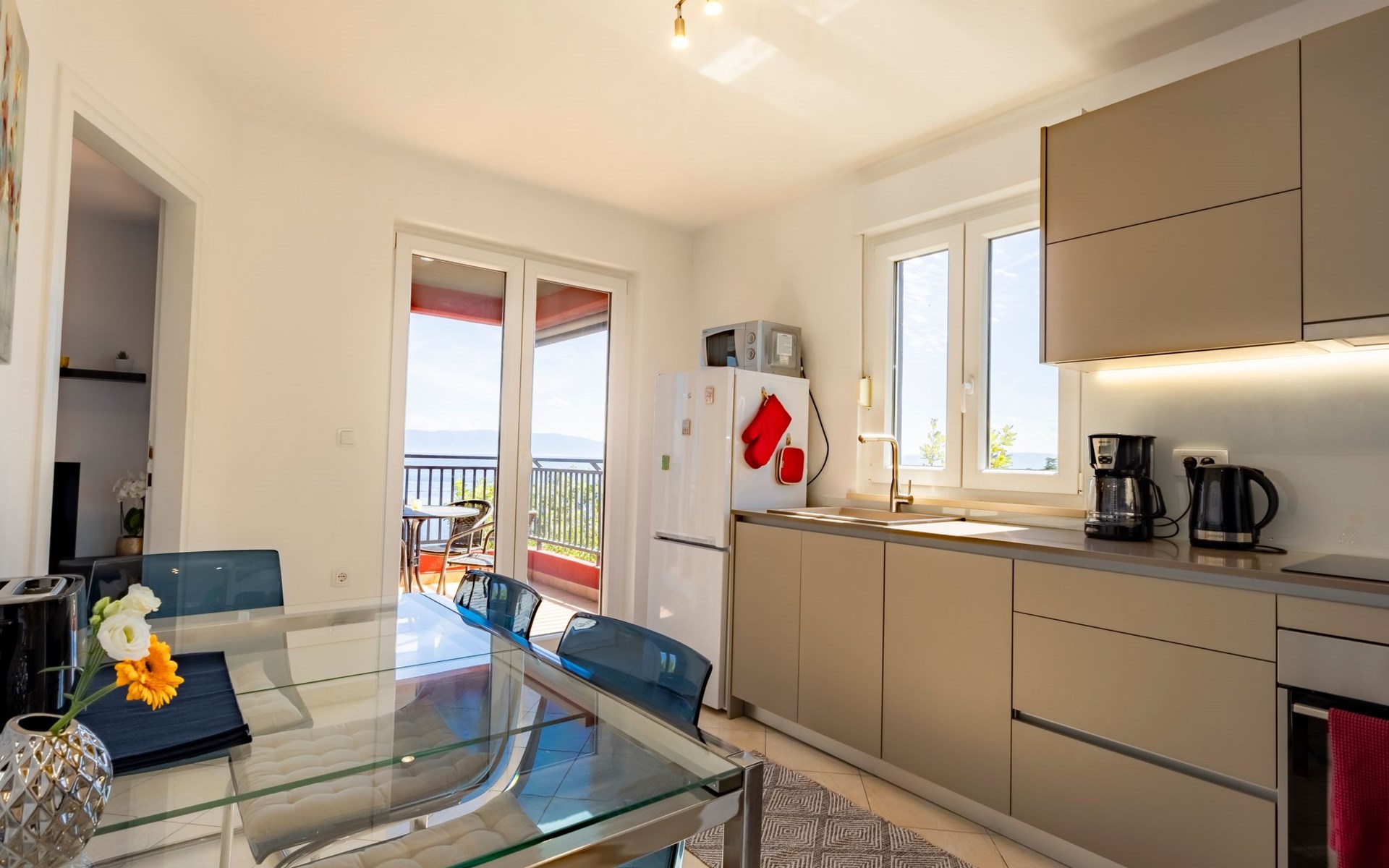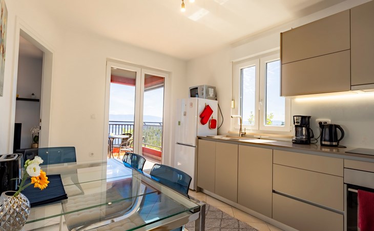 The open and modern kitchen is equipped with plenty of kitchen utensils, induction hob, oven, dishwasher, microwave and a fridge-freezer. For coffee lovers, there is a choice between a filter coffee machine and an espresso maker. There is a Smart TV in the living room. The balcony is accessible from both the kitchen and the living room. Here you can sit for hours and enjoy the marvellous view of the sea and the island of Cres. A sunshade provides the necessary shade on hot days as well as additional privacy.