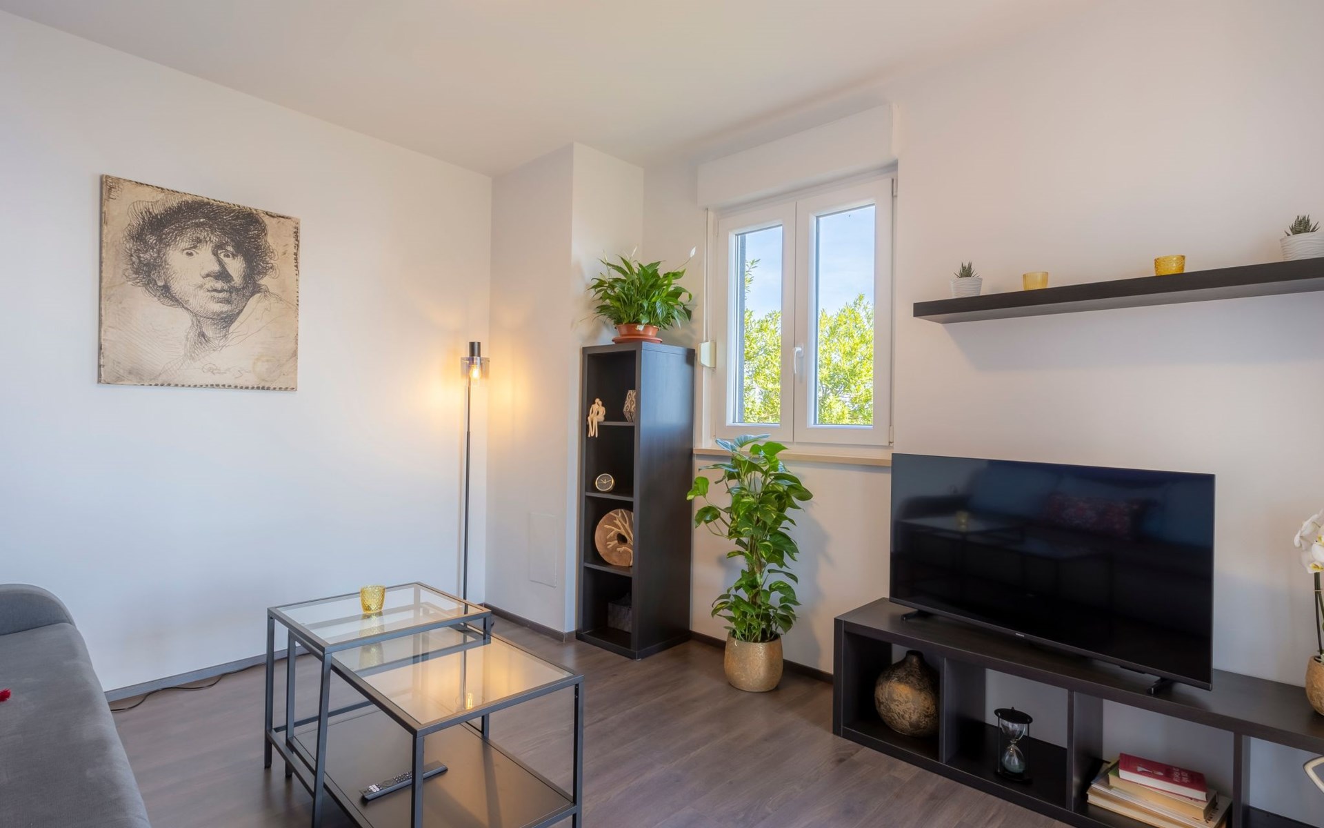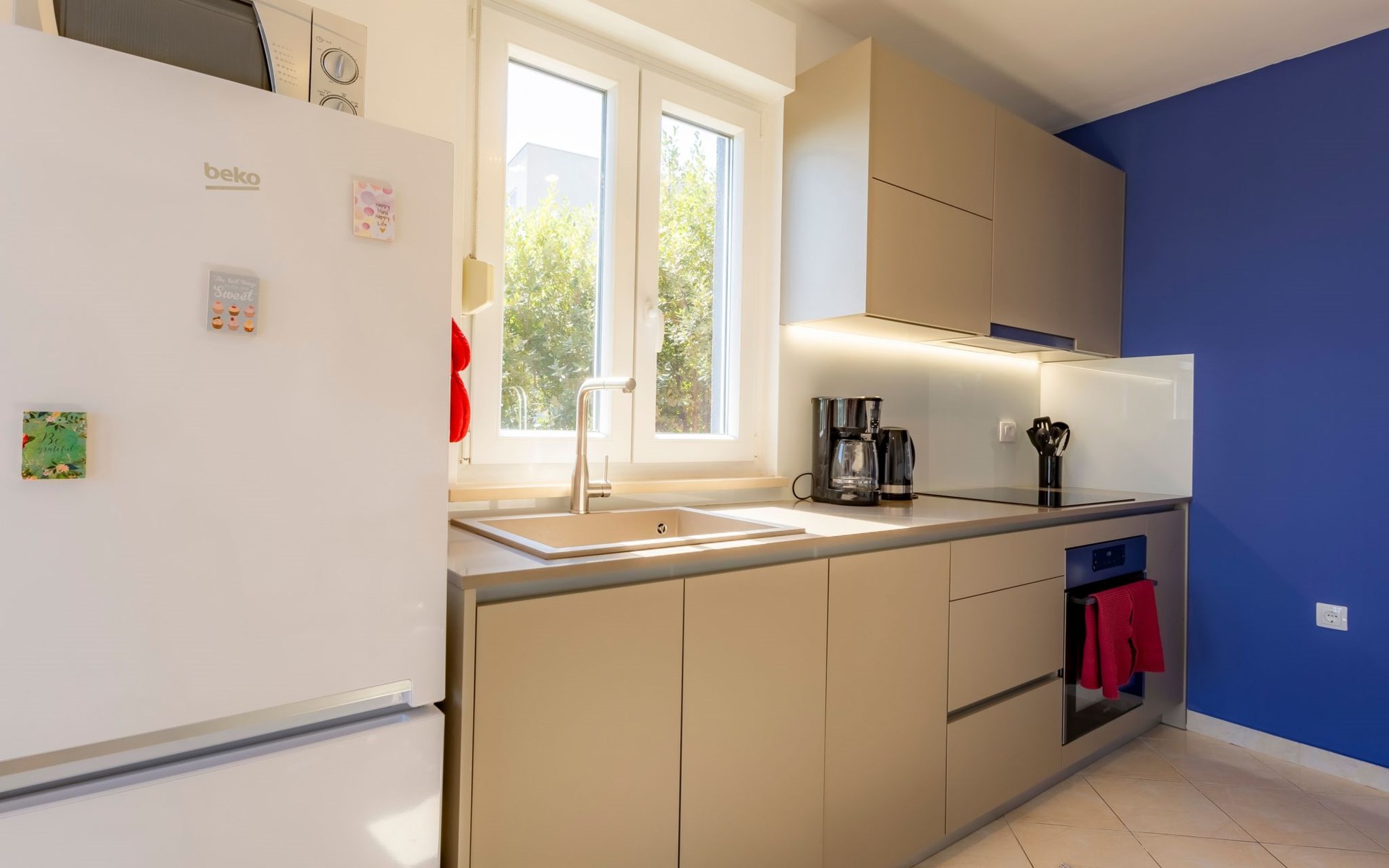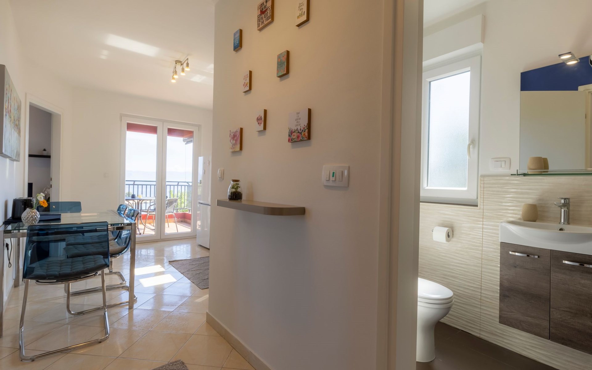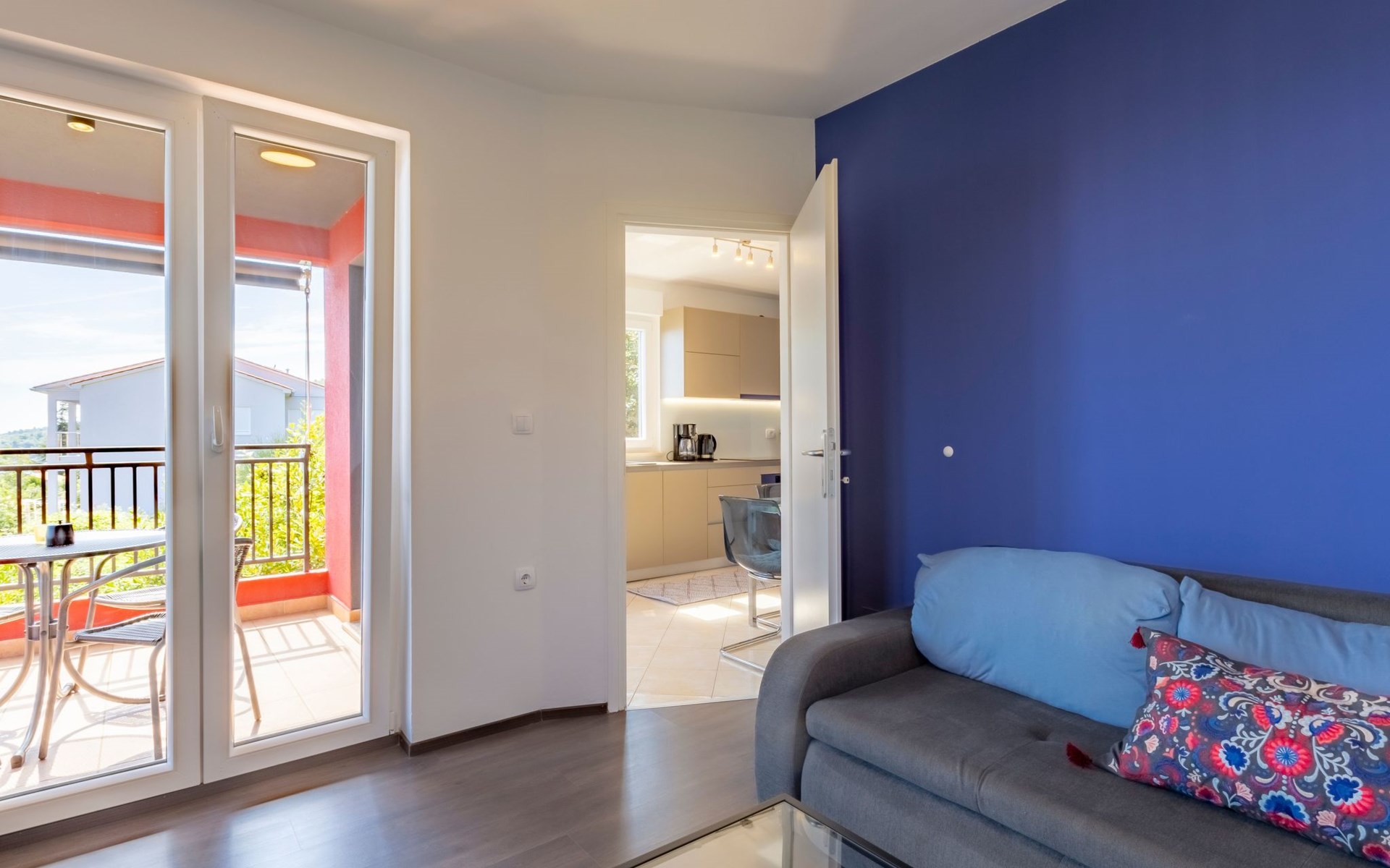 The open and modern kitchen is equipped with plenty of kitchen utensils, induction hob, oven, dishwasher, microwave and a fridge-freezer. For coffee lovers, there is a choice between a filter coffee machine and an espresso maker. There is a Smart TV in the living room. The balcony is accessible from both the kitchen and the living room. Here you can sit for hours and enjoy the marvellous view of the sea and the island of Cres. A sunshade provides the necessary shade on hot days as well as additional privacy.